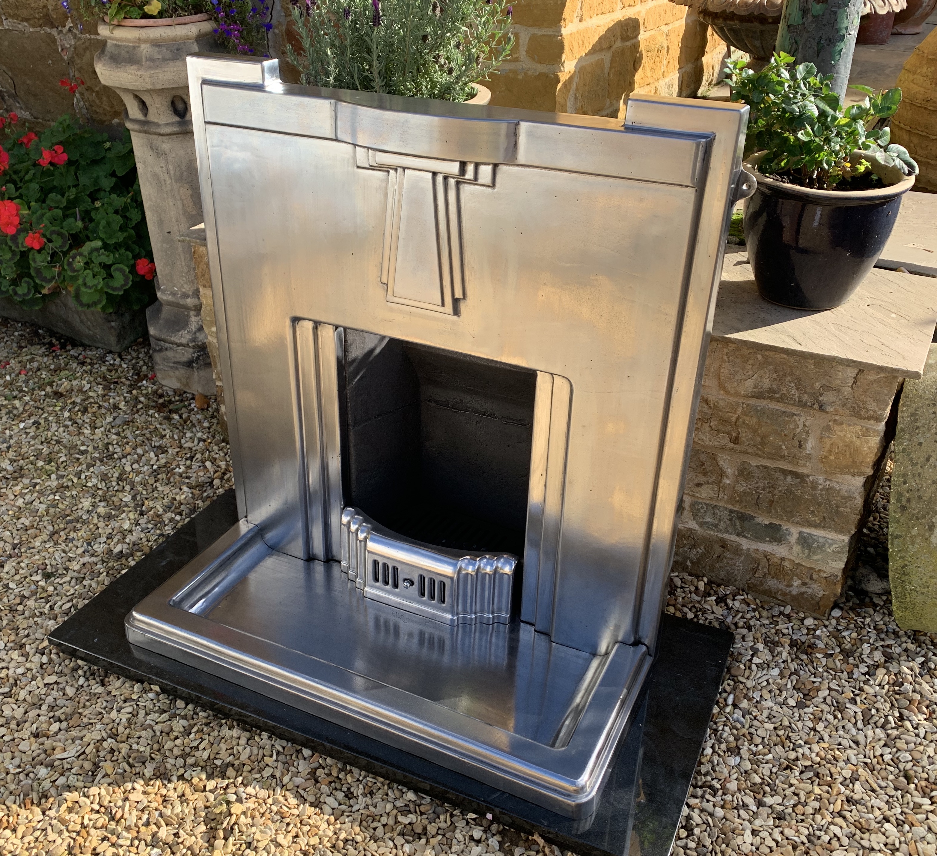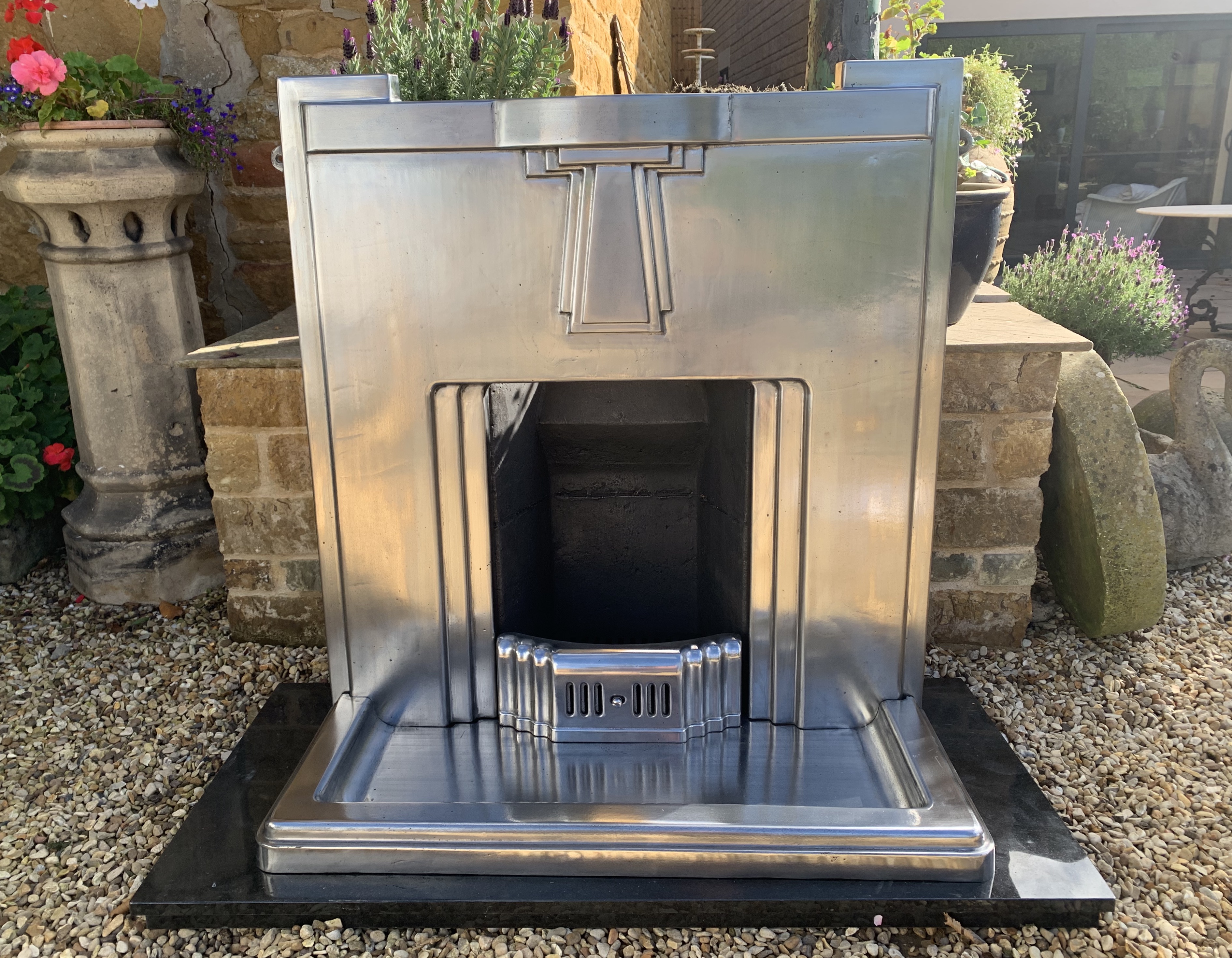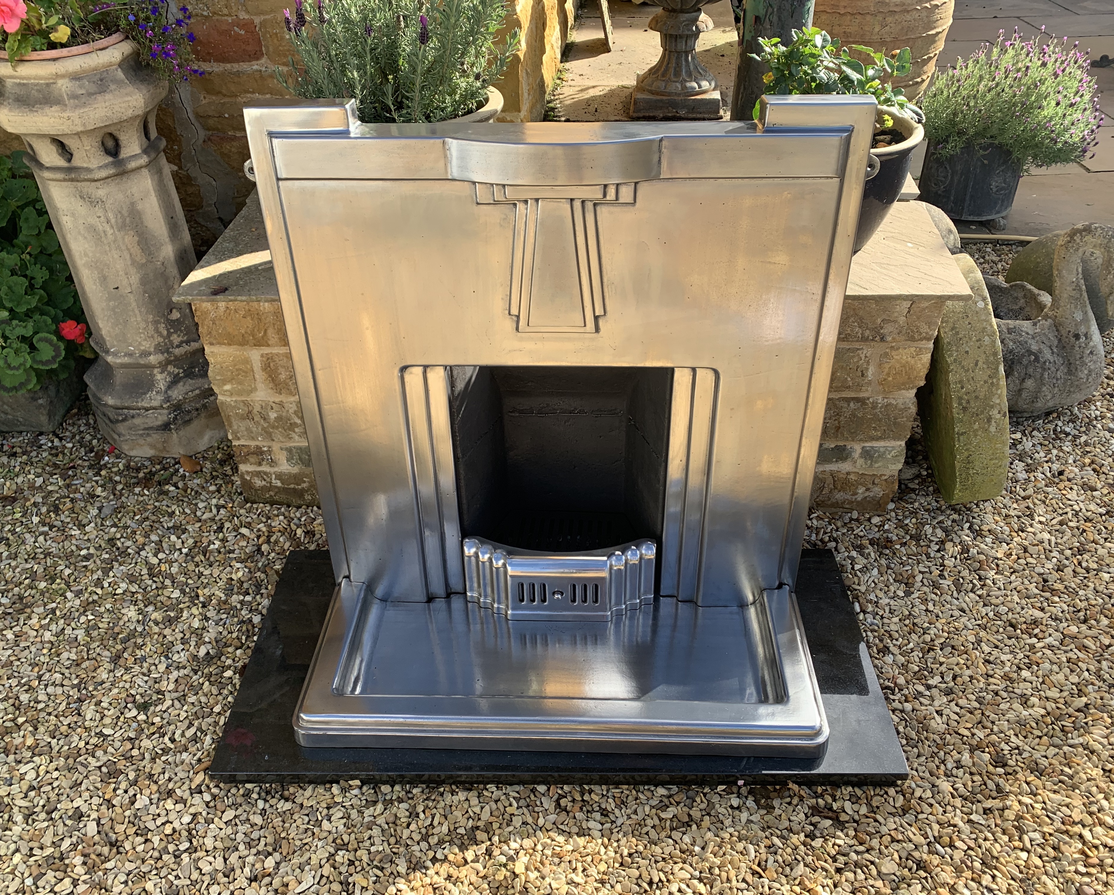 A large living room size original antique Art Deco fireplace that has been fully polished/burnished to give a lovely pewter effect. It is complete with a new clay fire back, coal grate and lovely ornate front cover. It also has its original polished kerb hearth. Delivery available - please contact us on 07885 379772 or message below for more information or to purchase.