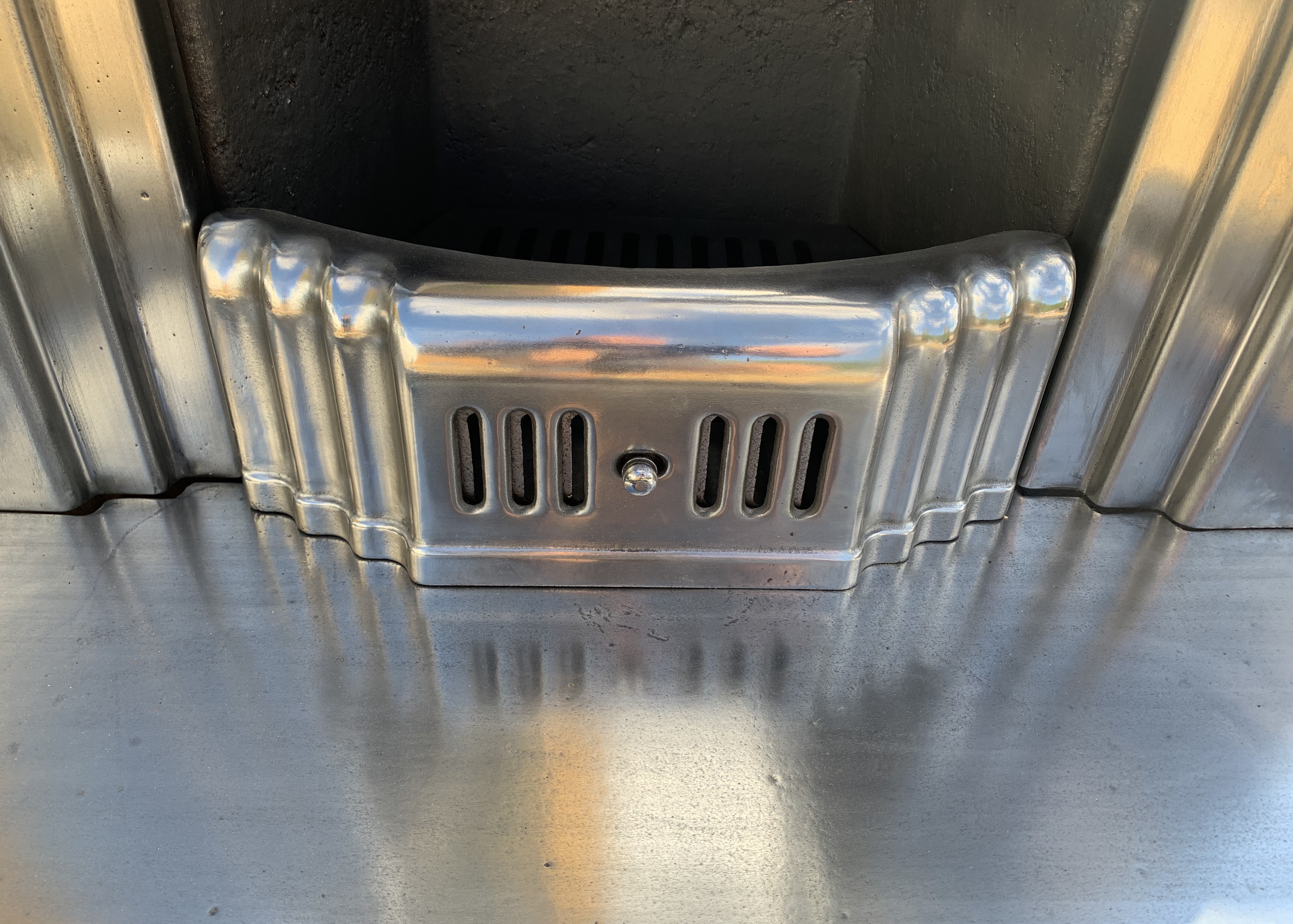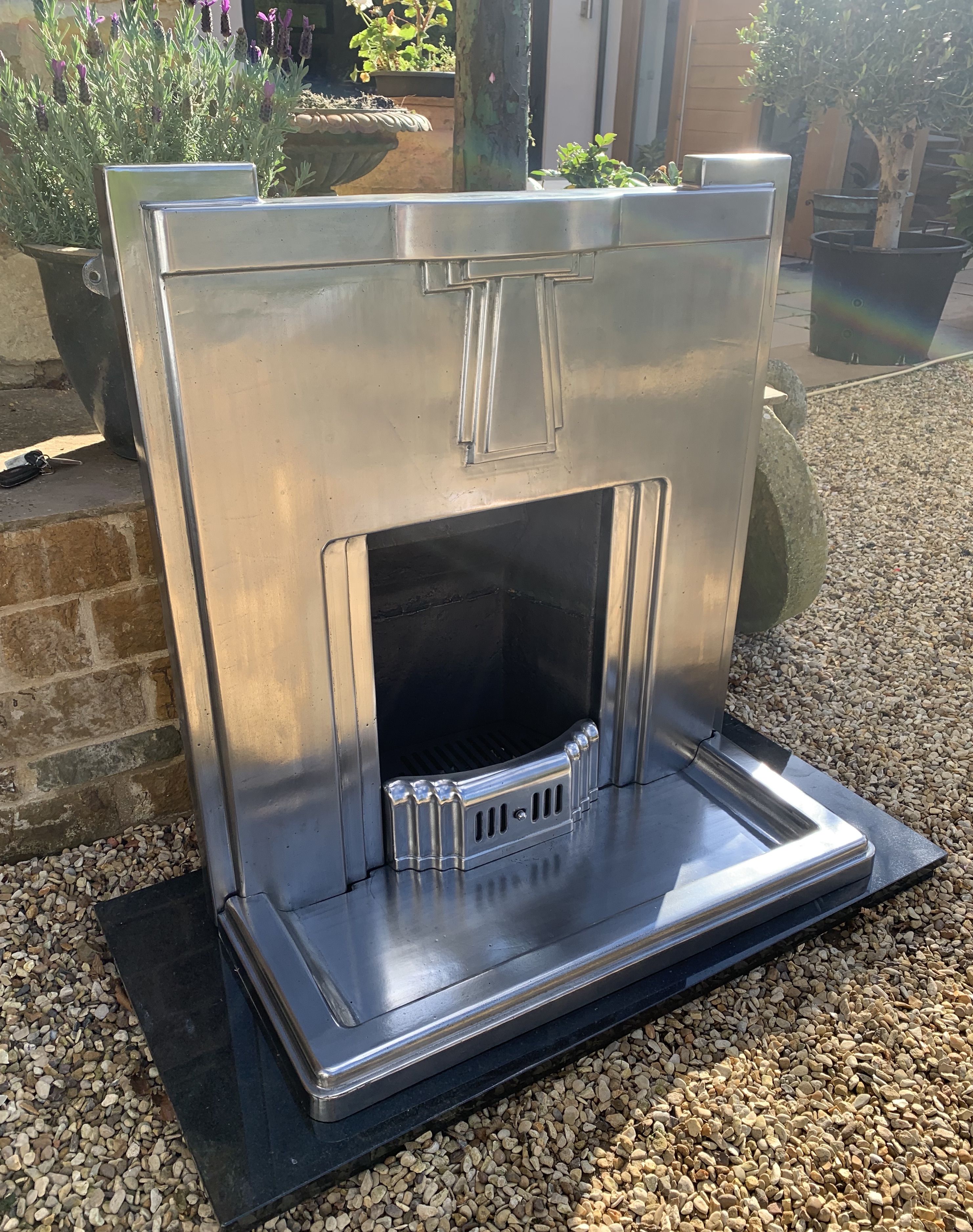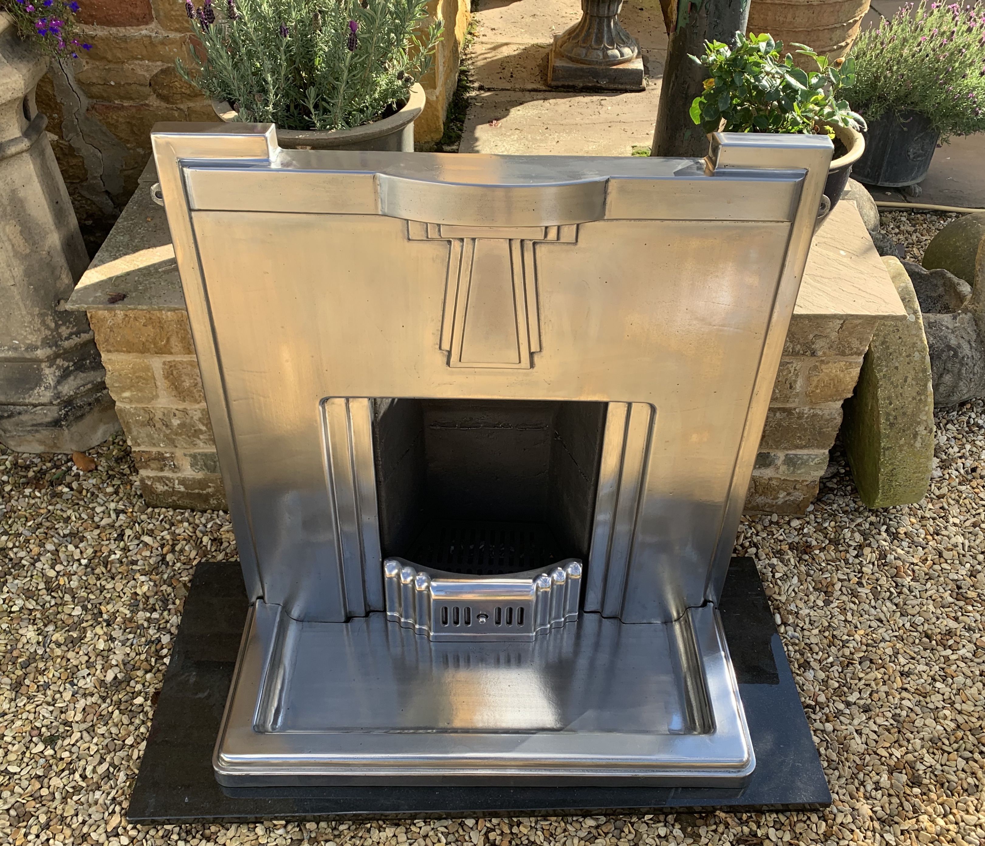 A large living room size original antique Art Deco fireplace that has been fully polished/burnished to give a lovely pewter effect. It is complete with a new clay fire back, coal grate and lovely ornate front cover. It also has its original polished kerb hearth. Delivery available - please contact us on 07885 379772 or message below for more information or to purchase.