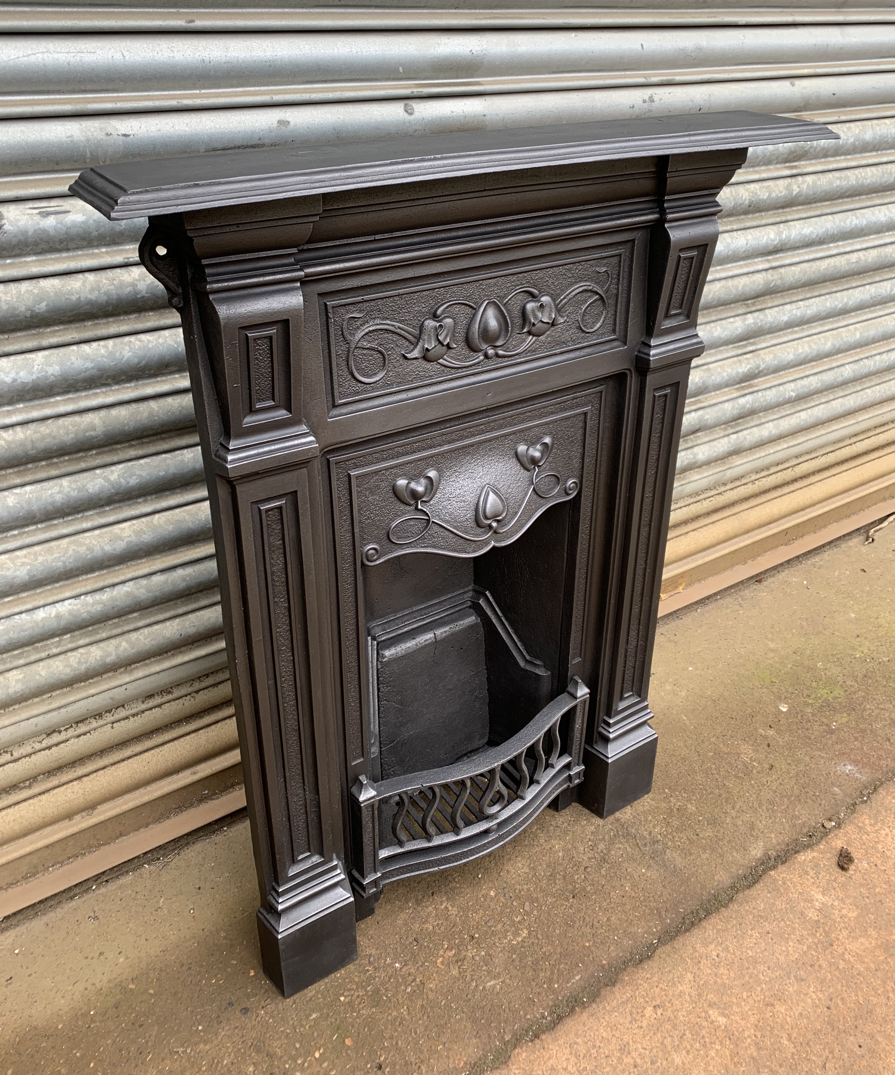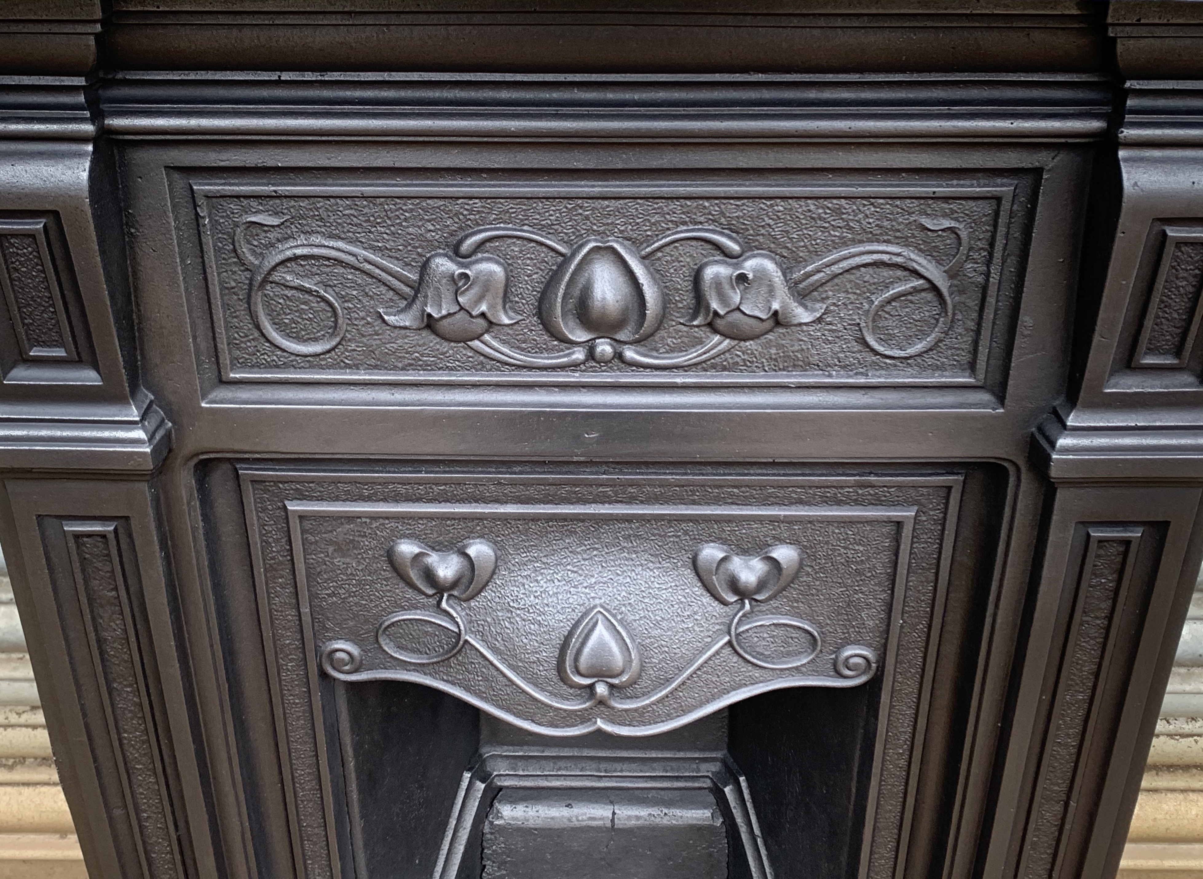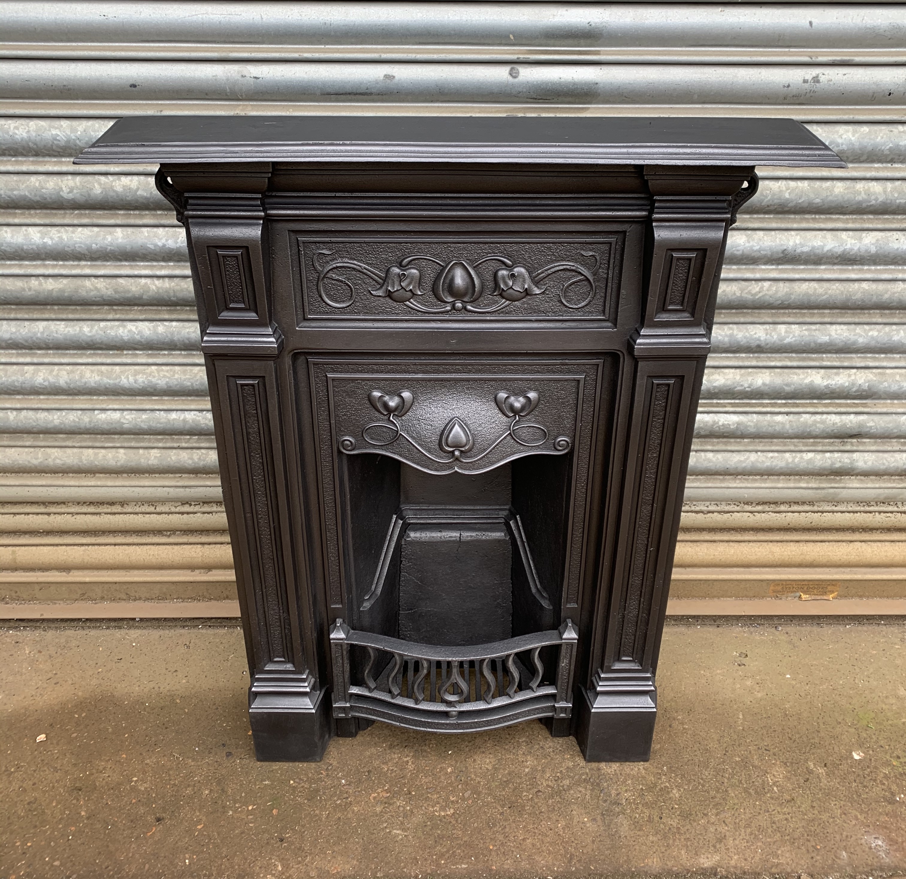 SOLD An original antique Art Nouveau cast iron combination fireplace. Gorgeous casting of flowing stylised flowers and inverted hearts to the frieze and hood. This is complete and ready to install. Contact us on 07885 379772 or message below for more information.