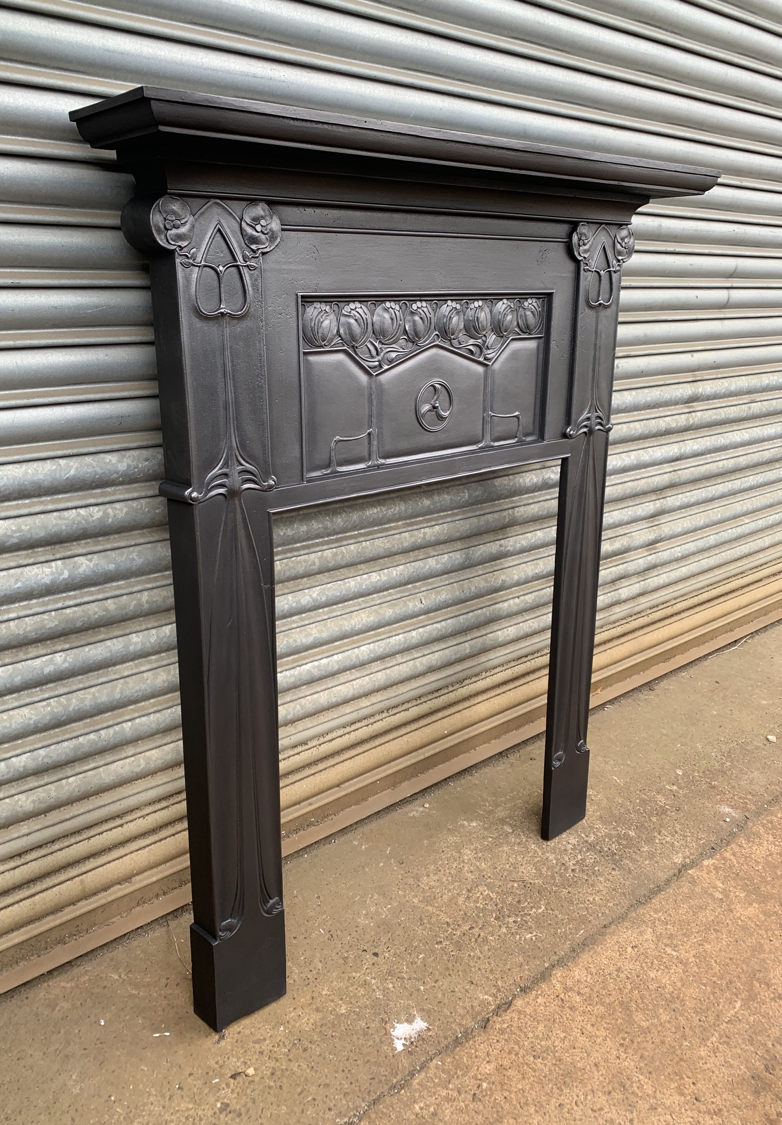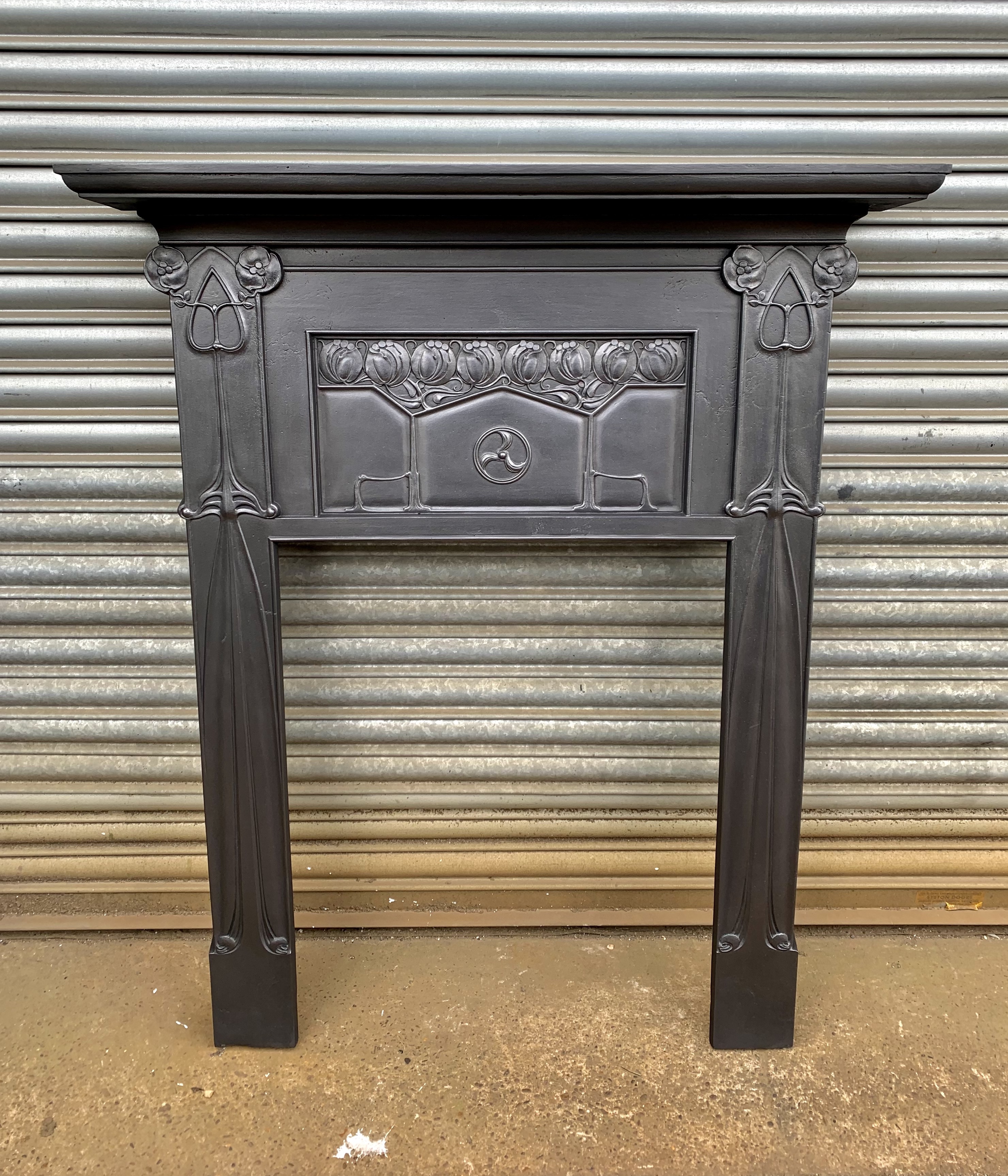 SOLD A stunning and ornate original Art Nouveau/Arts and Crafts cast iron fire surround. This is a slightly smaller size. It has a wonderful flared and bevelled mantle shelf above some stunning flowing lines, upturned hearts and ornate flowers/seed heads which fill the frieze. Contact us on 07885 379772 or message below for more information or to view or purchase - delivery by ourselves is available.