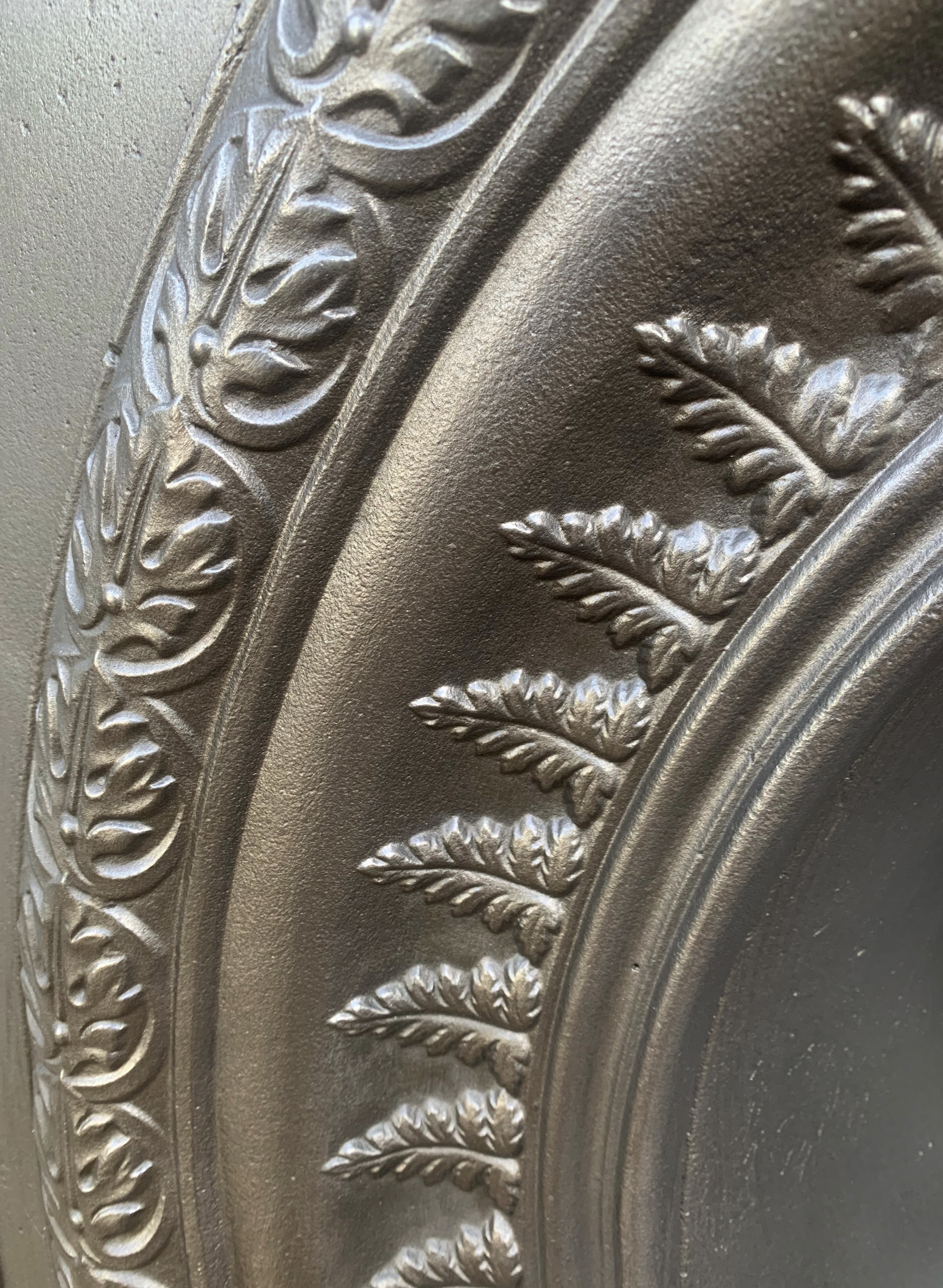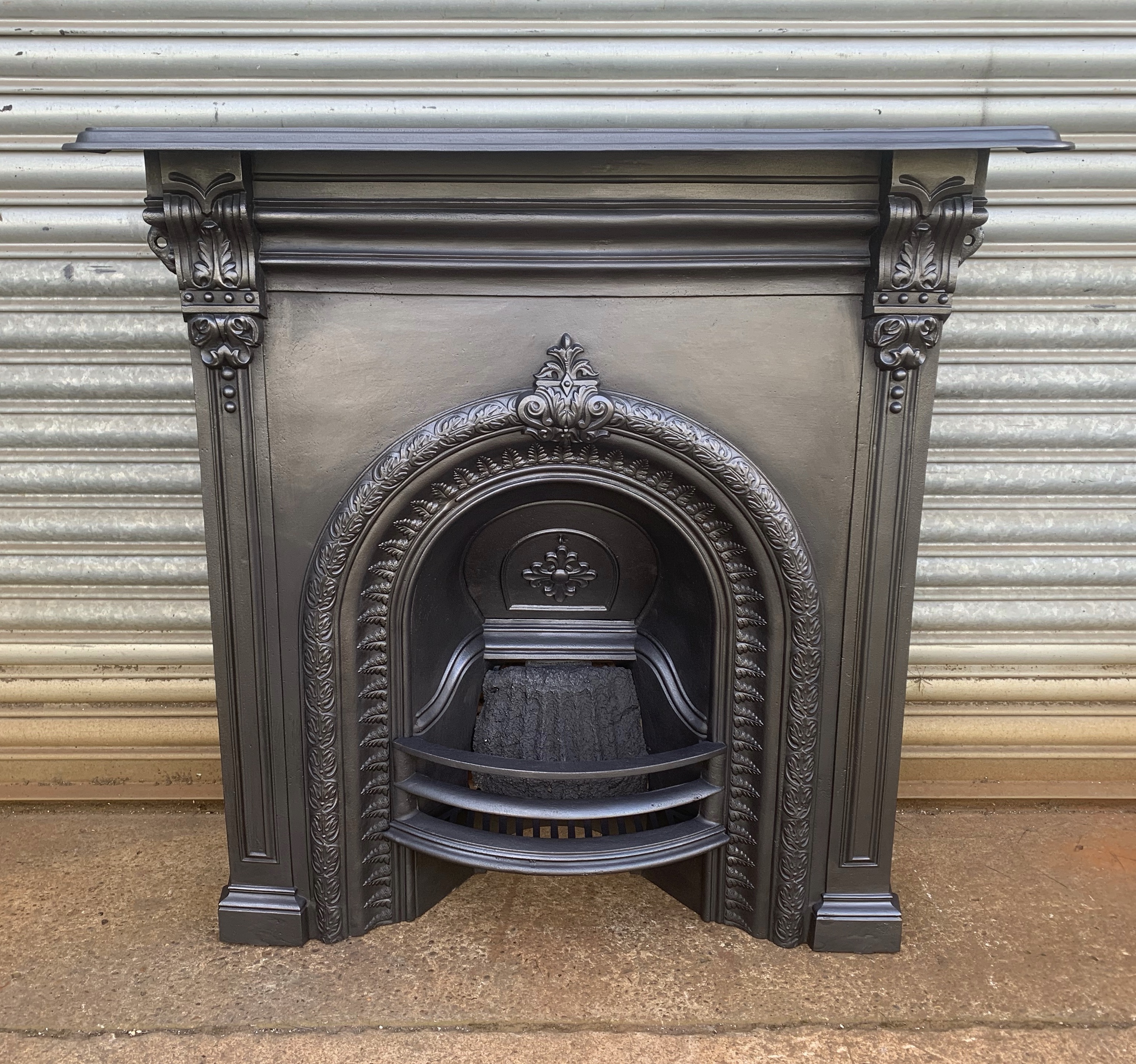 SOLD A larger size original Victorian cast iron combination fireplace. It is complete with its original back, bars and ornate closure plate and ready to install. Beautiful arch with crisp casting of fern leaves. Contact us on 07885 379772 or message below for more information or to purchase.