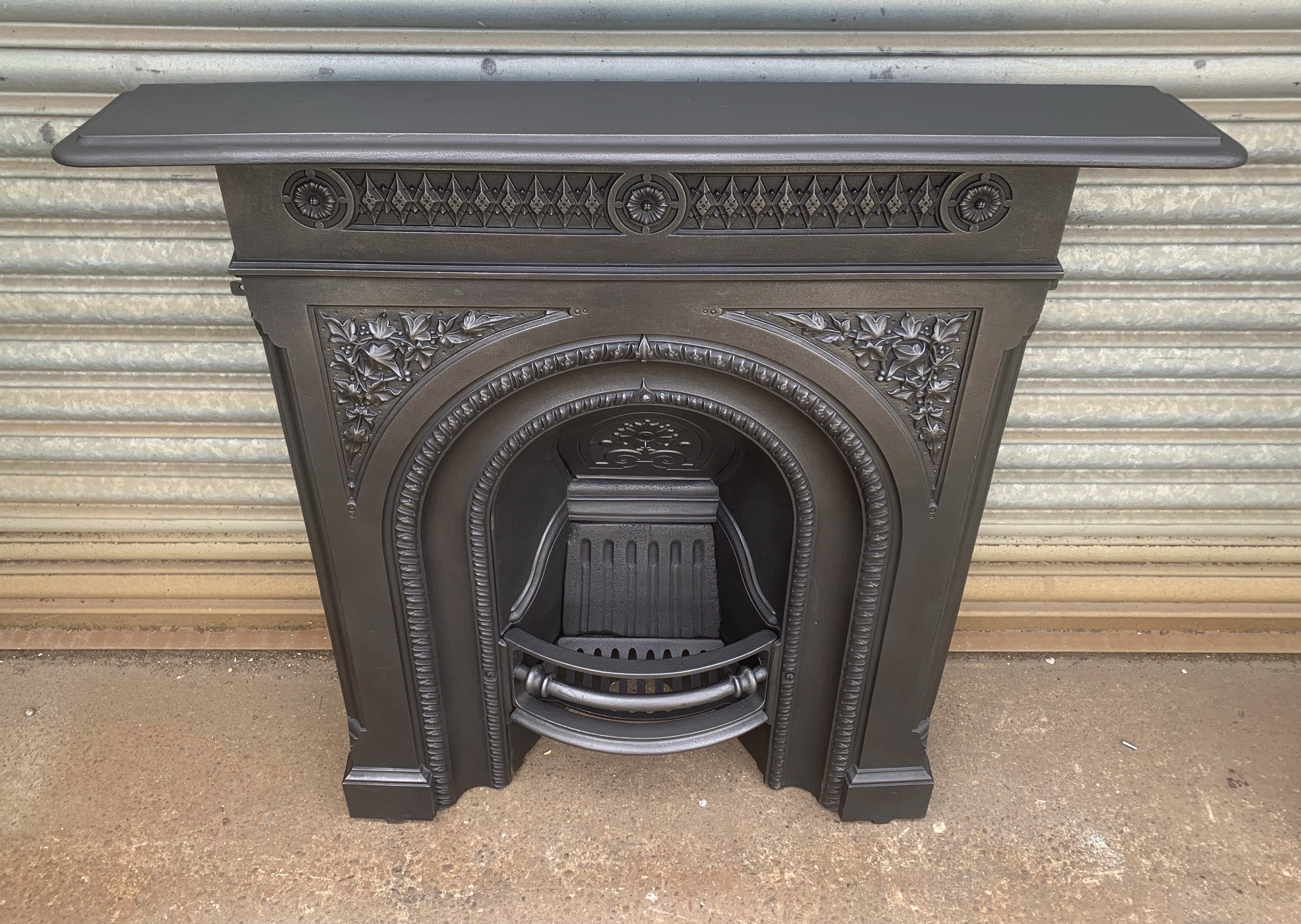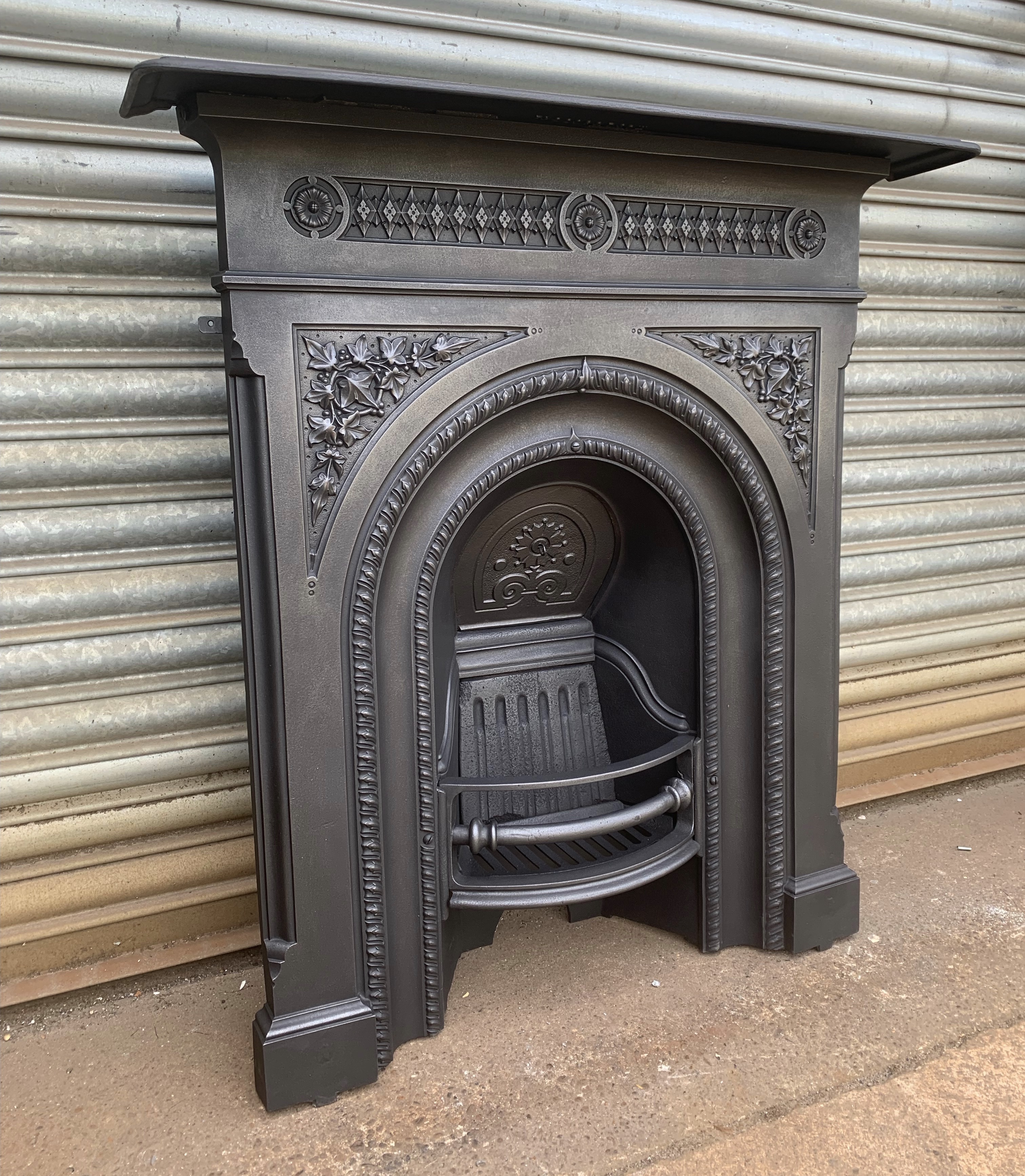 SOLD A stunning Victorian cast iron combination fireplace with centre arch and ivy leaf decoration. Fully complete with original back, ornate closure plate and bars ready to install. Contact us on 07885 379772 or message below for more information.