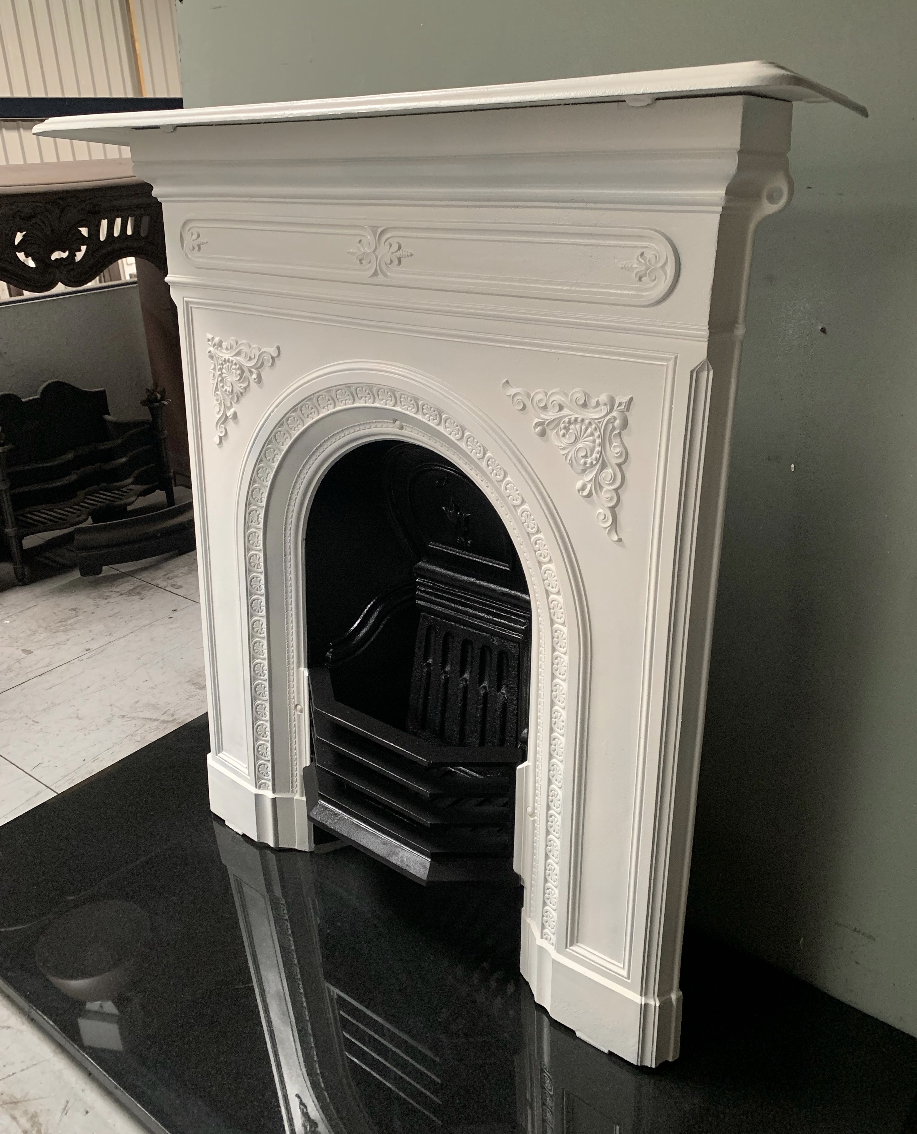 SOLD An original antique Victorian cast iron combination fireplace that has been stripped and cleaned and then spray painted white to reveal the crisp casting. It is complete with its original back, ornate closure plate and bars ready to fit. Contact us on 07885 379772 or message below for more information or to purchase.