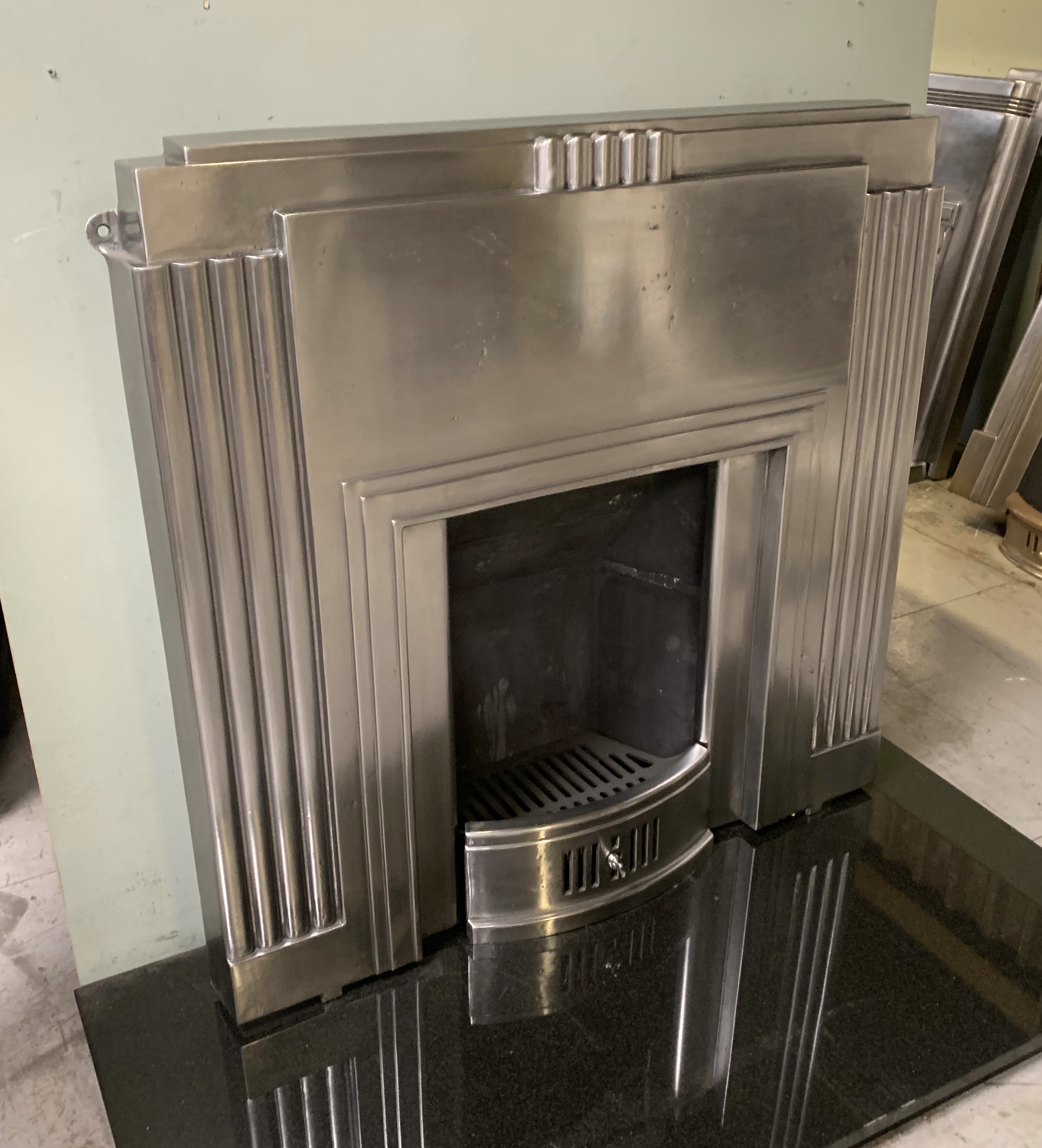 SOLD A large living room size original antique Art Deco fireplace that has been fully polished to give a lovely pewter effect. It is complete with a new fire back and coal grate. Contact us on 07885 379772 or message below for more information or to view or purchase.