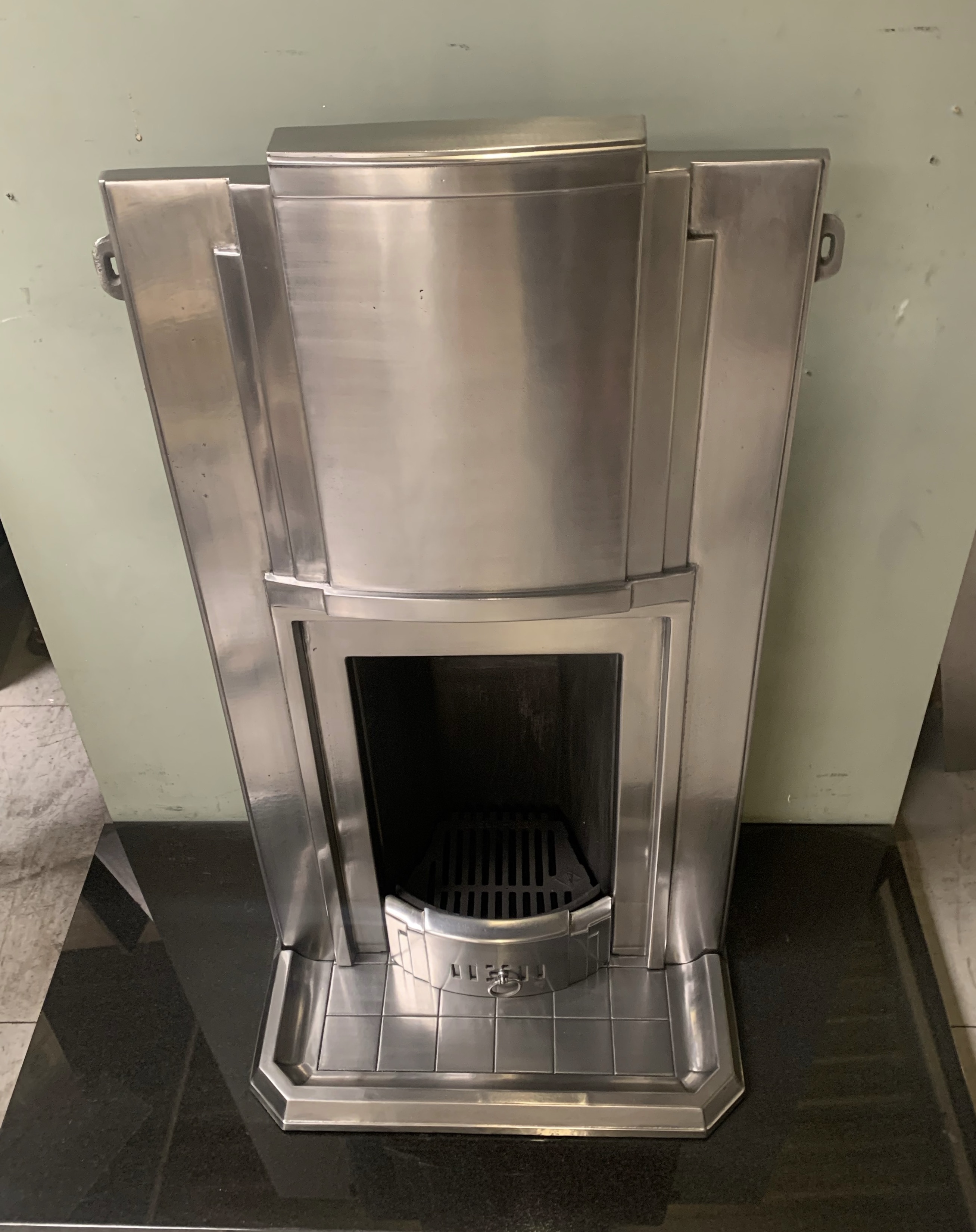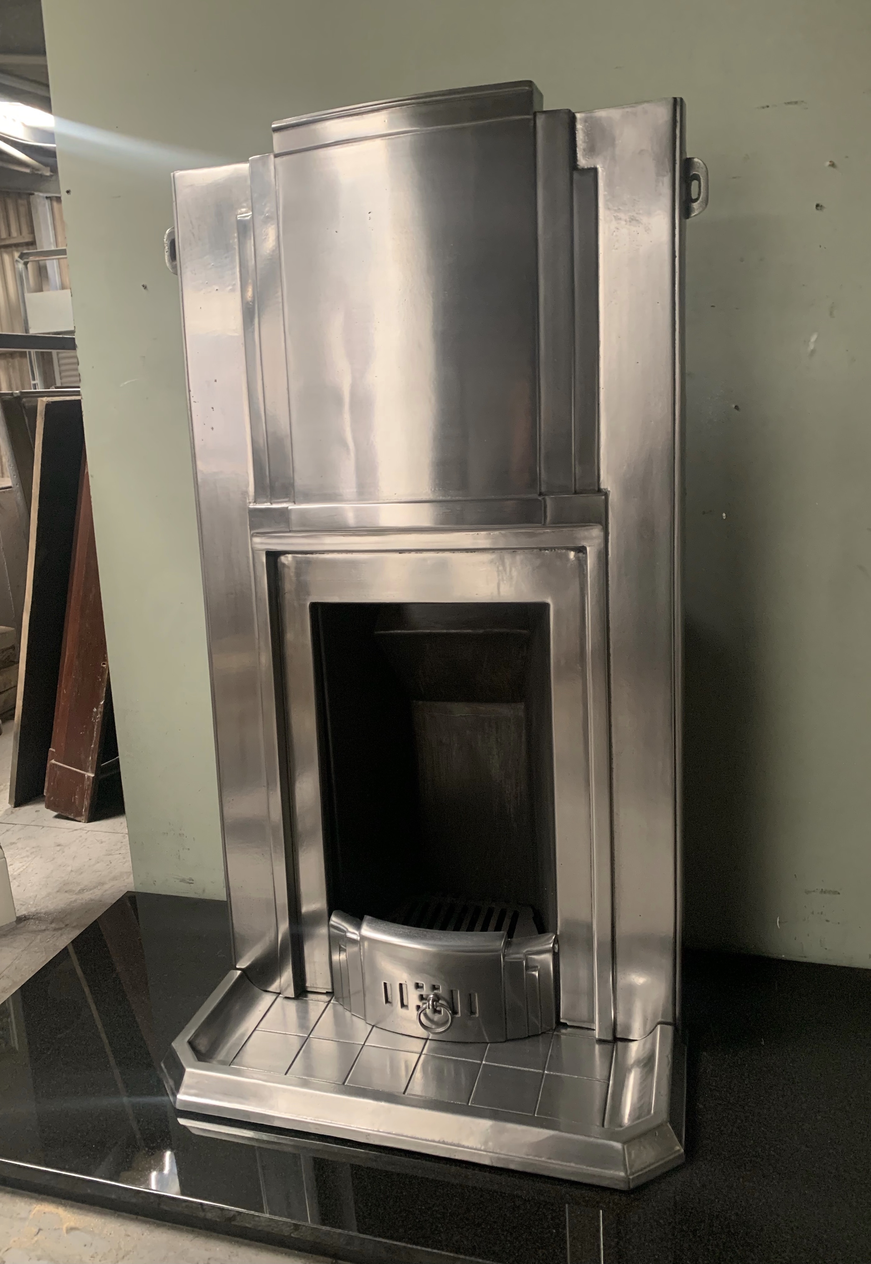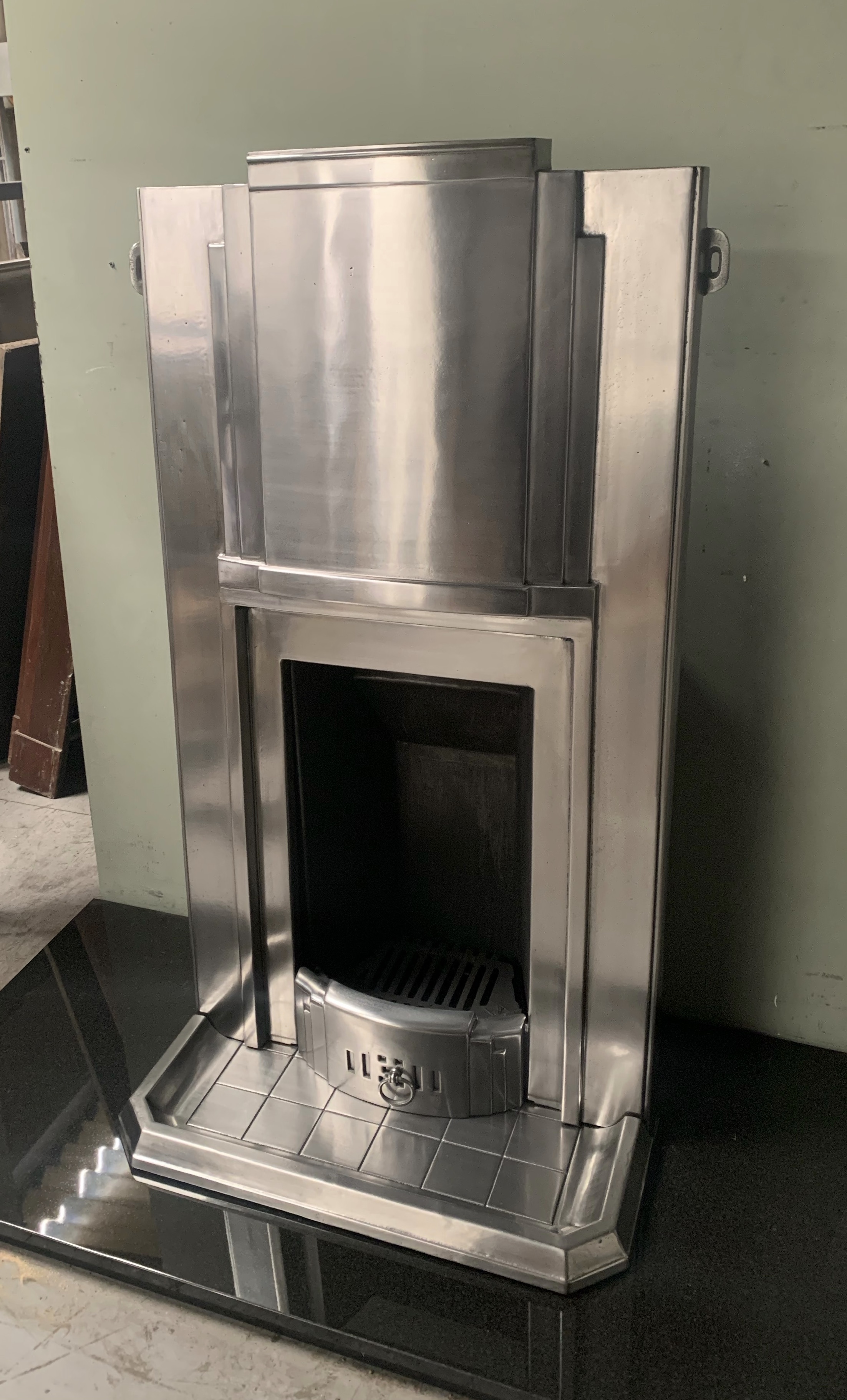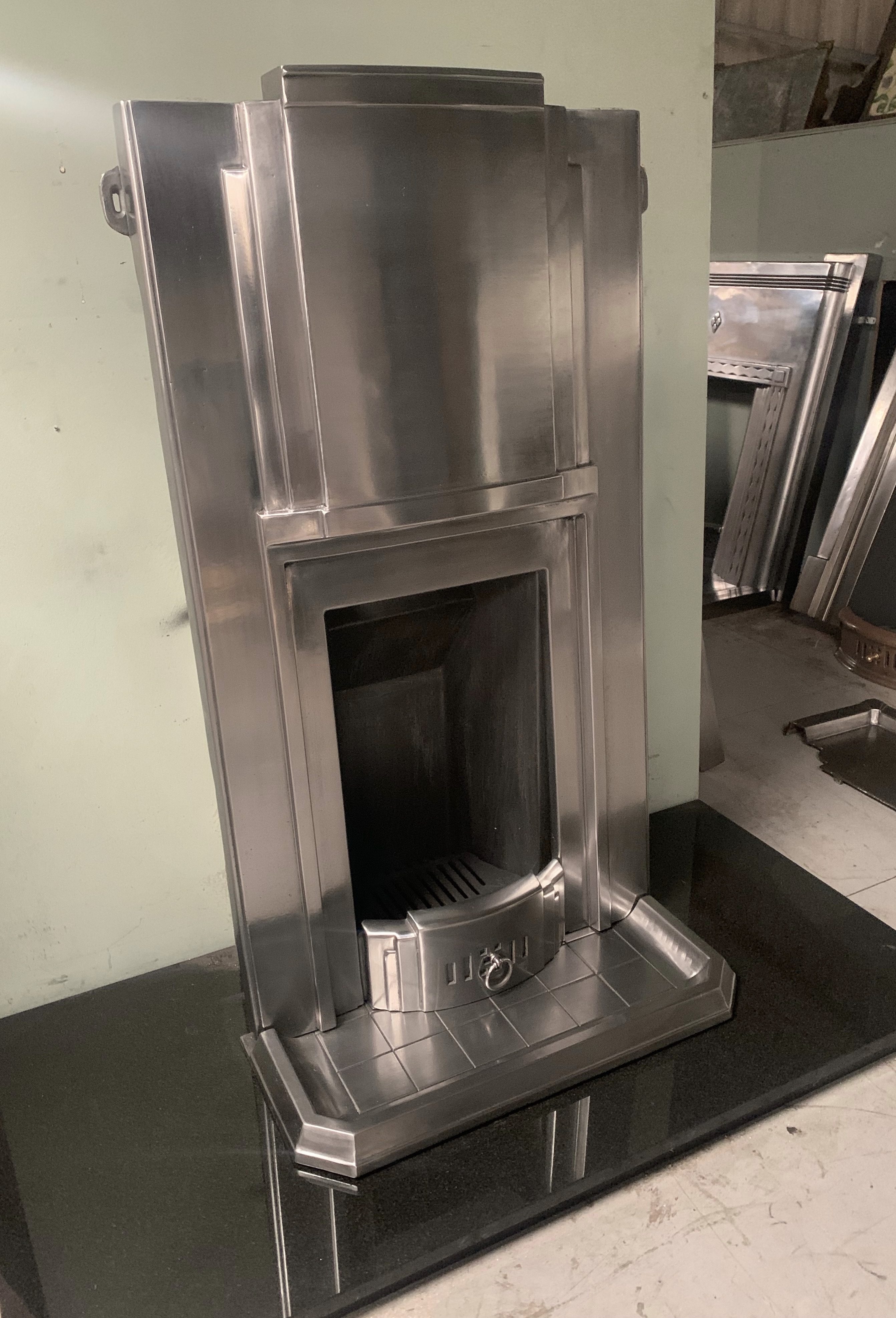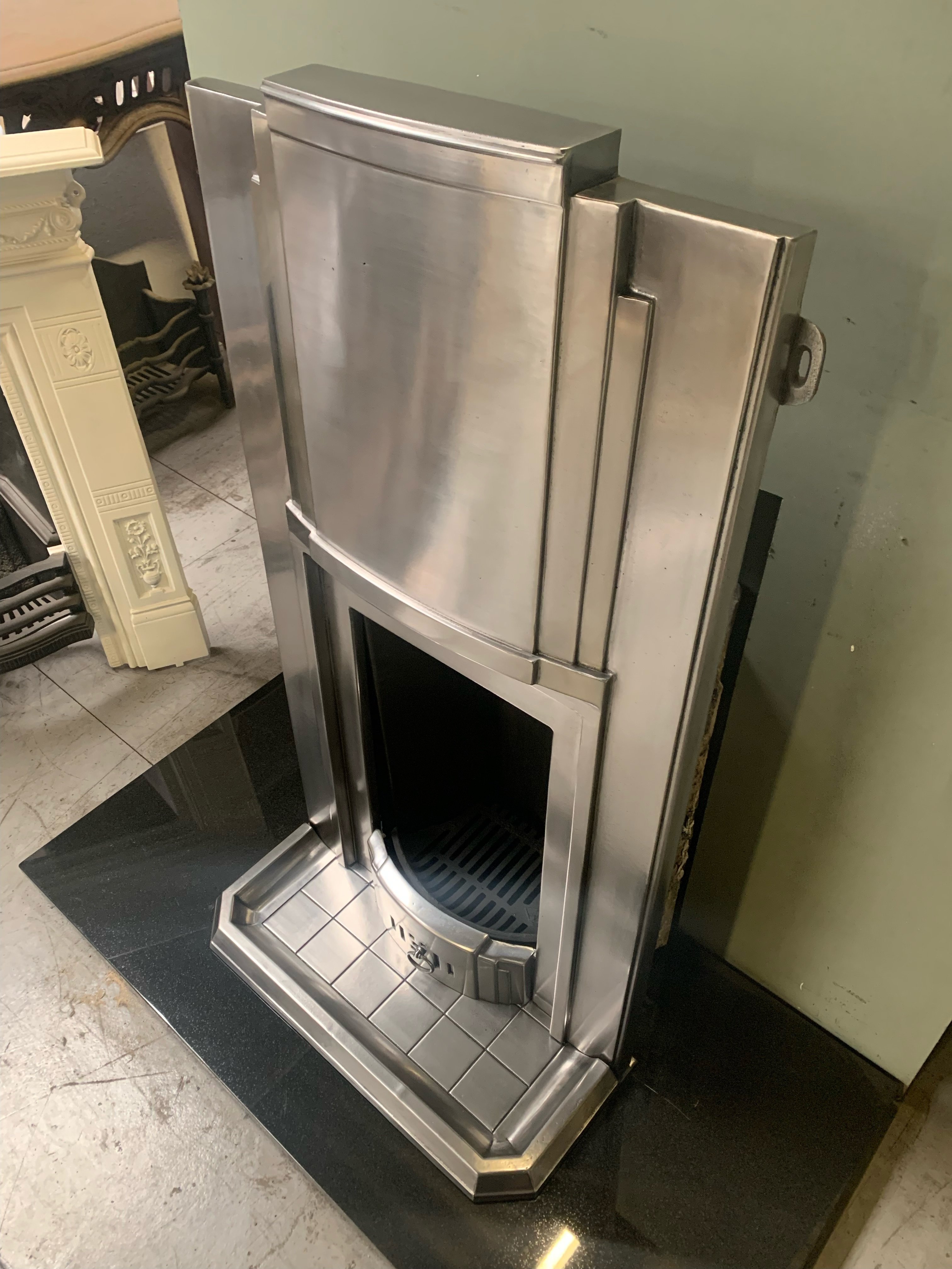 SOLD An original very stylish Art Deco polished cast iron combination fireplace with its original brick effect kerb hearth. This has been fully burnished/polished. Fully complete with a new clay fire back and grate ready to install. Contact us on 07885 379772 or message below for more information or to purchase.