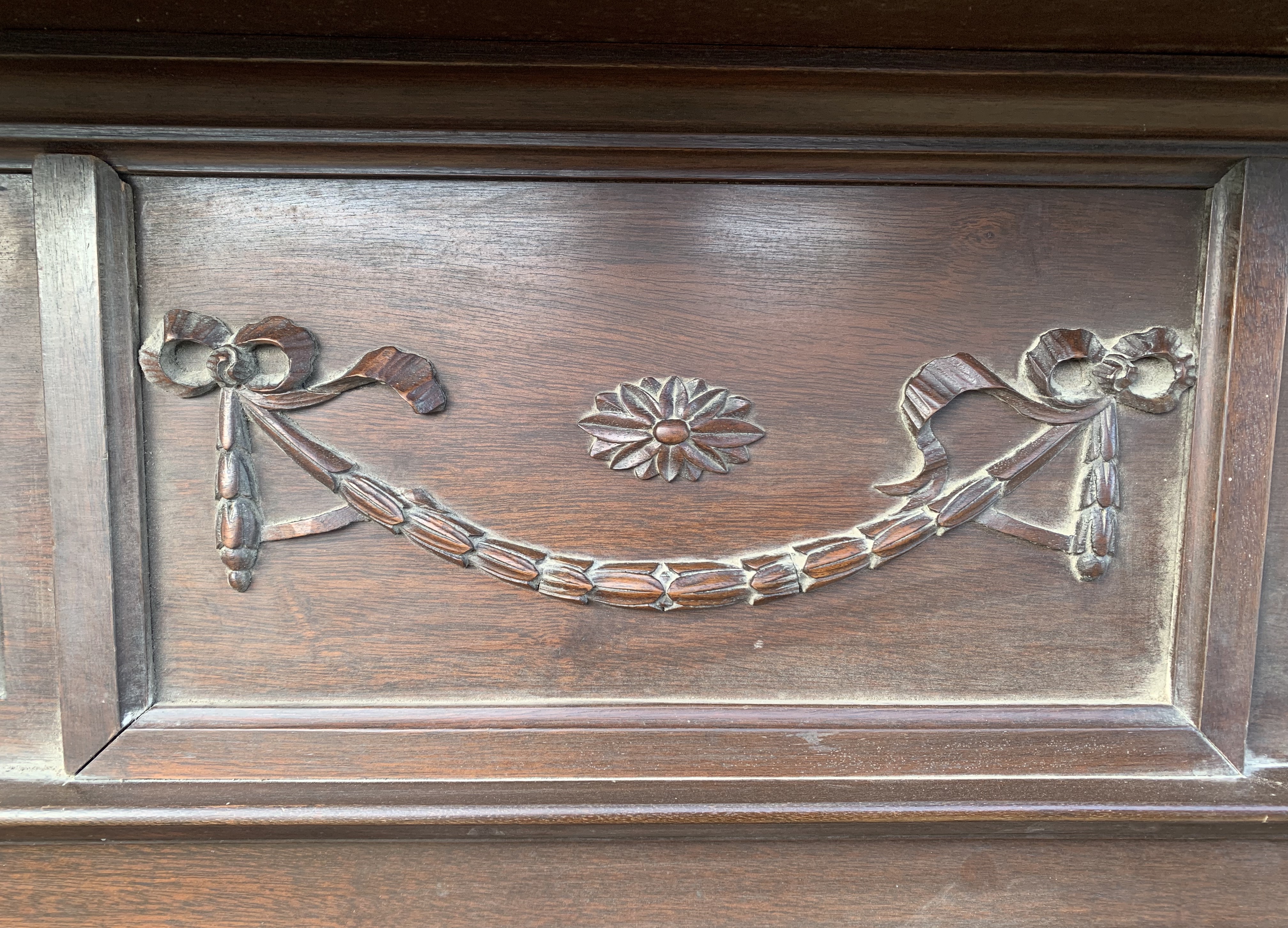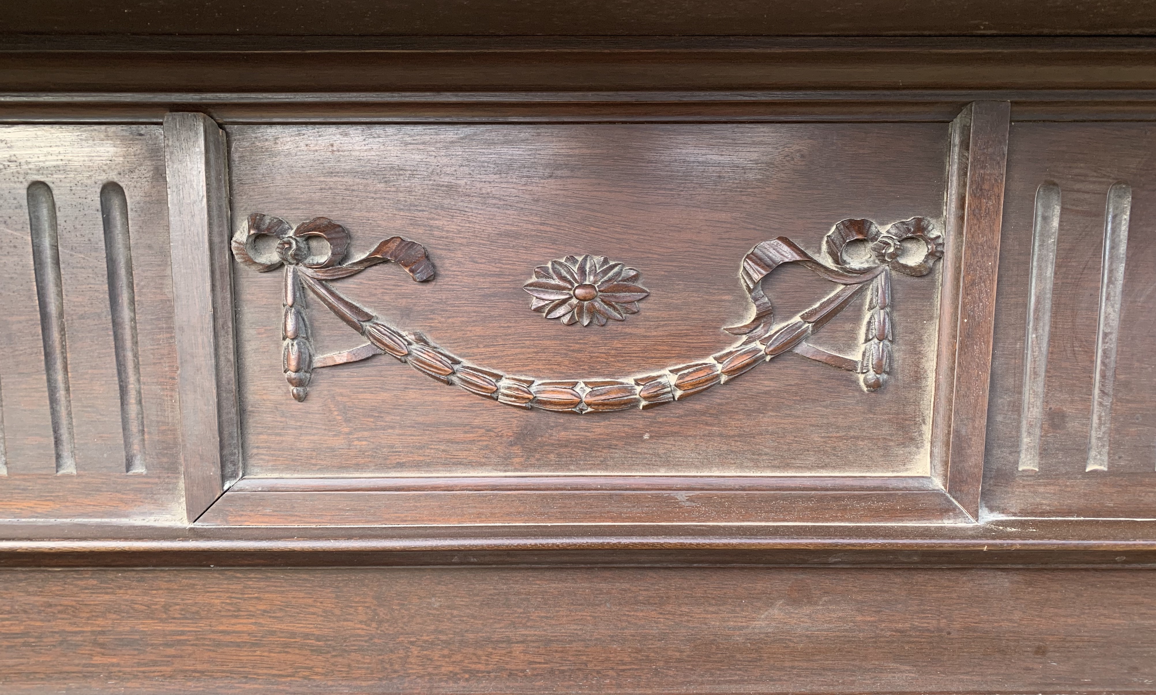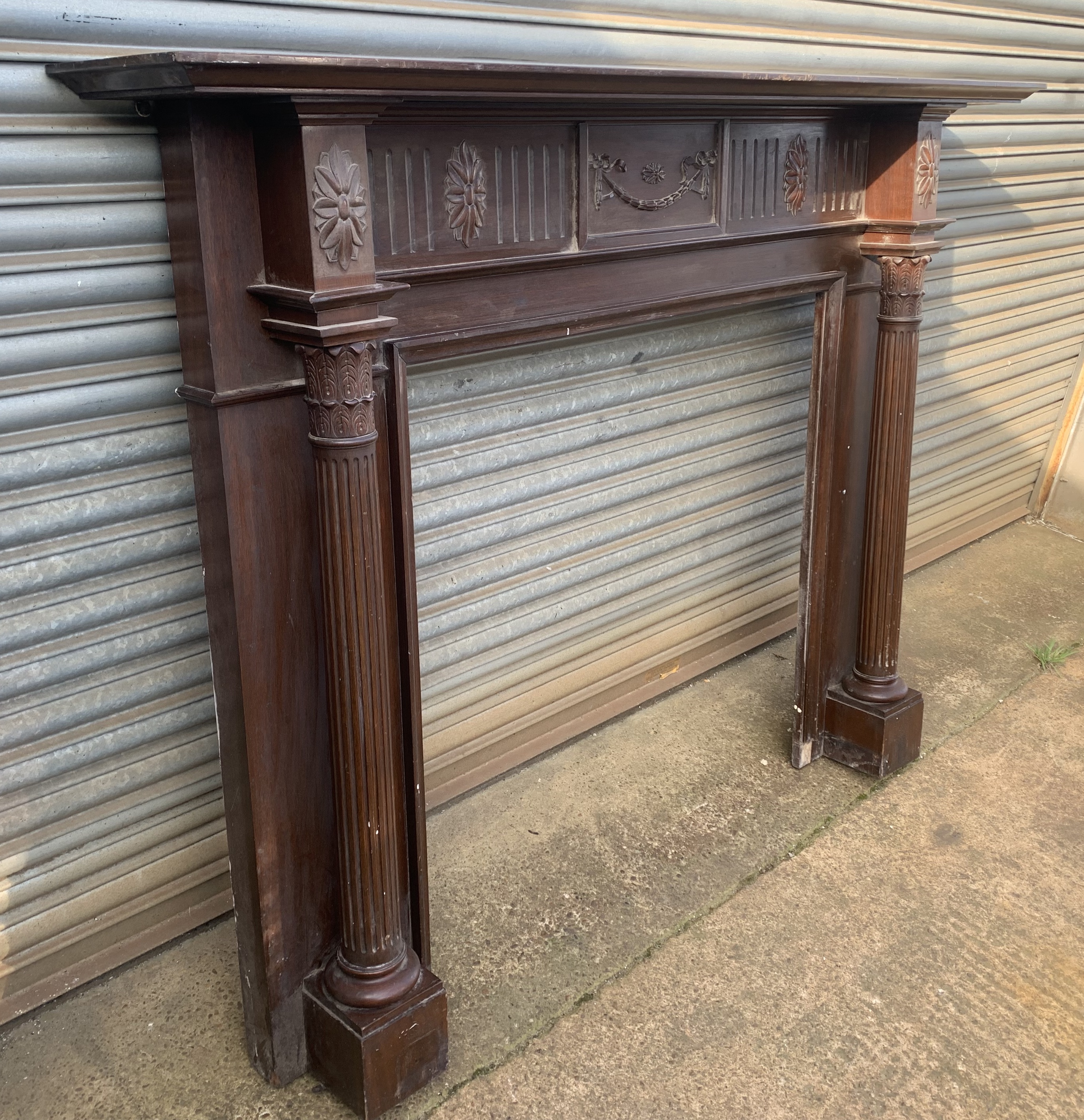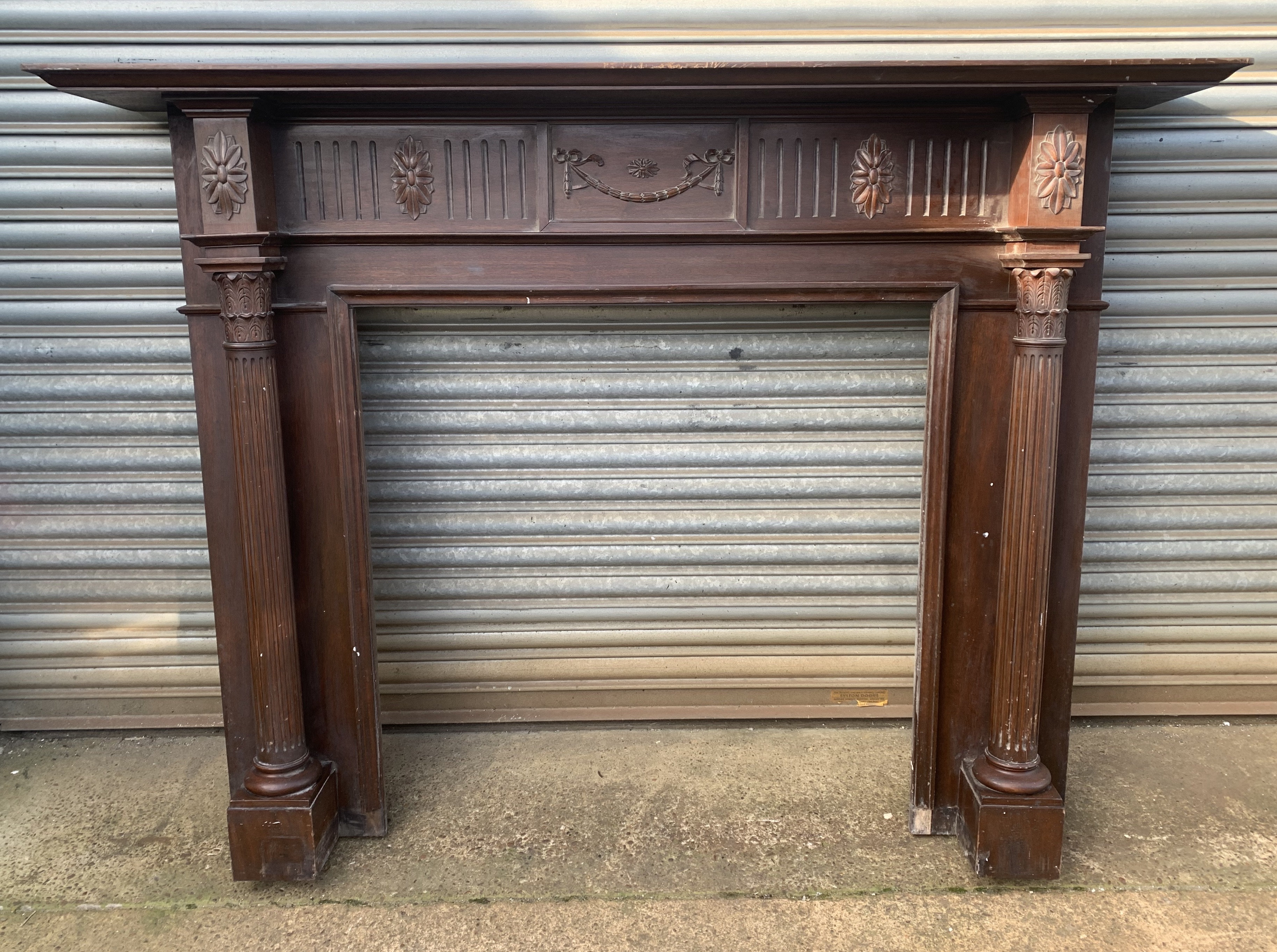 A gorgeous original antique, Georgian revival mahogany fire surround with lovely reeded columns, bows and swags and reeded freize. Contact us on 07885 379772 or message below for more information or to view or purchase.