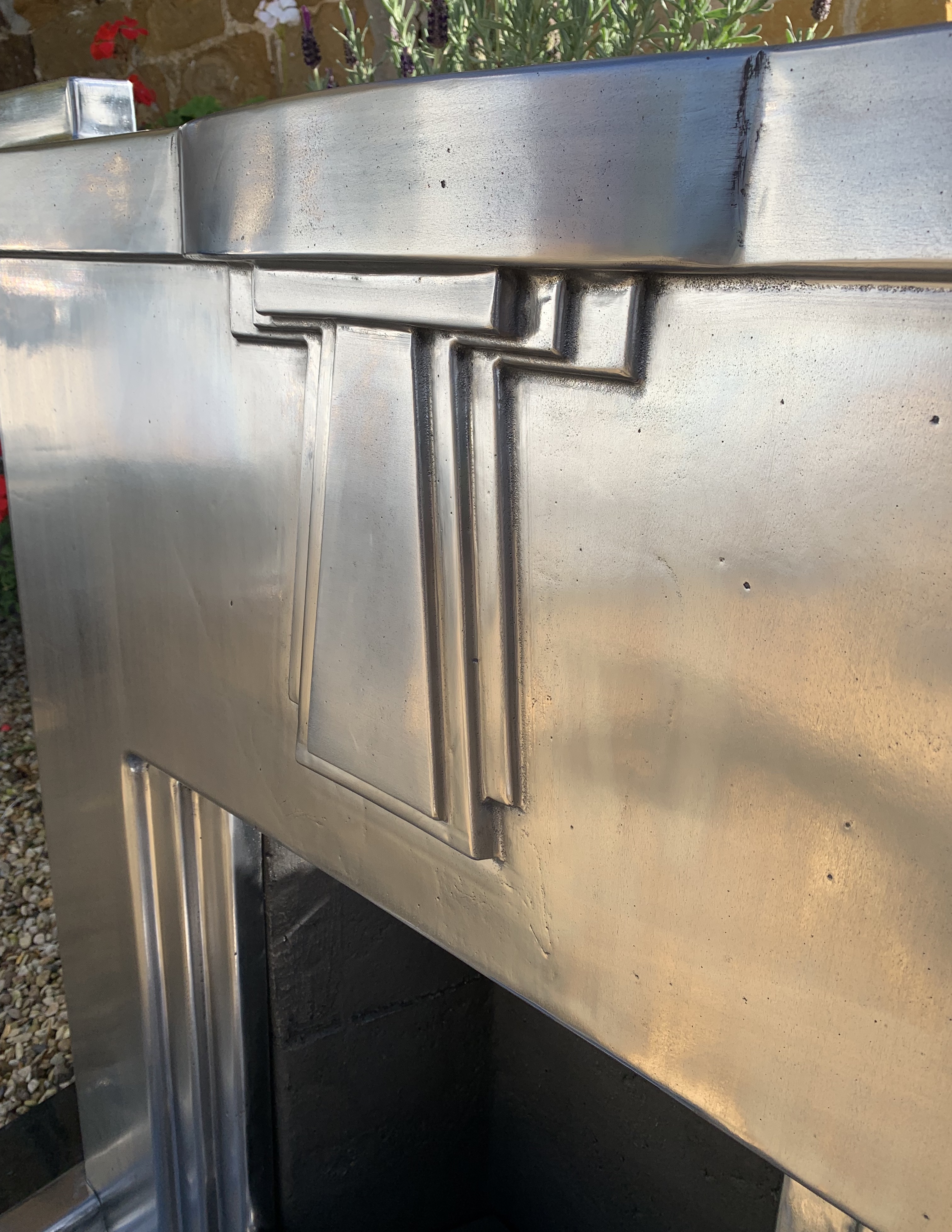 A large living room size original antique Art Deco fireplace that has been fully polished/burnished to give a lovely pewter effect. It is complete with a new clay fire back, coal grate and lovely ornate front cover. It also has its original polished kerb hearth. Delivery available - please contact us on 07885 379772 or message below for more information or to purchase.
