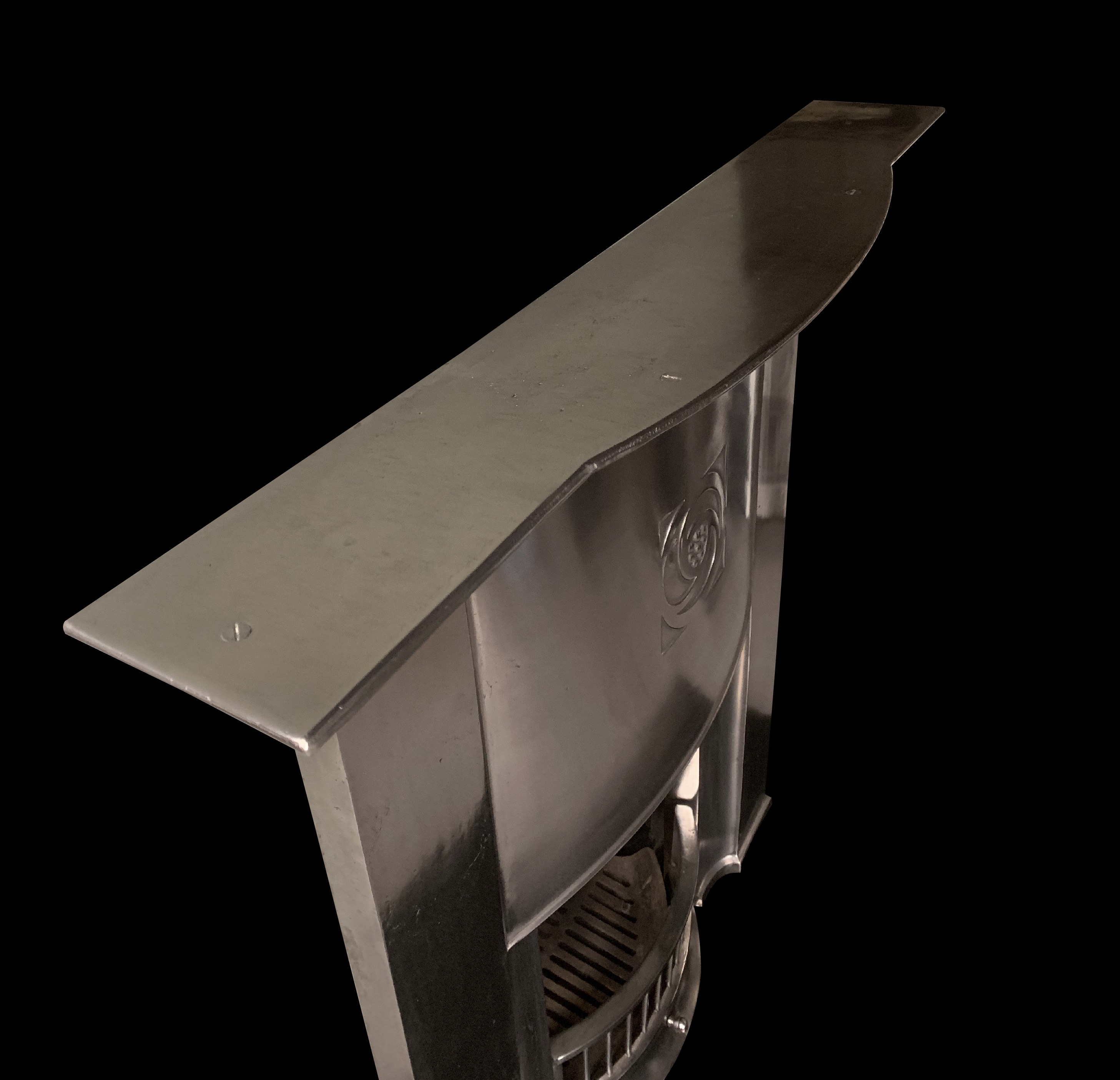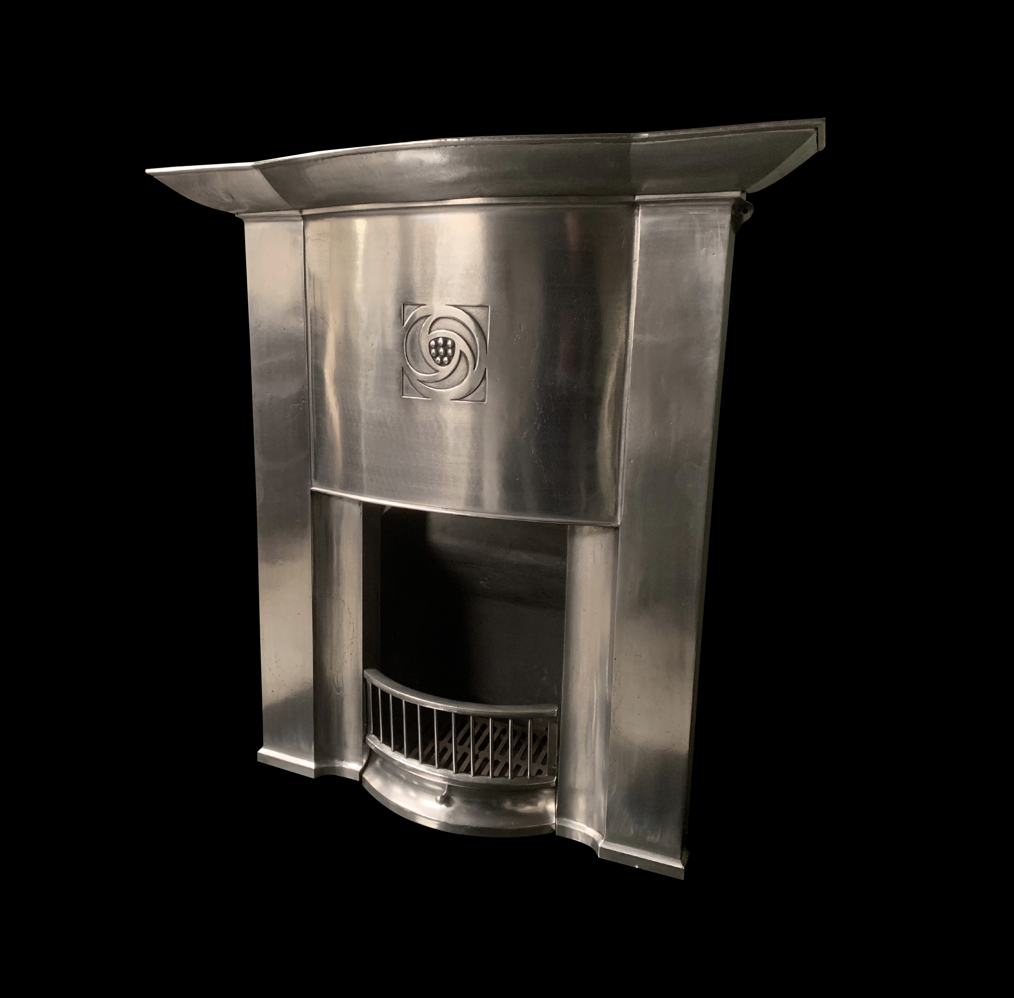 SOLD This is a stunning original Arts and Crafts cast iron fireplace, that has been fully burnished/polished. With a gorgeous flared and curved mantle shelf and a central stylised Glasgow rose to the frieze, it is truly magnificent and rare. This larger fireplace is complete with all components including its original grate and front bars completed with a new clay fire back ready to install. It is an ideal size for a dining or living room or larger bedroom. It has been professionally stripped to remove many layers of paint. Contact us on 07885 379772 or email for more information.