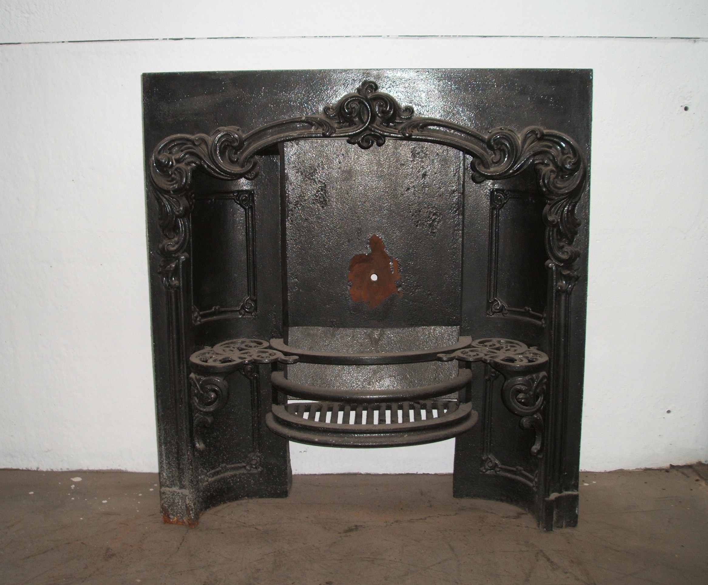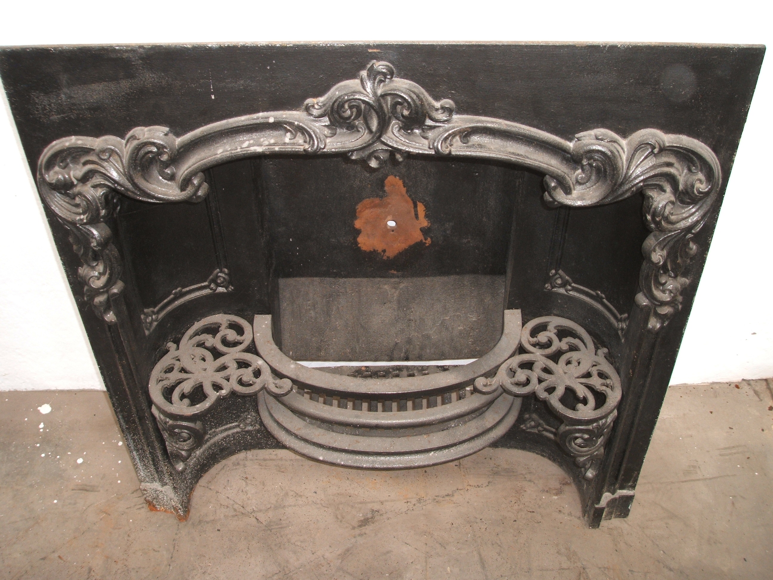 An original Rococo style cast iron register grate with decorative side supports. AWAITING RESTORATION. Contact us on 07885 379772 or email below for more details. Delivery is available.