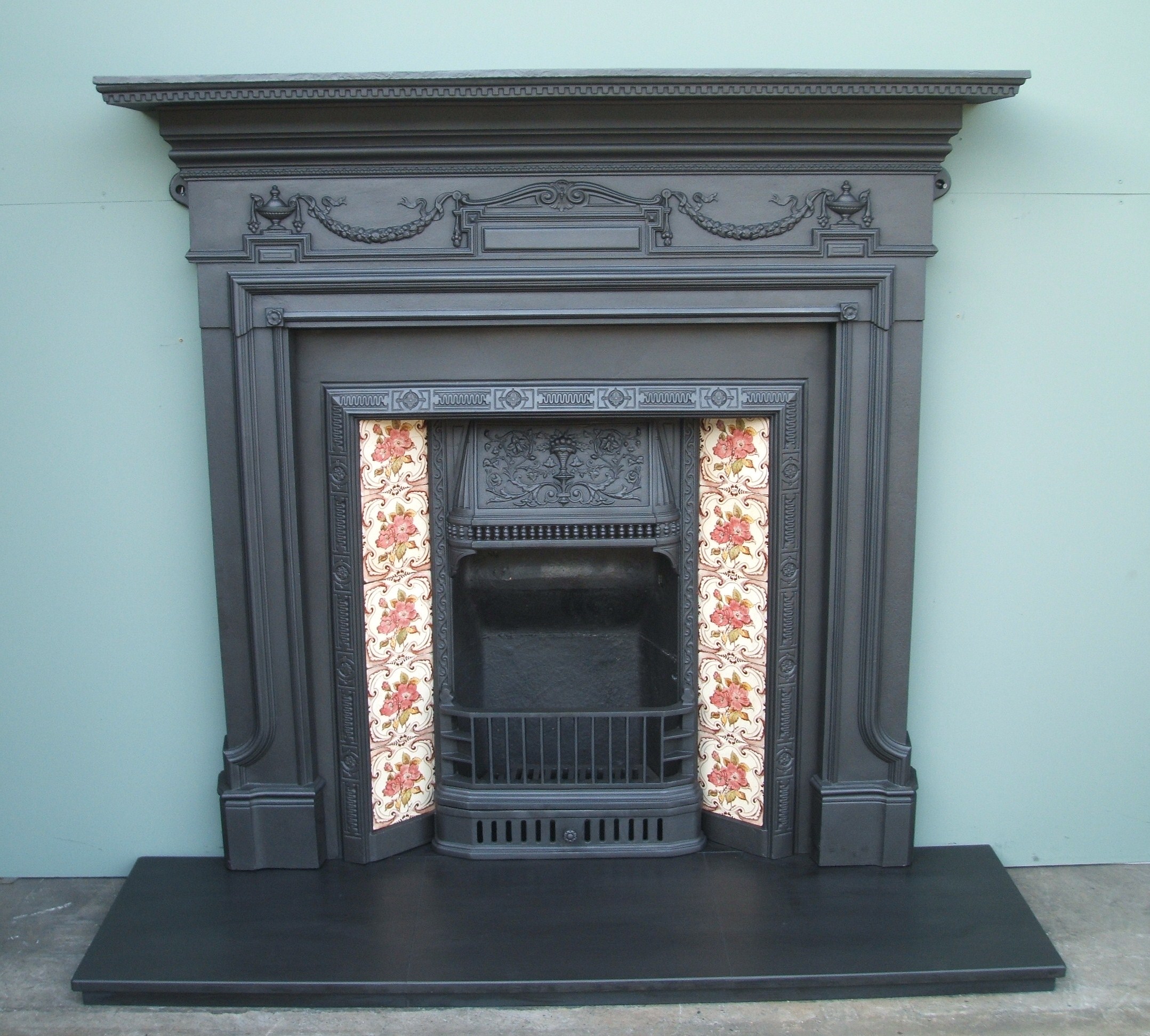 An original antique Victorian cast iron surround with 2 urns and bows and swags. Shown with an original Victorian cast iron tiled insert which is sold separately. Contact us on 07885 379772 or email below for more details. Delivery available.SOLD