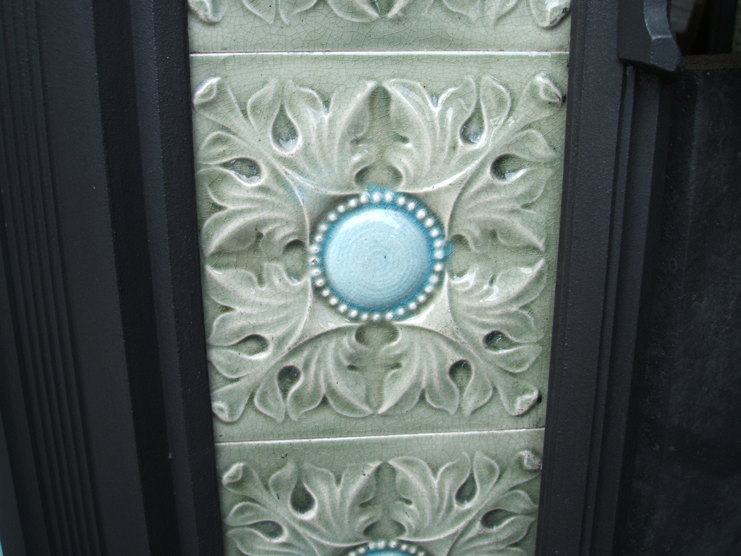 An original Victorian cast iron combination fireplace complete with an original set of 12 Victorian majolica tiles in pale green and blue. SOLD