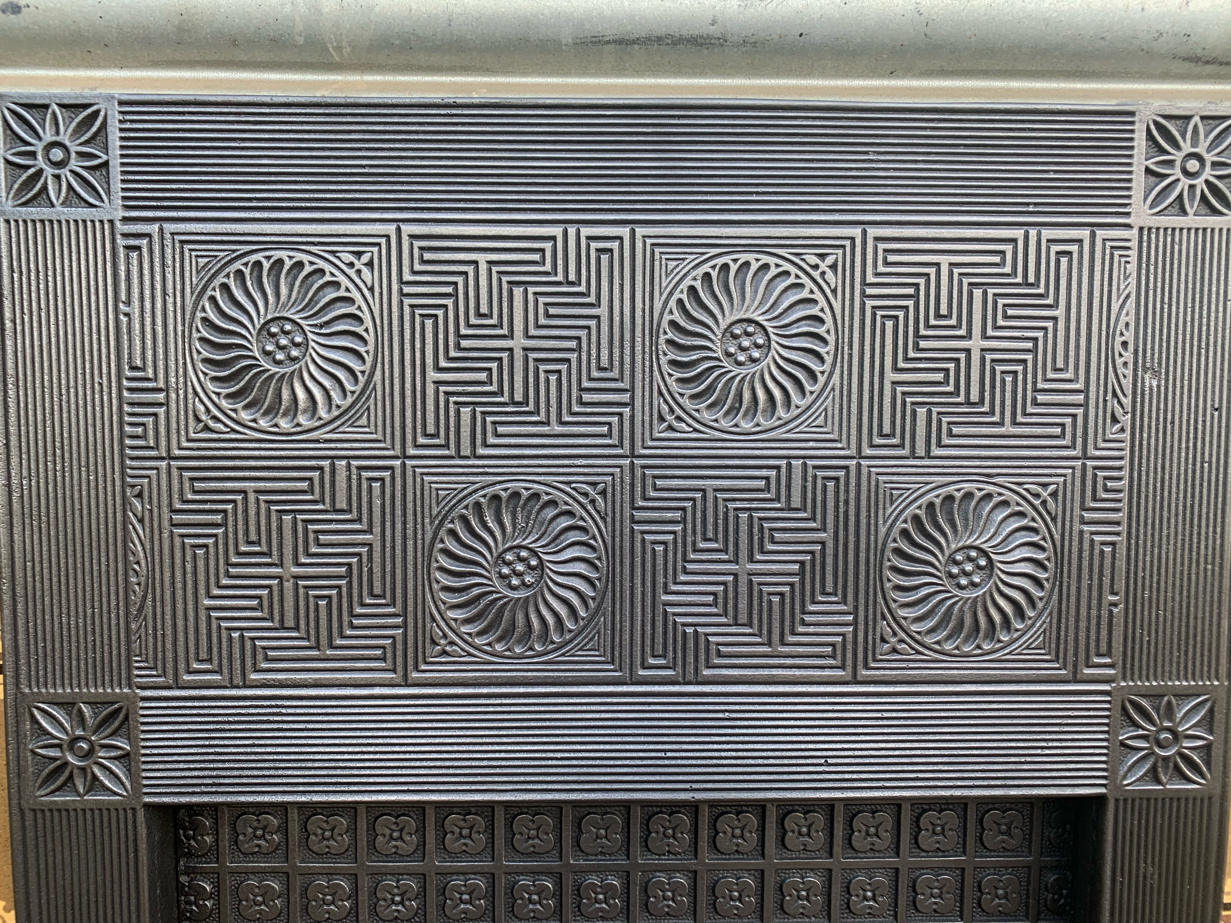 An original antique aesthetic movement cast iron insert with its original set of 10 matching tiles and a sliding hood by Thomas Jekyll. Completed with a new clay fire back, grate and front bars. An excellent and rarely seen model. Contact us on 07885 379772 or email us below for more details