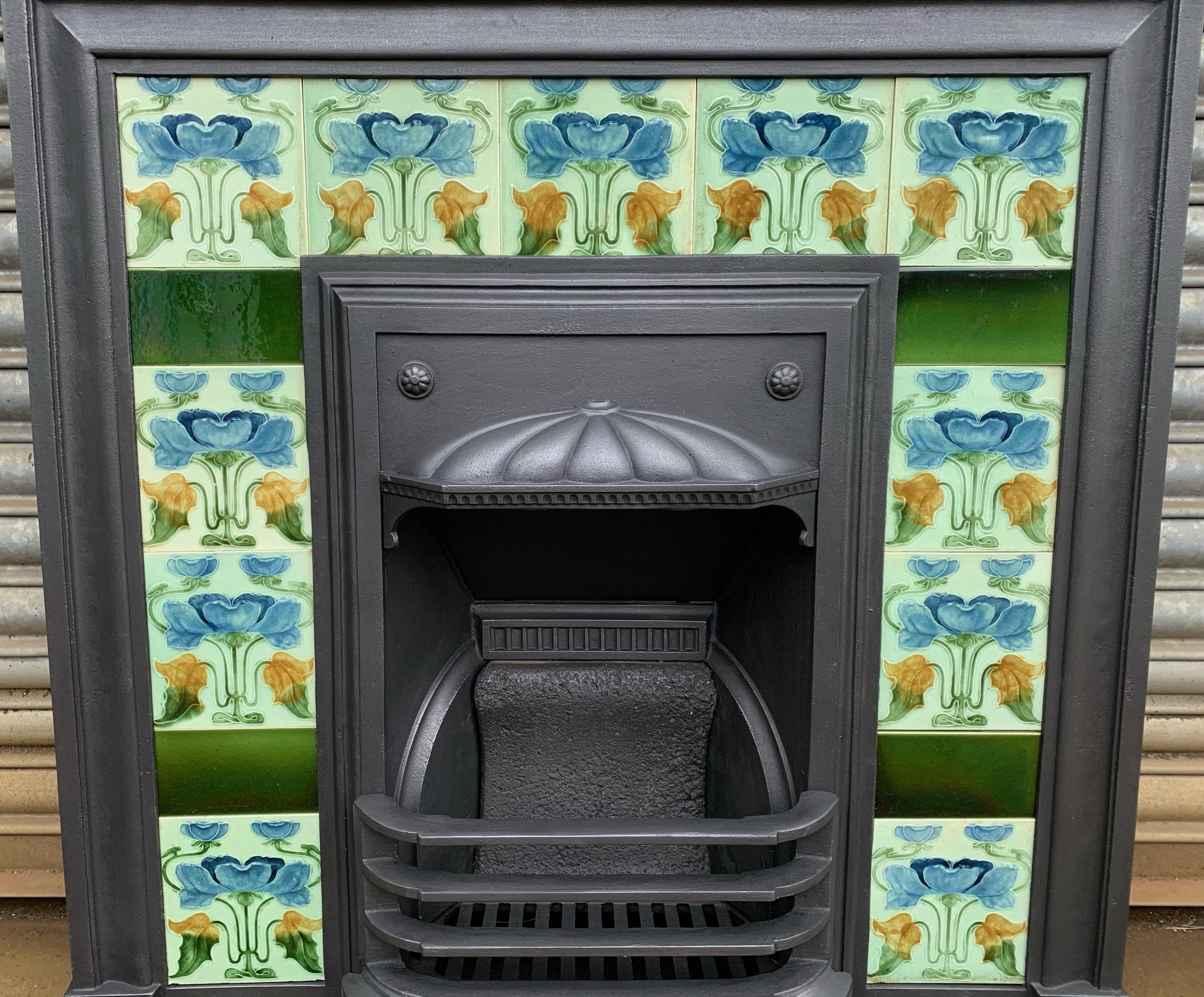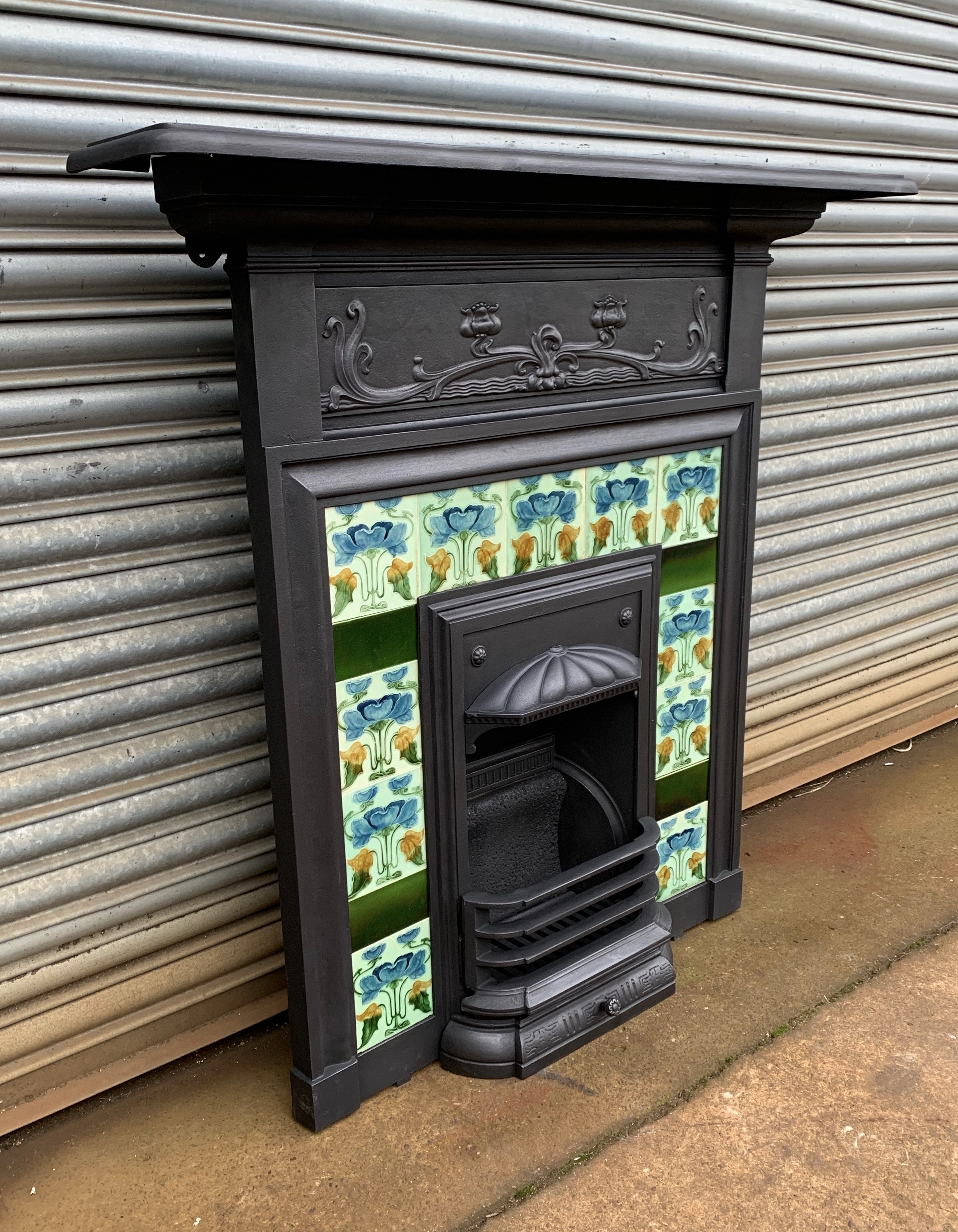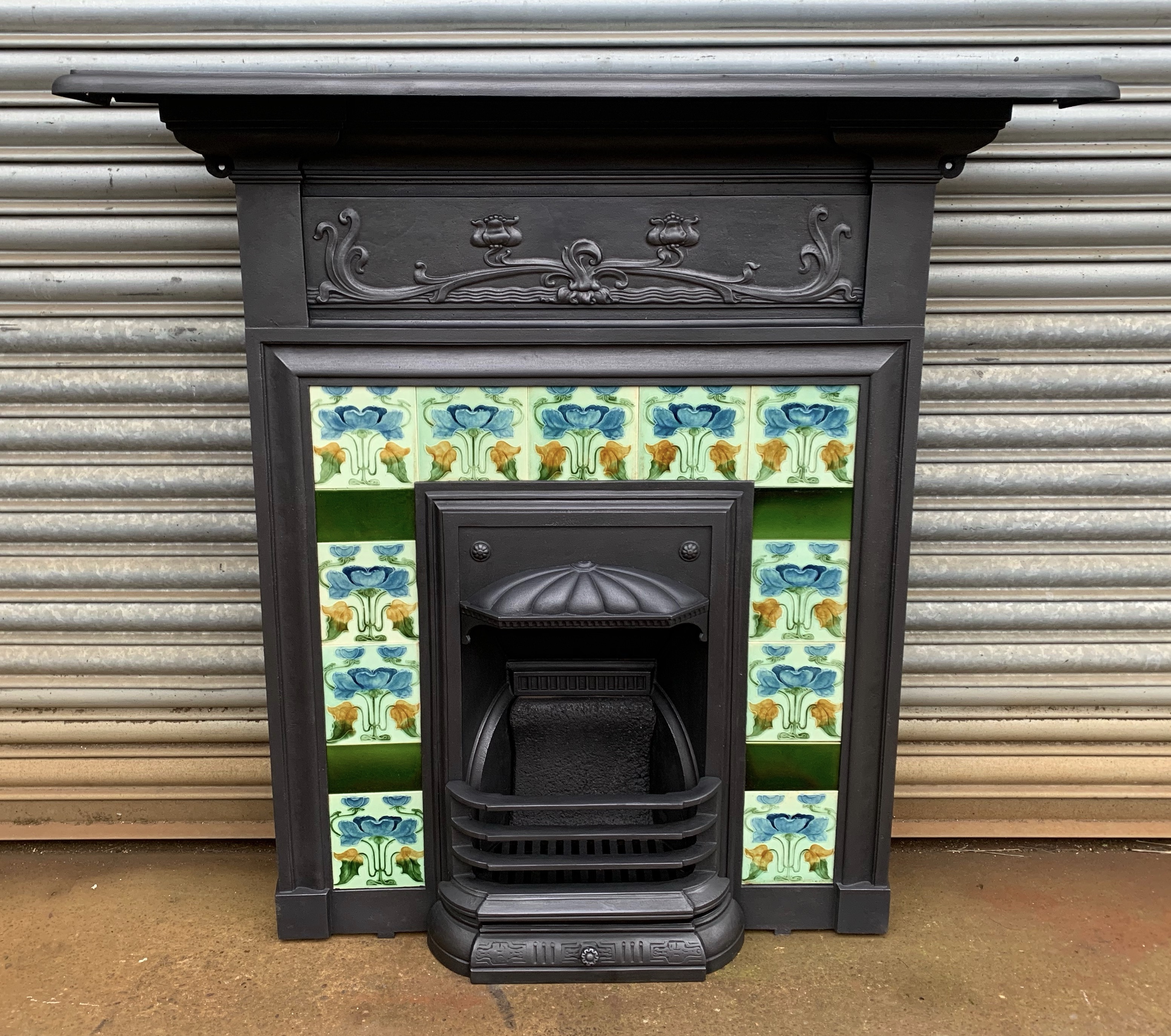 SOLD An original antique Art Nouveau cast iron combination fireplace with a stunning set of original majolica Art Nouveau tiles. Complete with original fireback and bars. Contact us on 07885 379772 or email below for more information - Delivery is available.