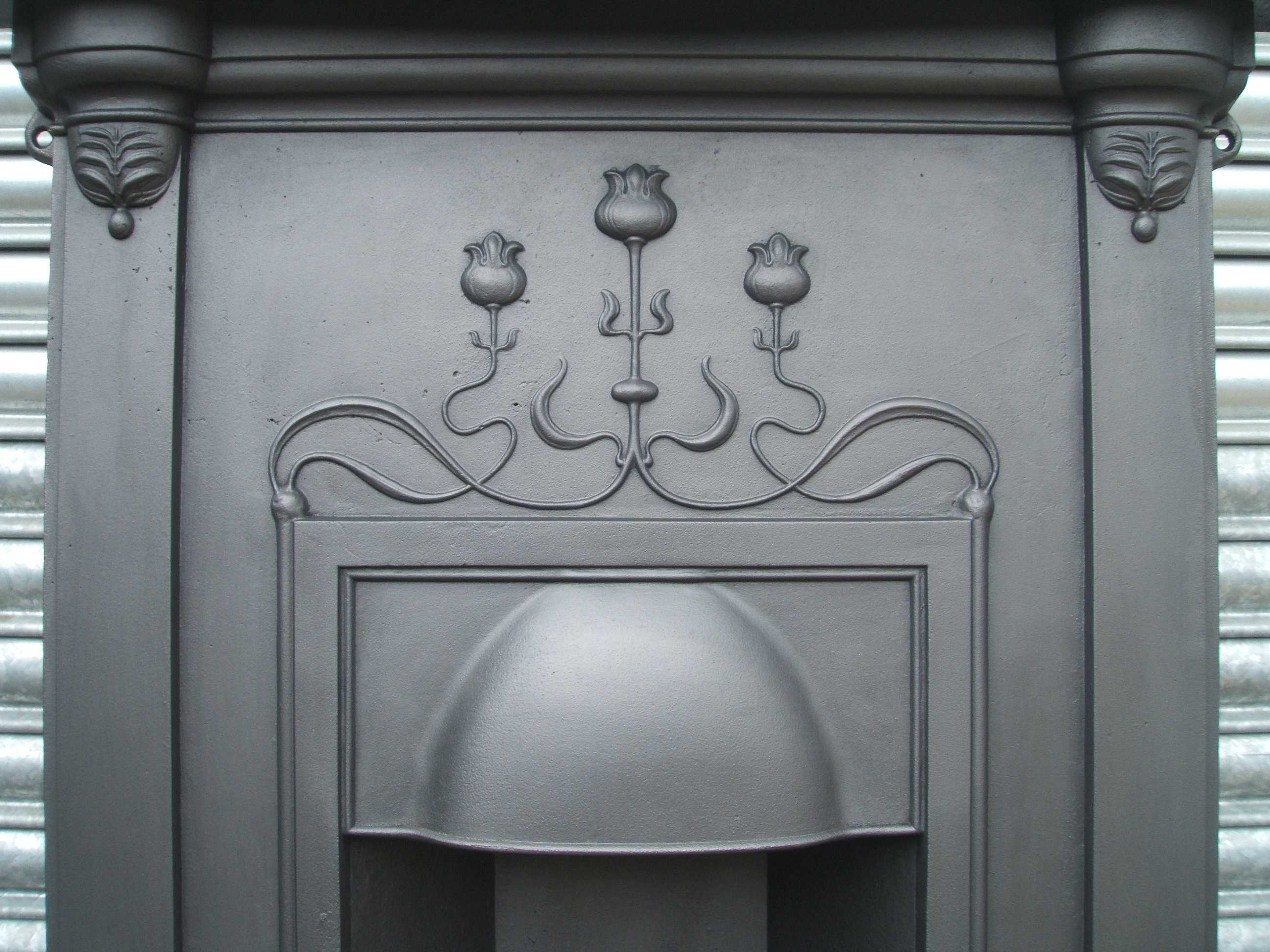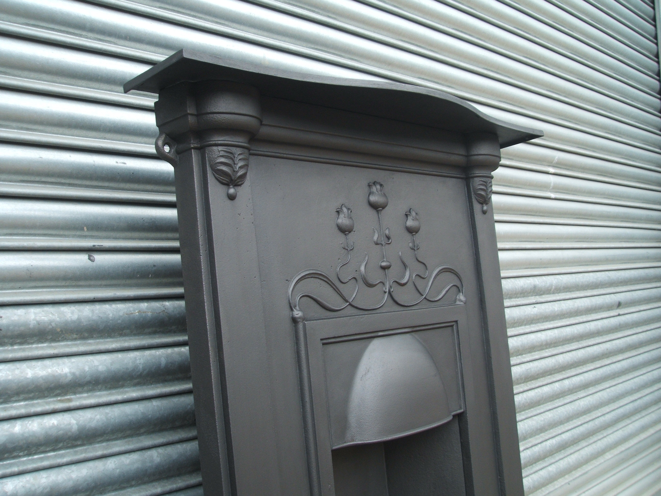 An original antique Art Nouveau cast iron combination fireplace with a pretty serpentine mantle and 3 stylised tulips across the frieze. Please email below or phone on 07885 379772 for more information. We have a similar matching fireplace awaiting restoration - Ref CF122 SOLD