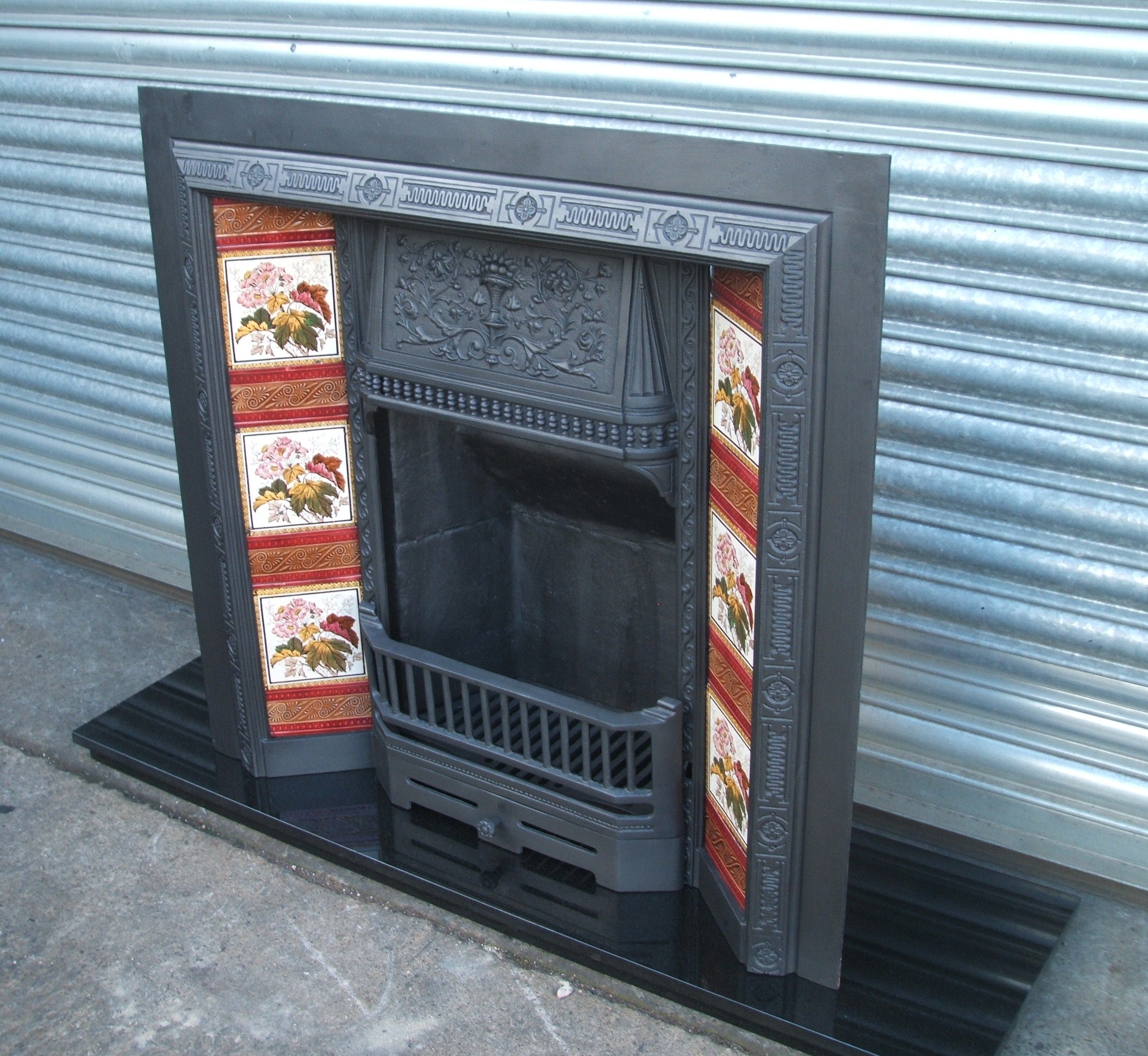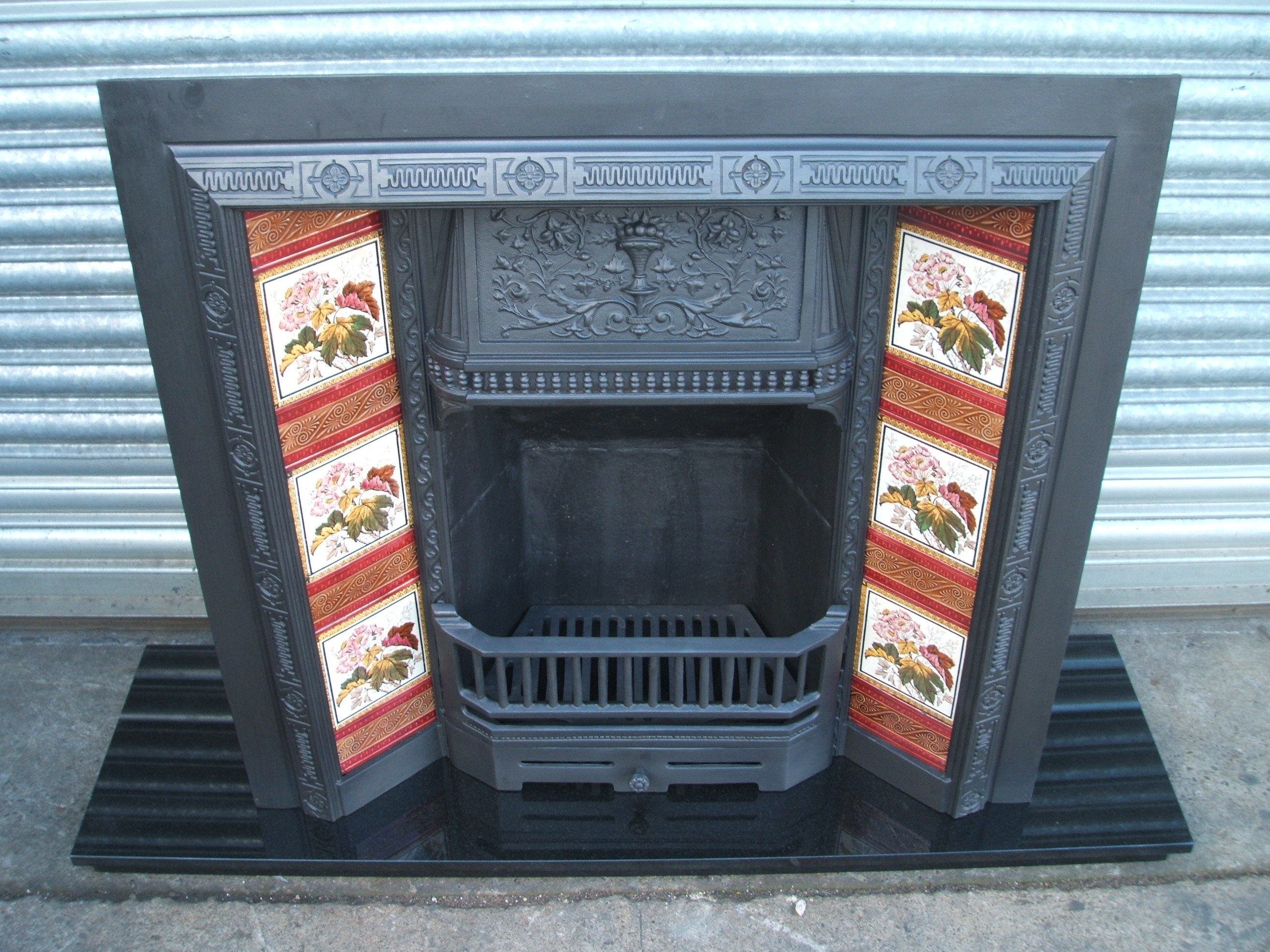 An original antique Victorian cast iron insert complete with back and bars and a set of original printed and majolica tiles. Please contact us on 07885 379772 or email us below for more information. SOLD