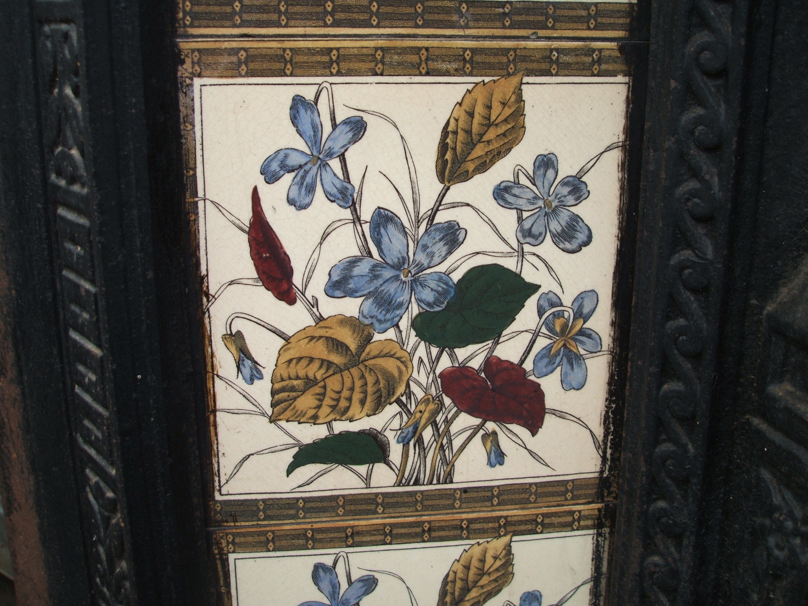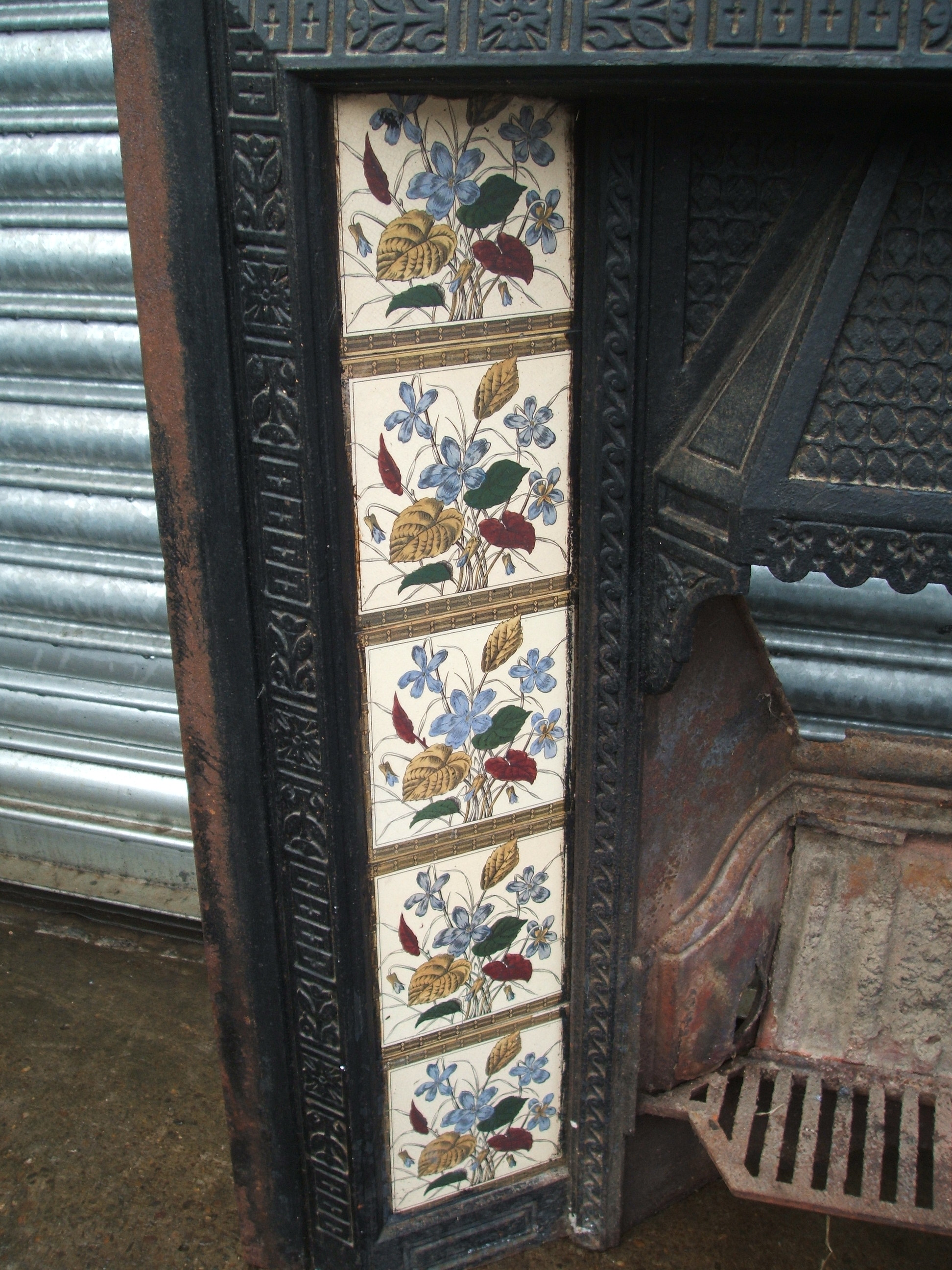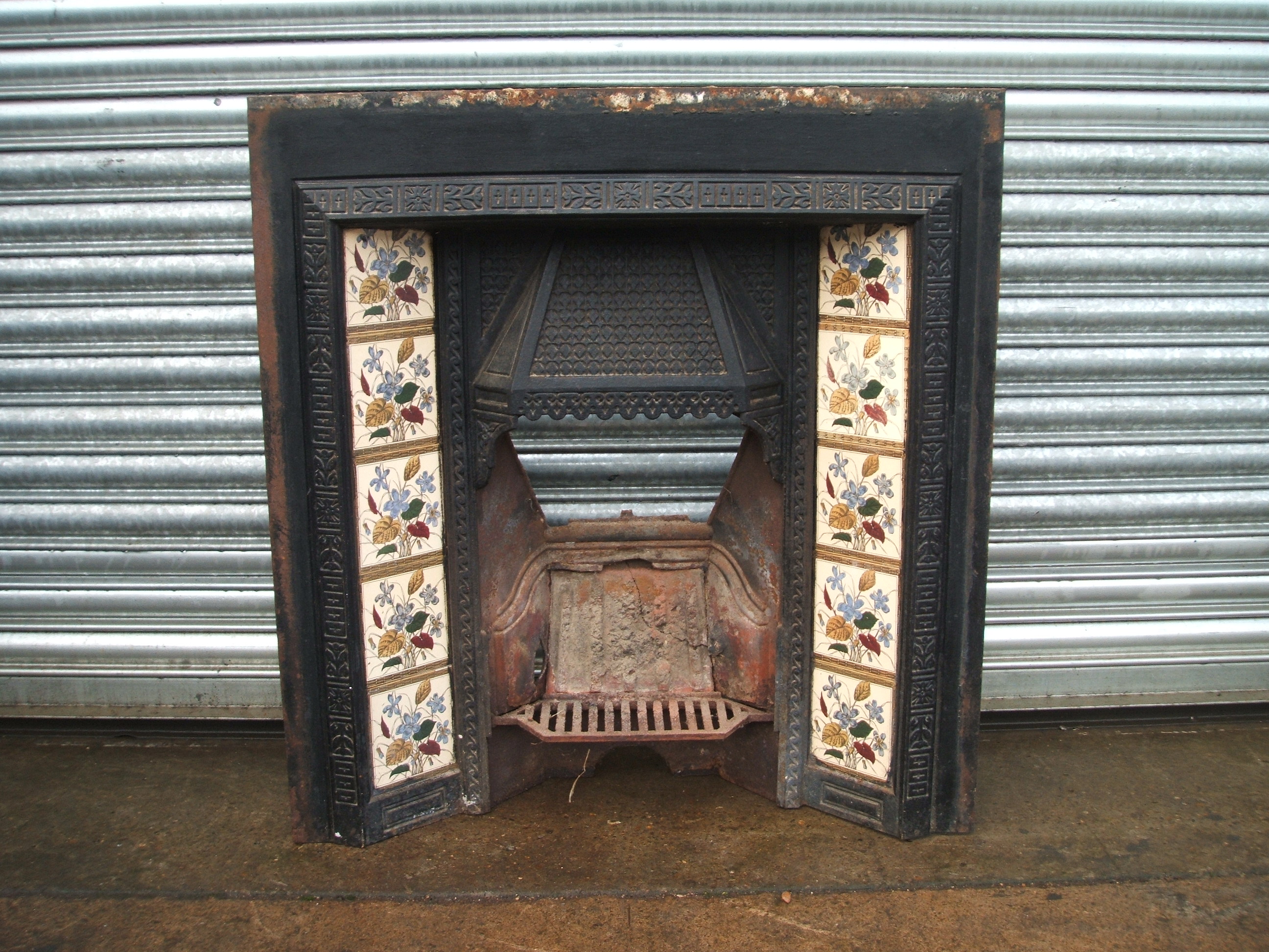 An original antique Victorian cast iron fireplace insert complete with an original set of printed tiles. AWAITING RESTORATION. Please contact us on 07885 379772 or email below for more information.