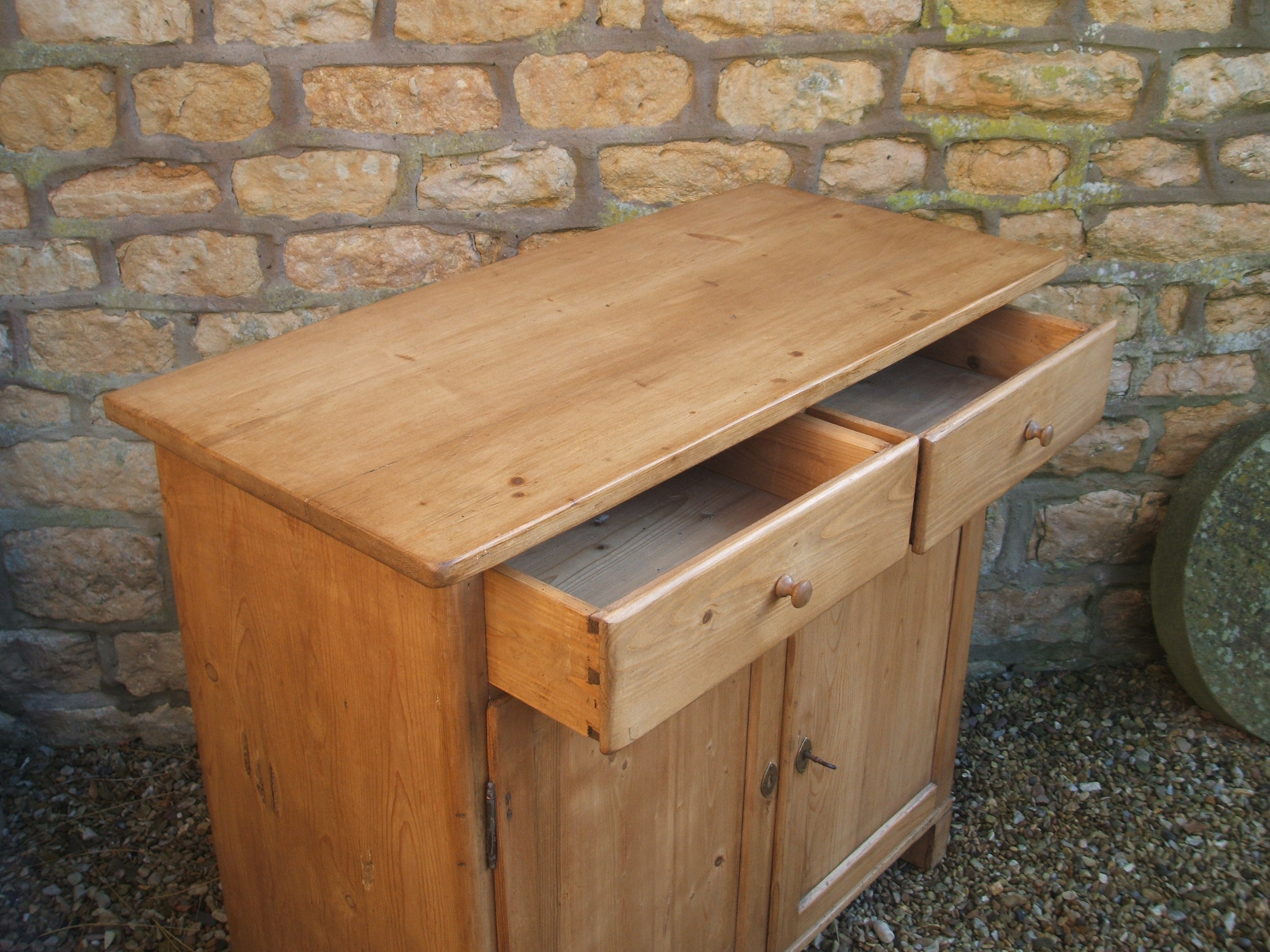 An original antique solid pine cupboard with 2 draawers above a 2 door cupboard with a solid pine shelf that is removable if required. Original knobs and key. Contact us on 07885 379772 or email below for more information. Delivery is available. SOLD