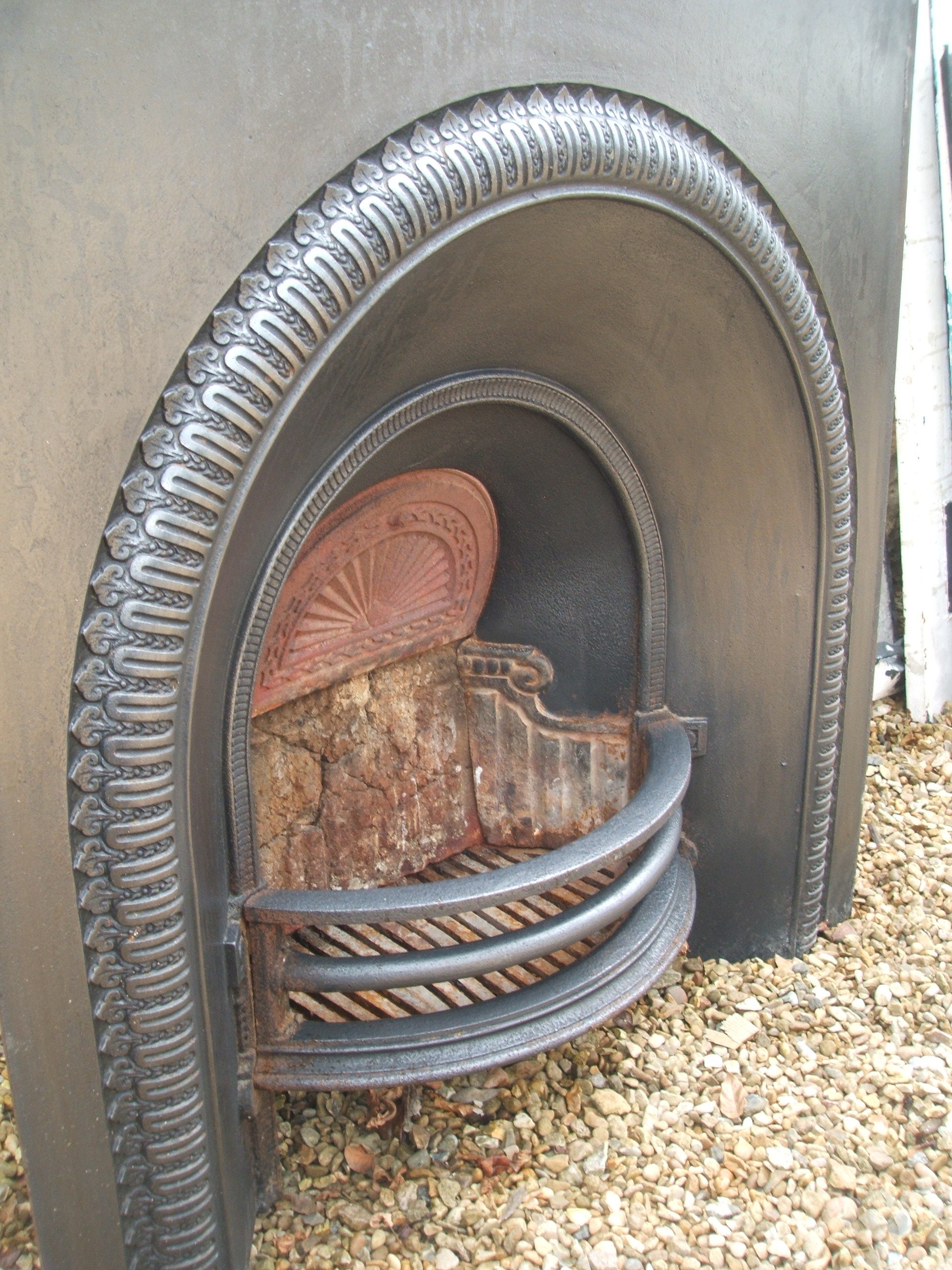 An original antique Victorian cast iron arched fireplace insert with a large size burning area. AWAITING RESTORATION Please contact us on 07885 379772 or email below for more information. SOLD