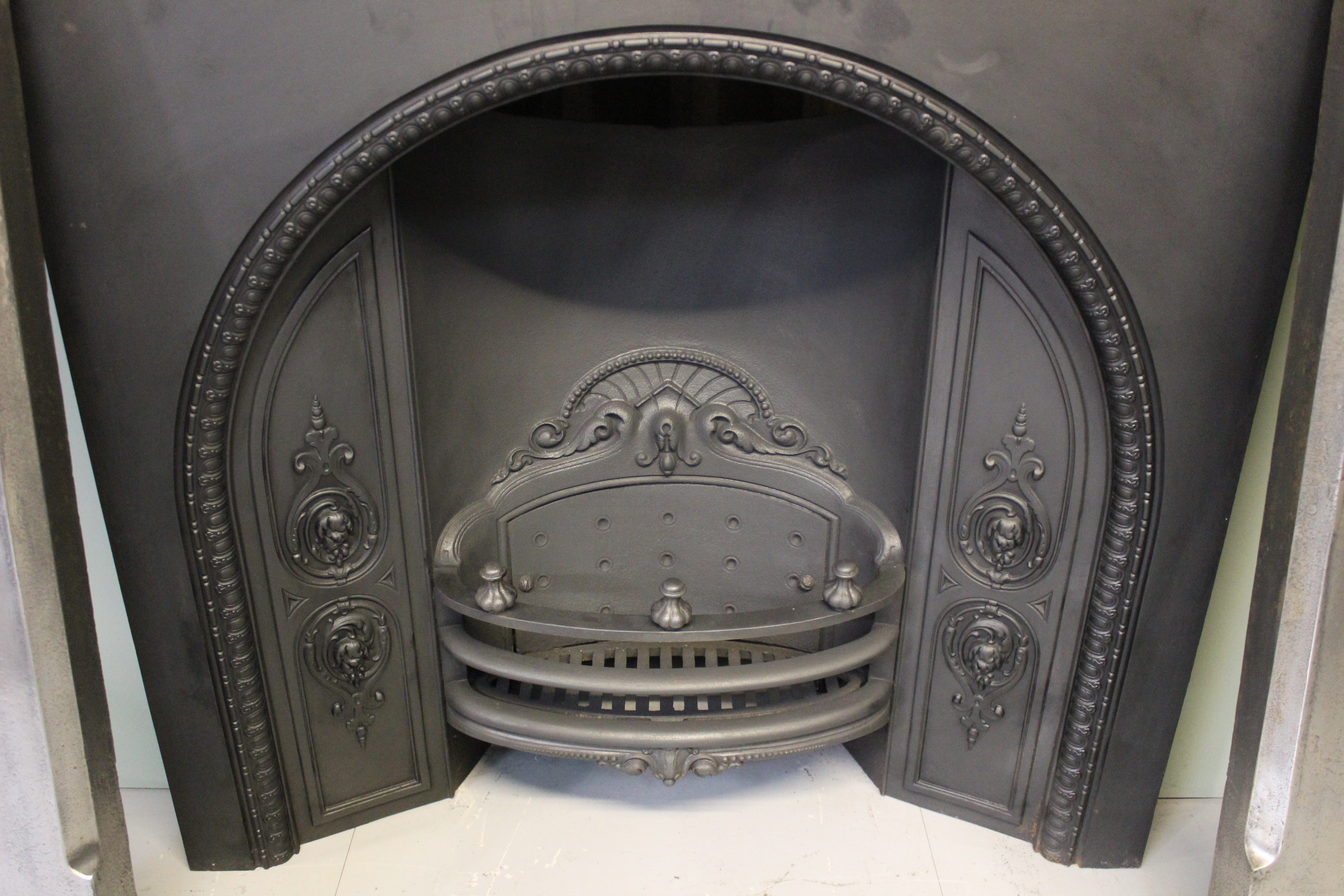 An original antique mid Victorian cast iron arched fireplace insert. SOLD