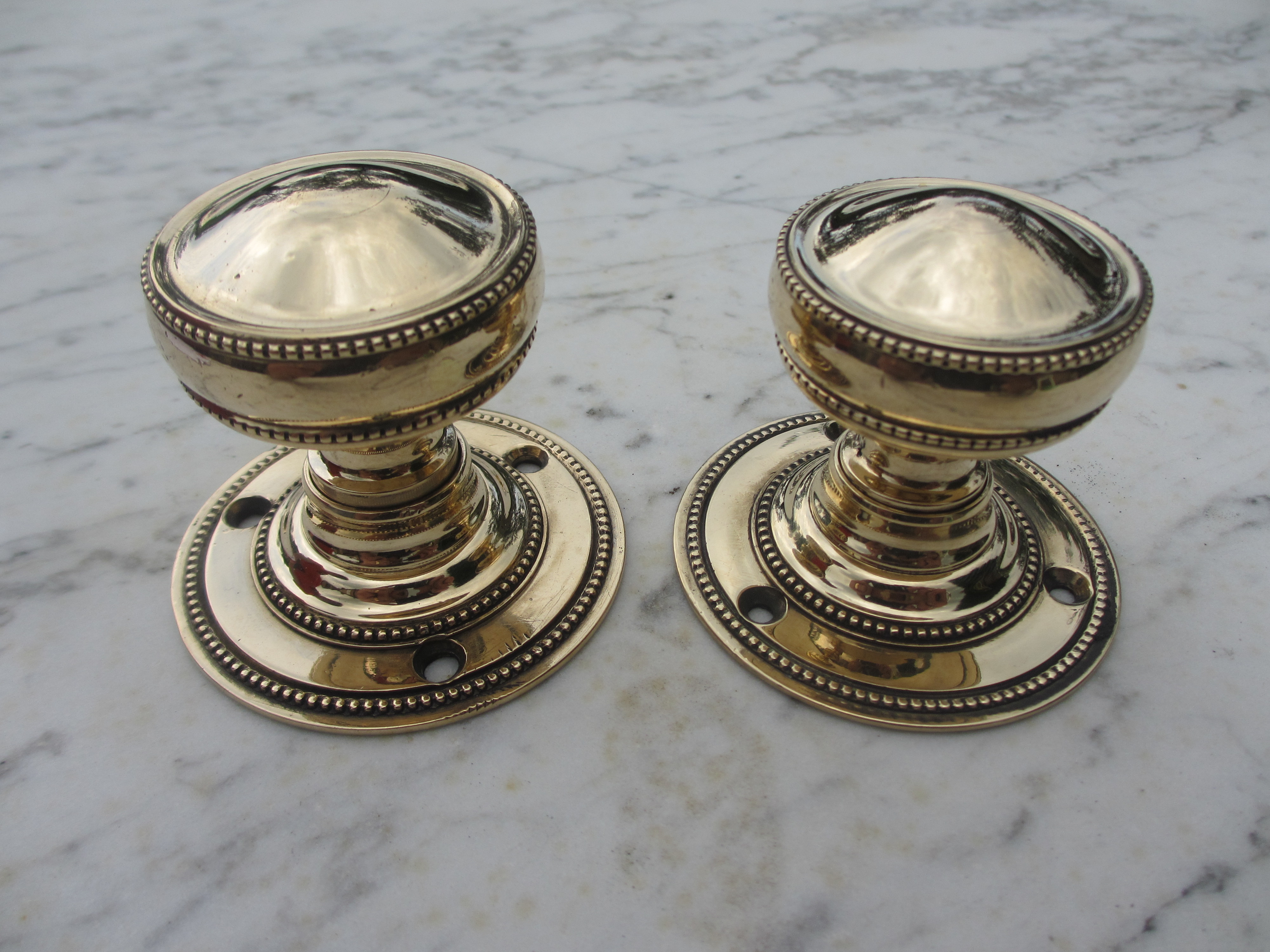 An original antique pair of rose brass door knobs with bead decor and back plates. Contact us on 07885 379772 or email below for more information. SOLD