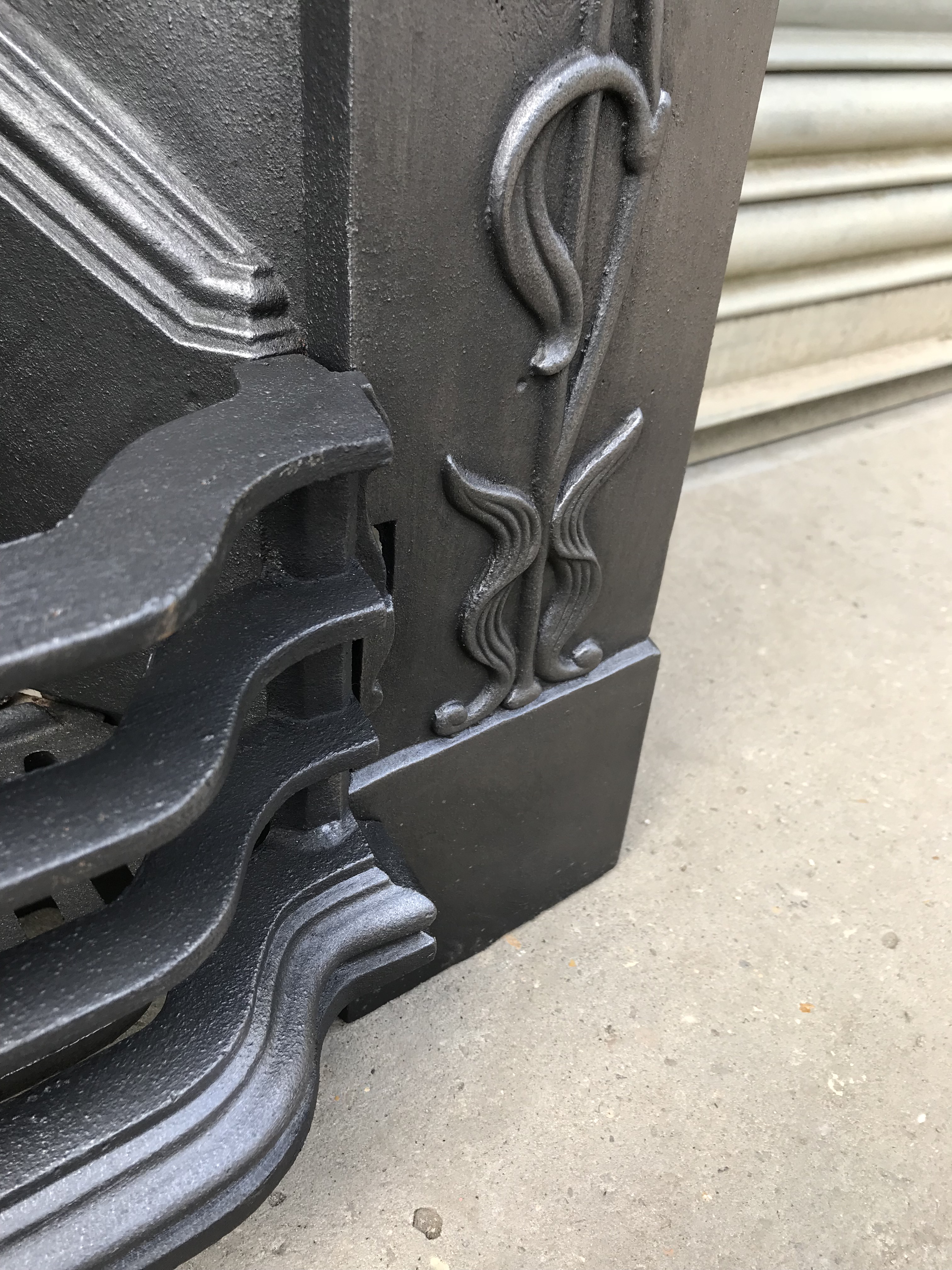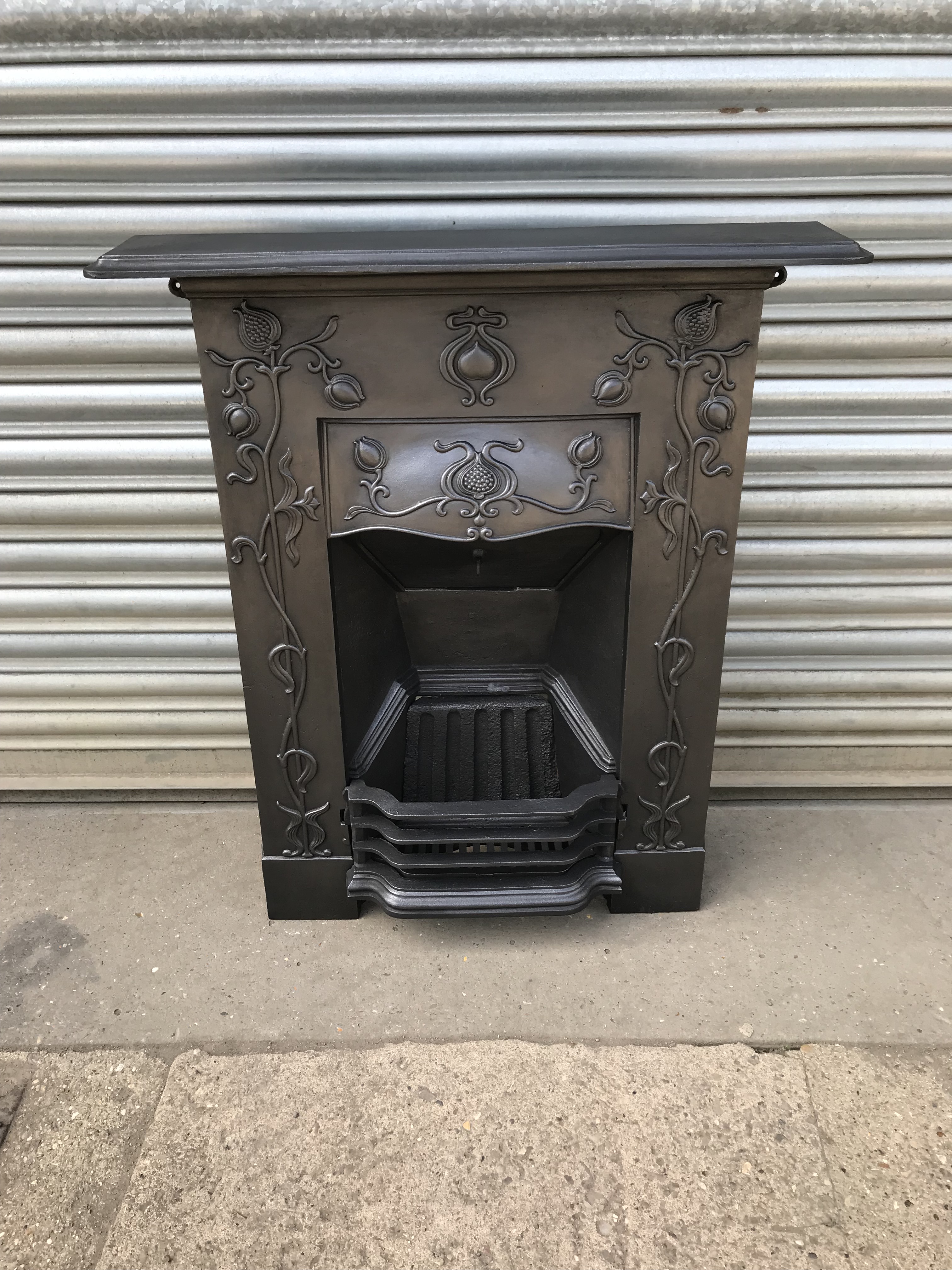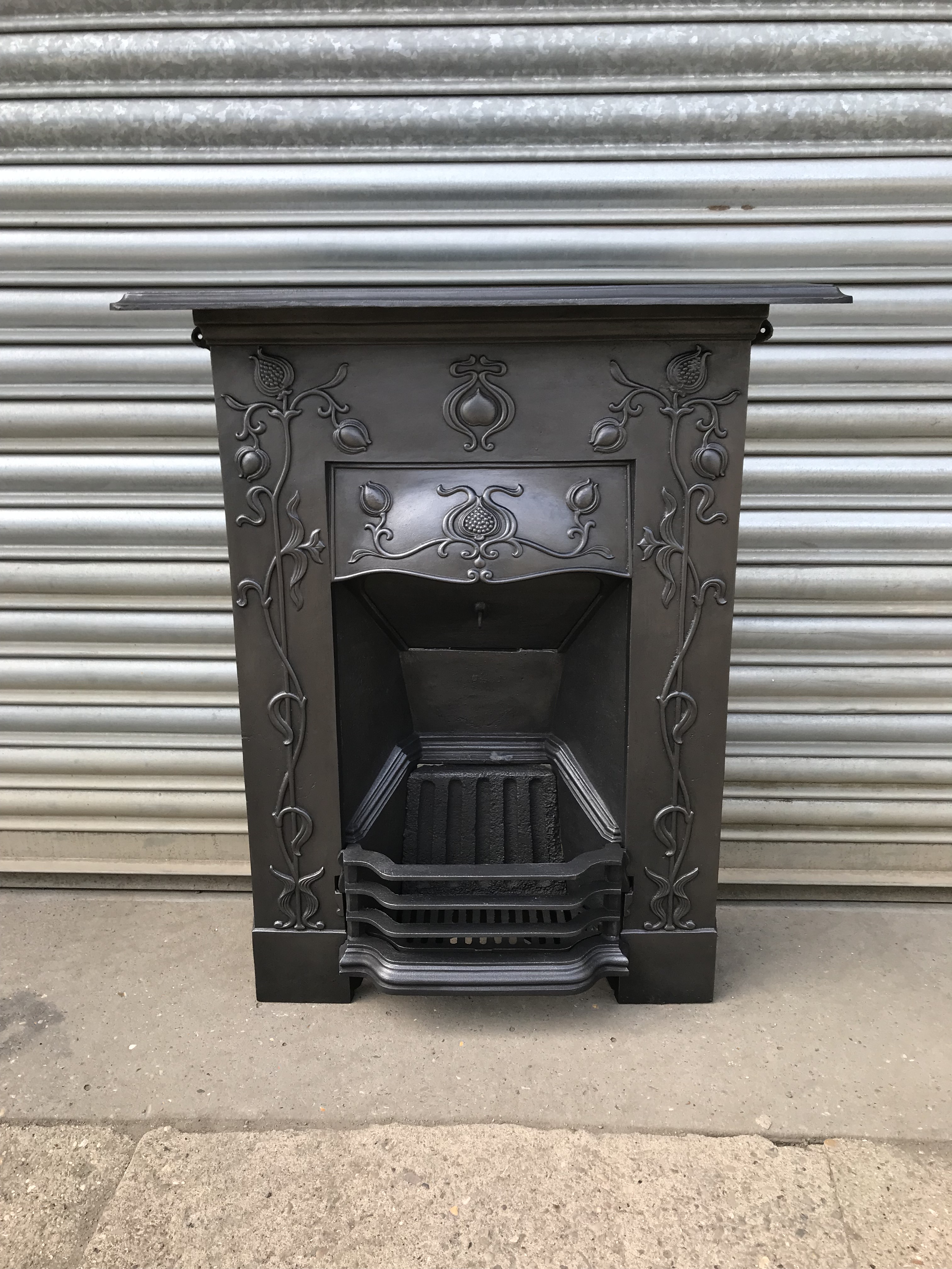 SOLD An original antique Art Nouveau cast iron combination bedroom fireplace complete with original fire back, damper flap and bars. Stunning trailing foliage and seed heads. Contact us on 07885 379772 or email below for more information or to purchase.
