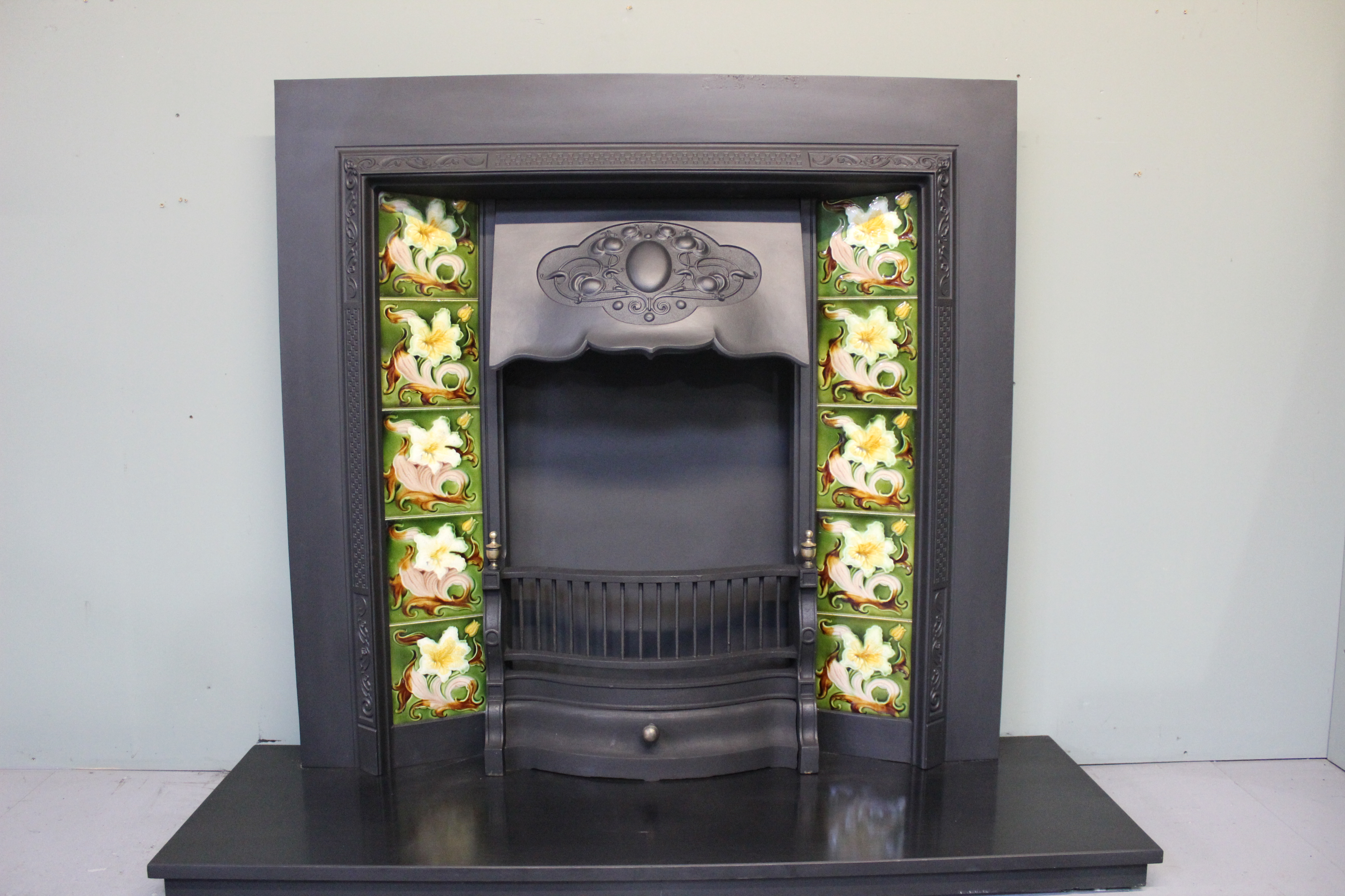 SOLD An original antique Art Nouveau cast iron insert complete with a gorgeous set of 10 original Art Nouveau majolica tiles. Contact us on 07885 379772 or email below for more information.