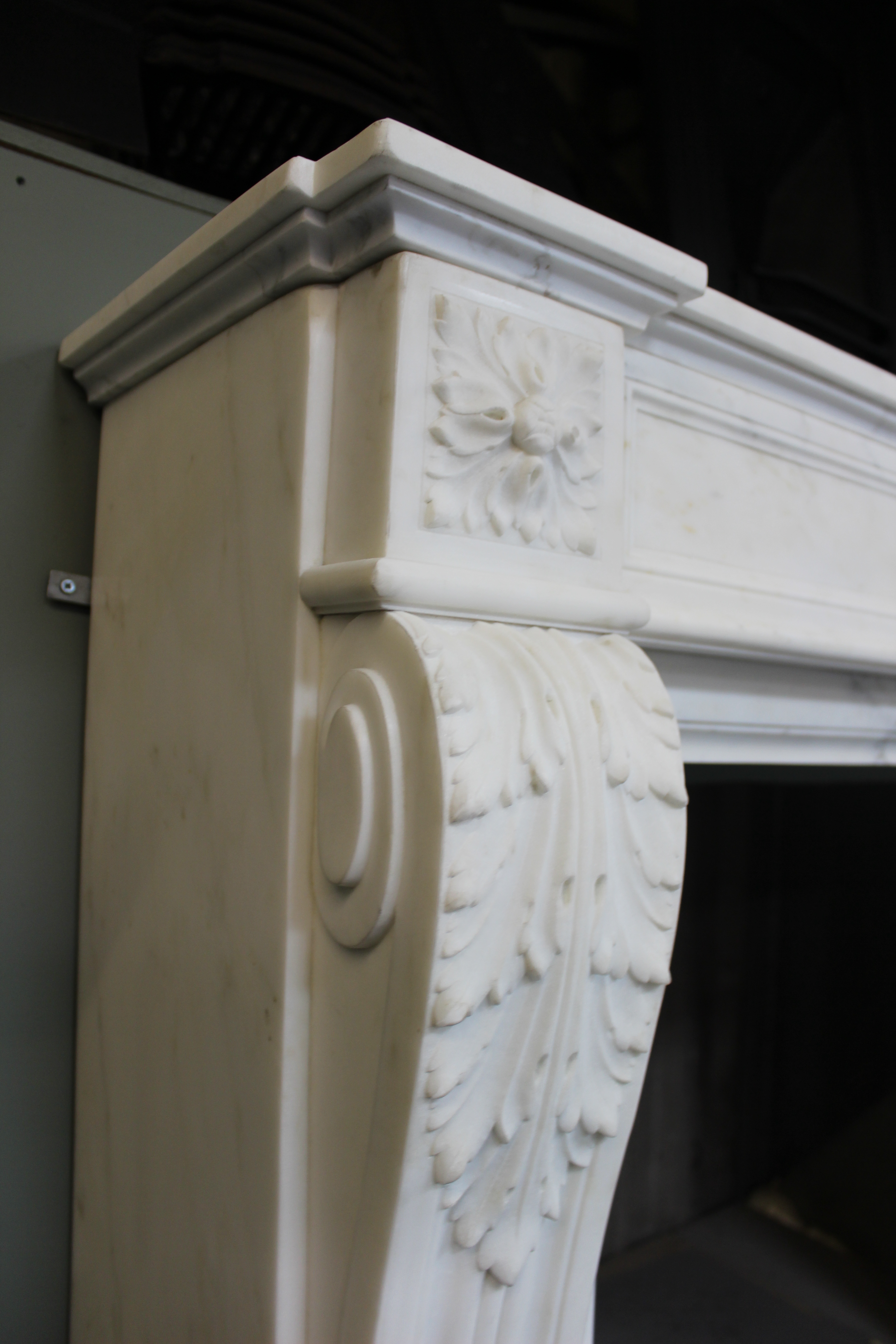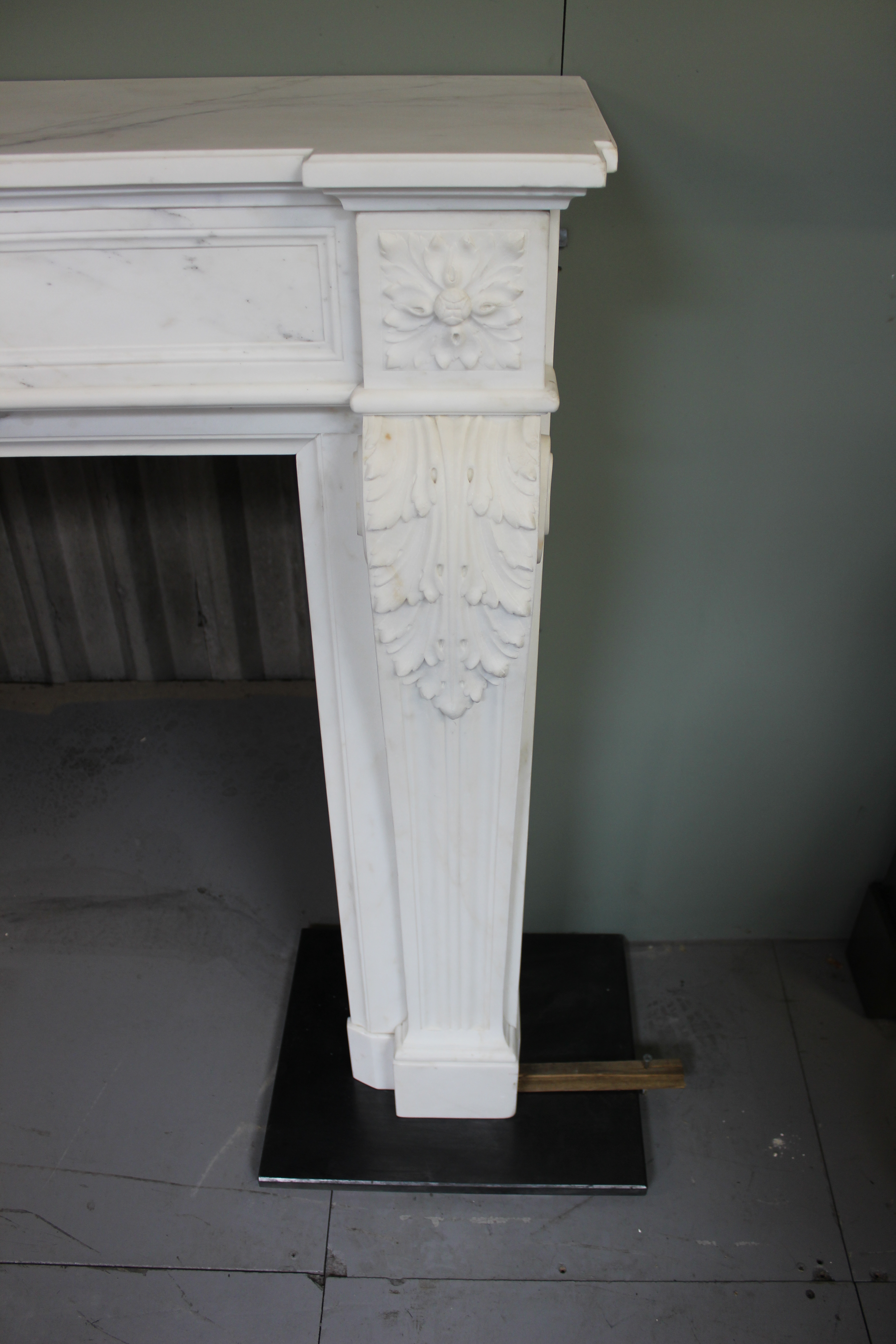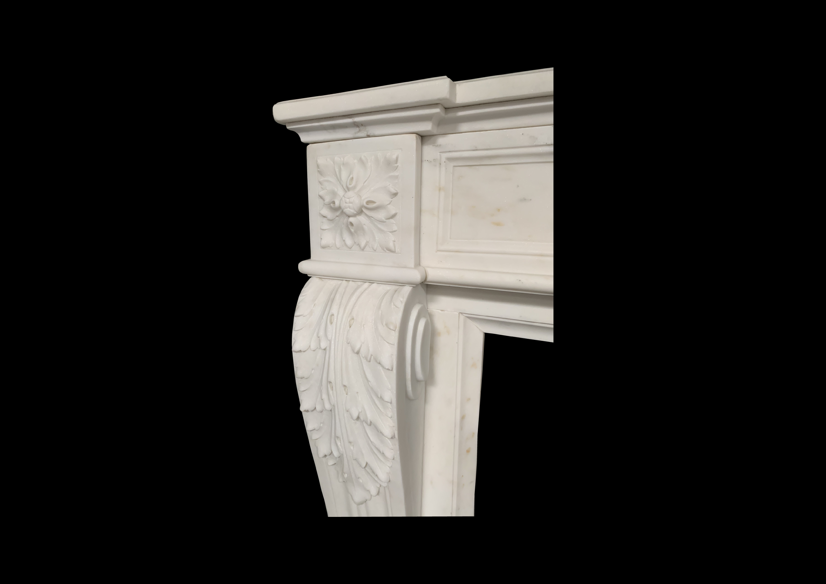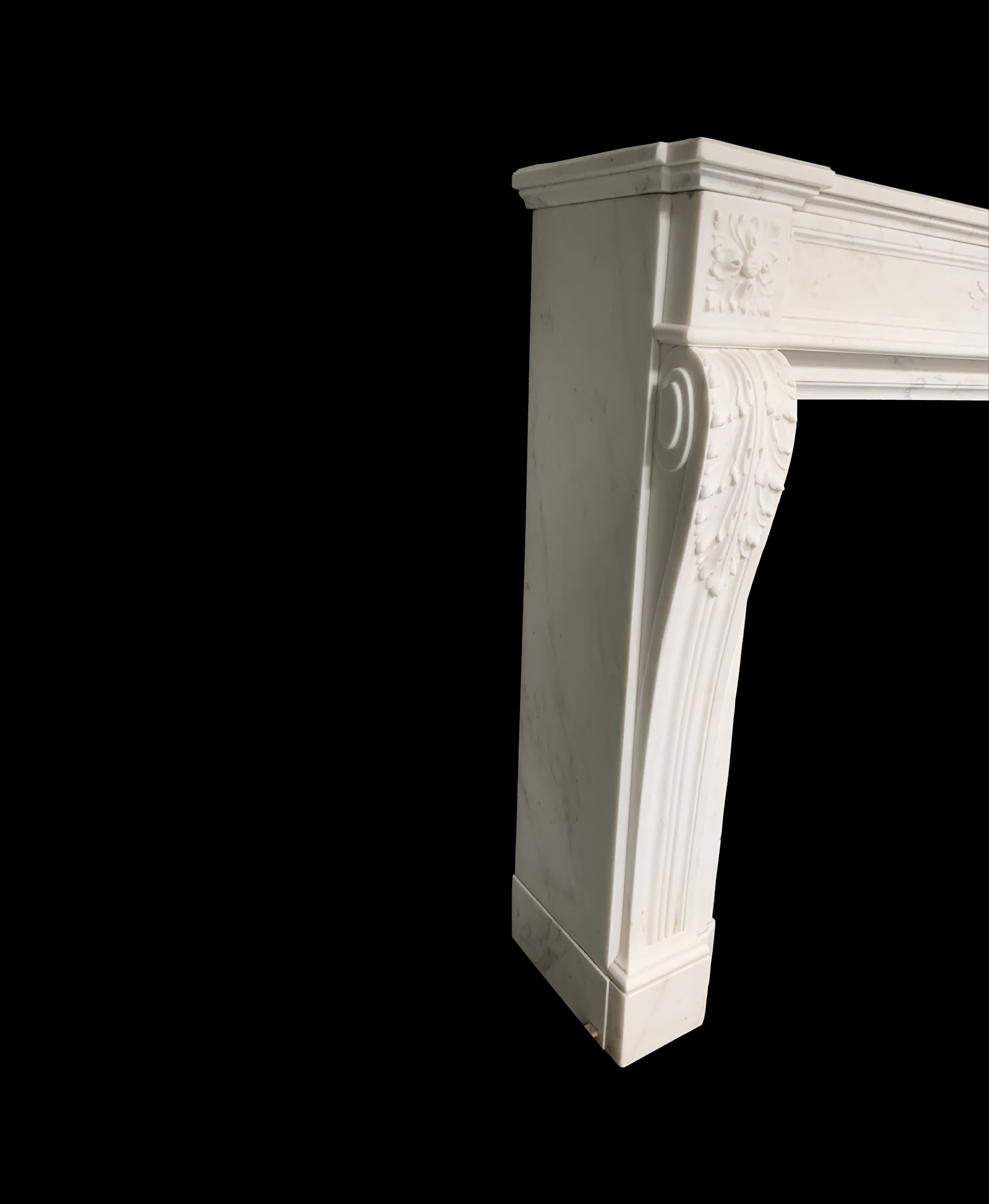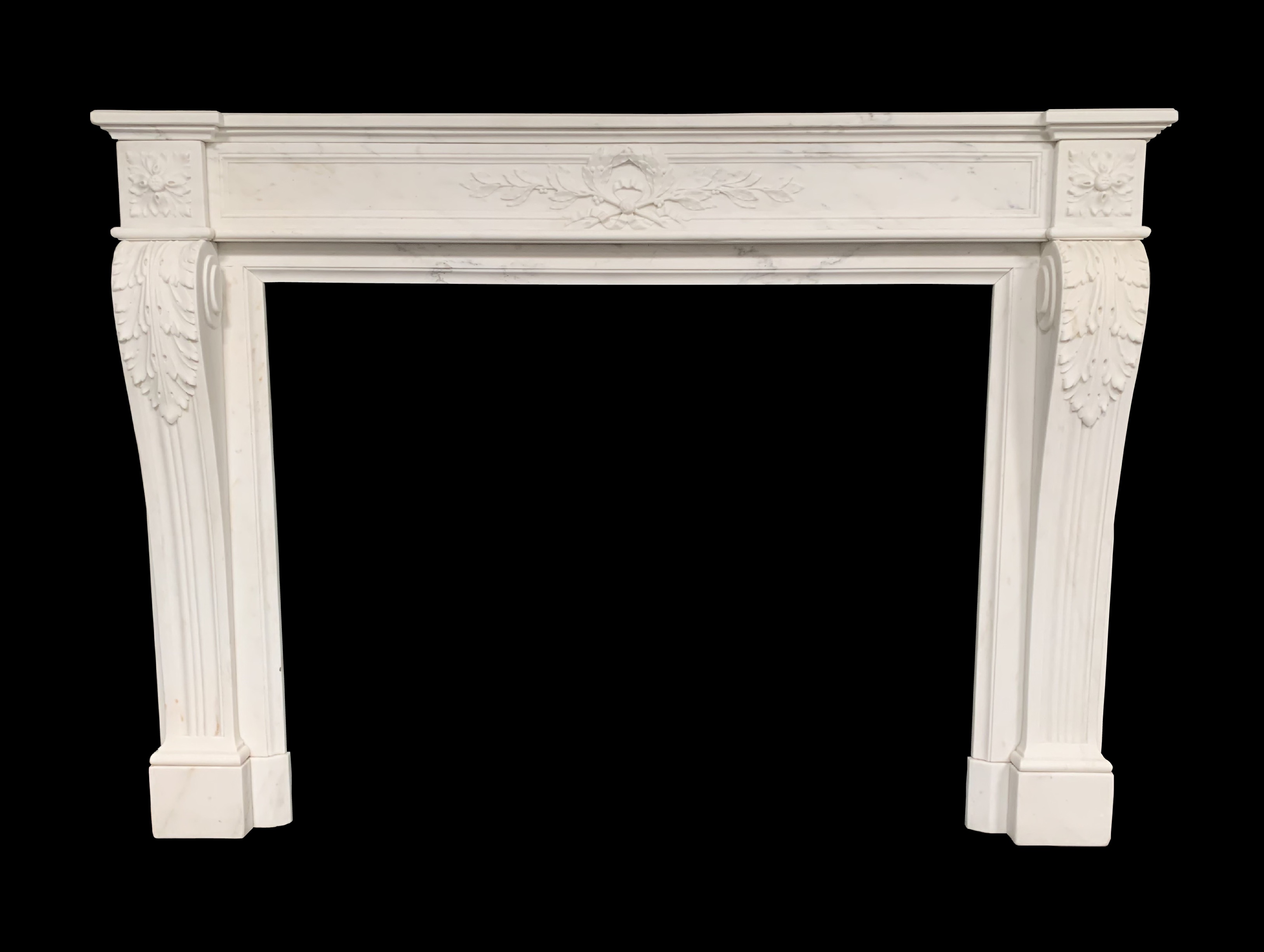 An original antique Louis XVI chimney piece in statuary marble. The panelled frieze has a central laurel wreath with olive branches, flanked by square floral paterae above scrolled acanthus leaves over the jambs. Contact us on 07885 379772 or message below to ask any questions or to view or purchase.