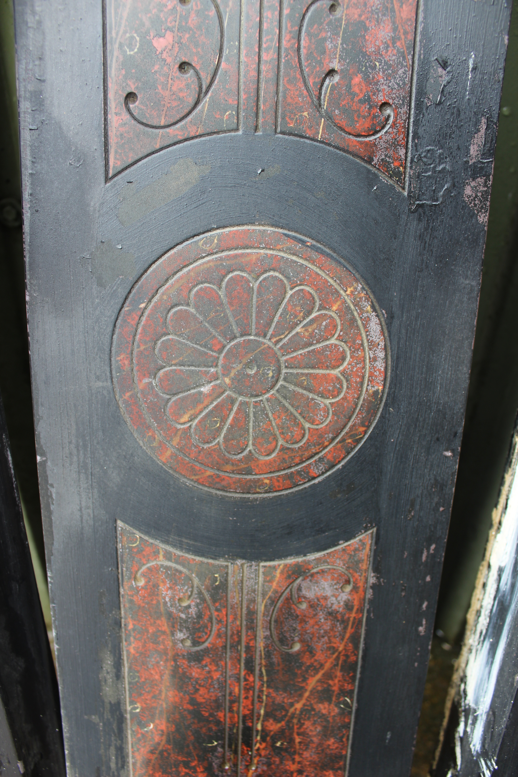 A slate fire surround with ornate shape corbels with ceramic roundels. AWAITING RESTORATION. Contact us on 07885 379772 or email below for more information.