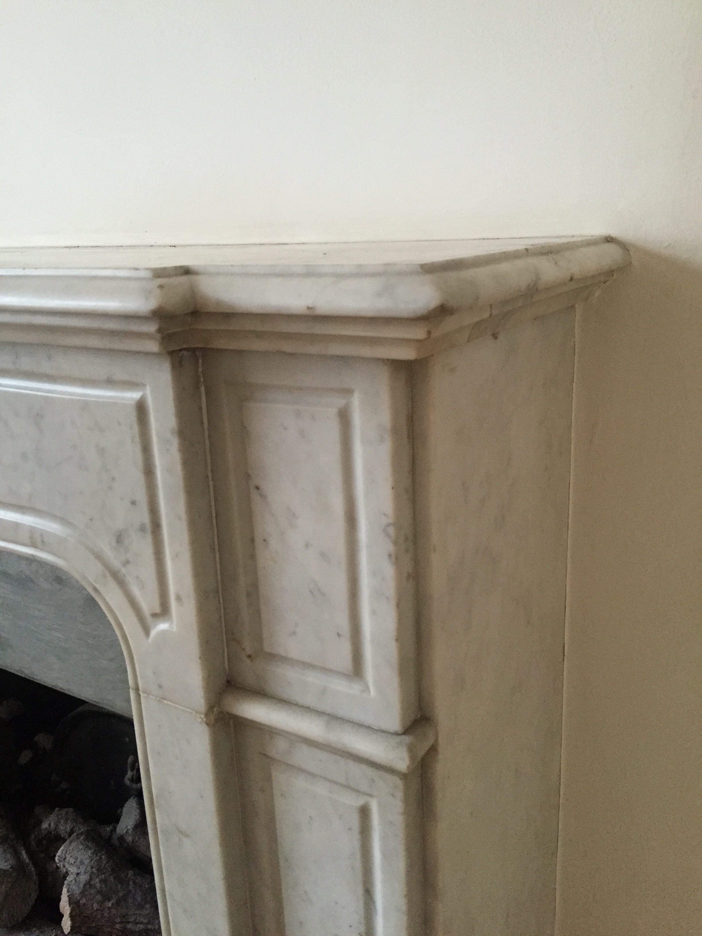 SOLD An original antique 19th century French carrara marble fireplace with breakfront mantle shelf and mouldings to the jambs and frieze. A beautiful design. The first photo is now it has been cleaned. Some of the Photos were taken prior to cleaning. Contact us on 07885 379772 or email below for more information.