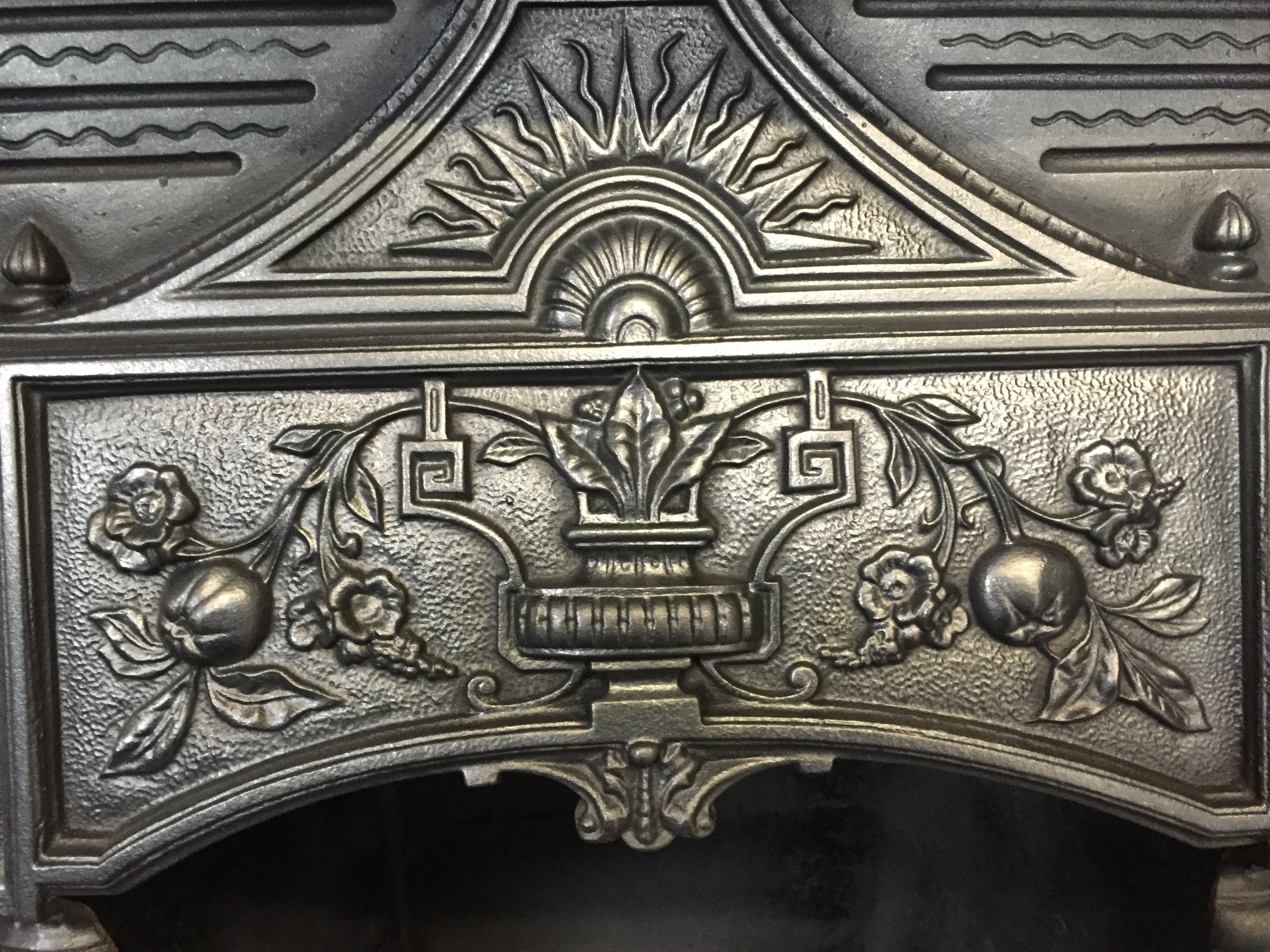 SOLD An original antique Victorian cast iron insert with casting of sunburst, fruit and flowers and would be complete with a set of 10 tiles. AWAITING RESTORATION Contact us on 07885 379772 or email below for more information.