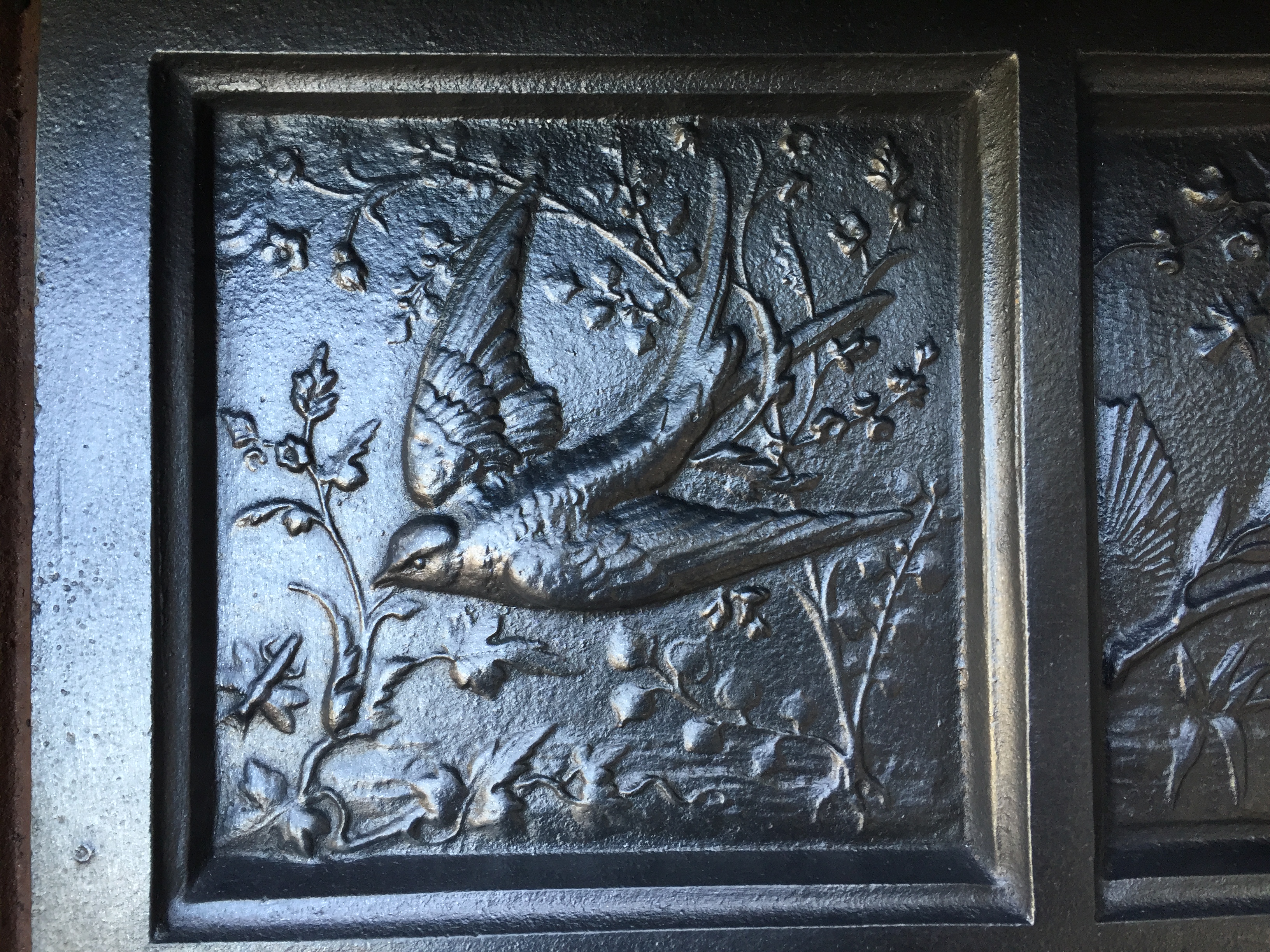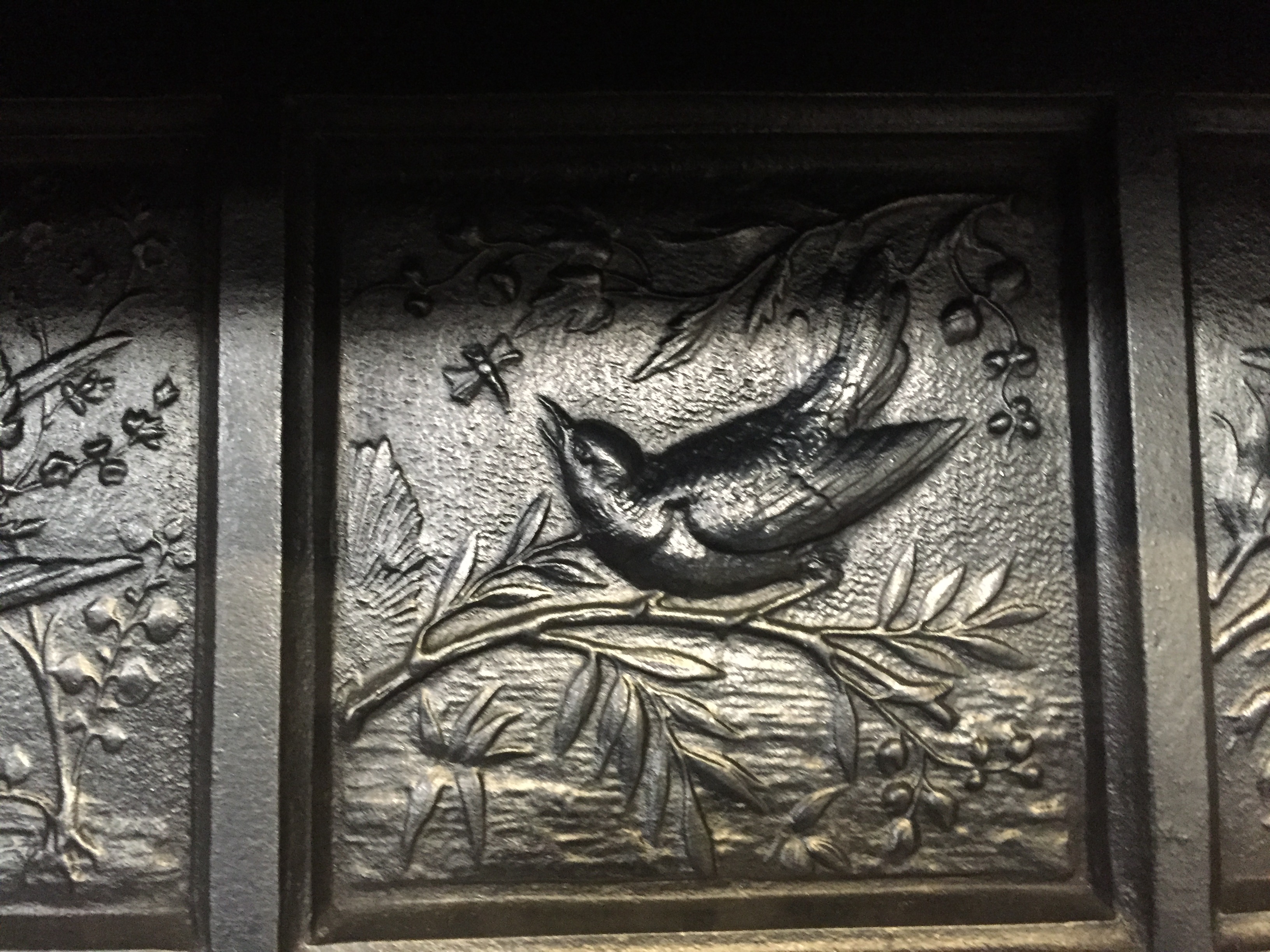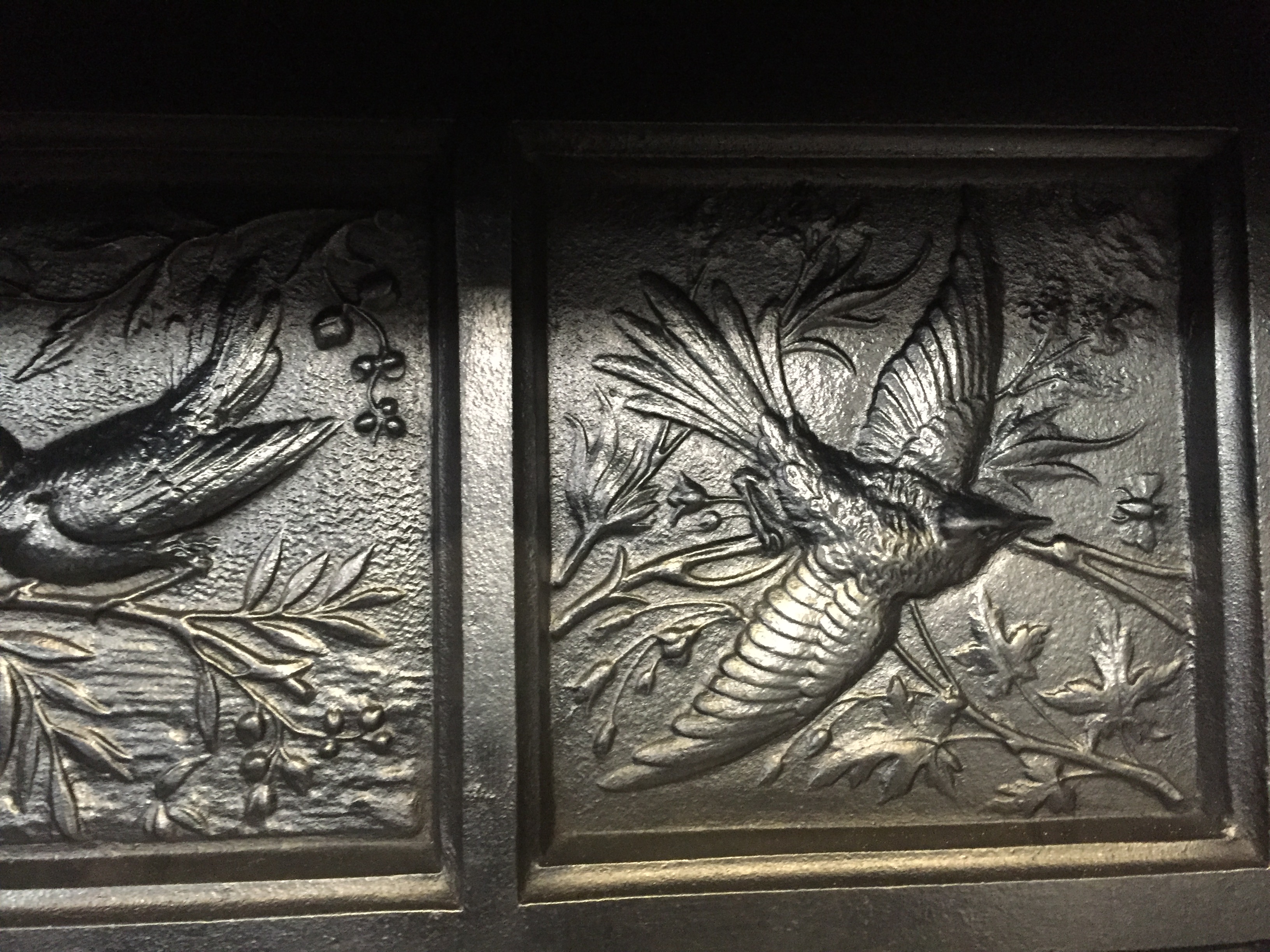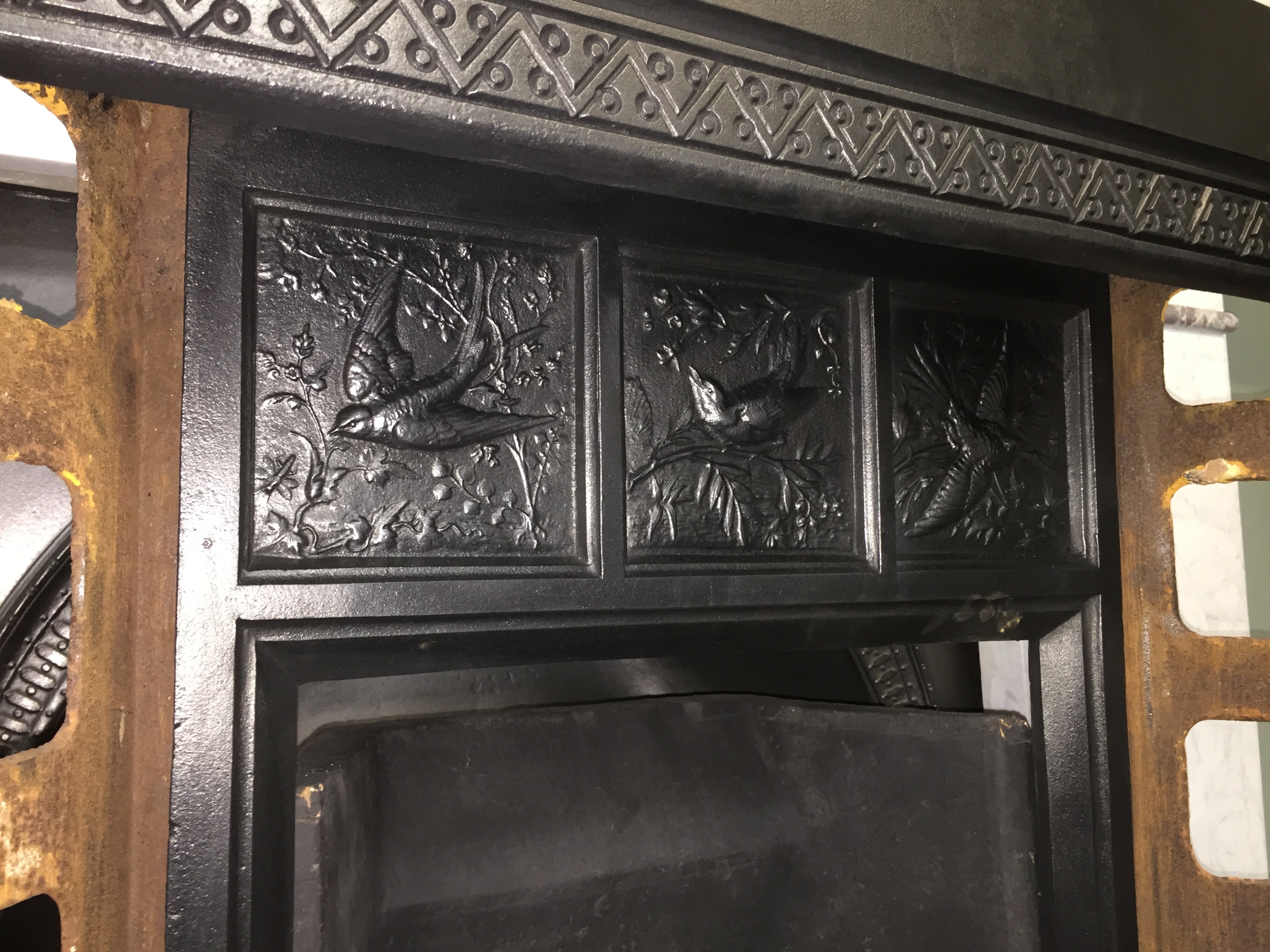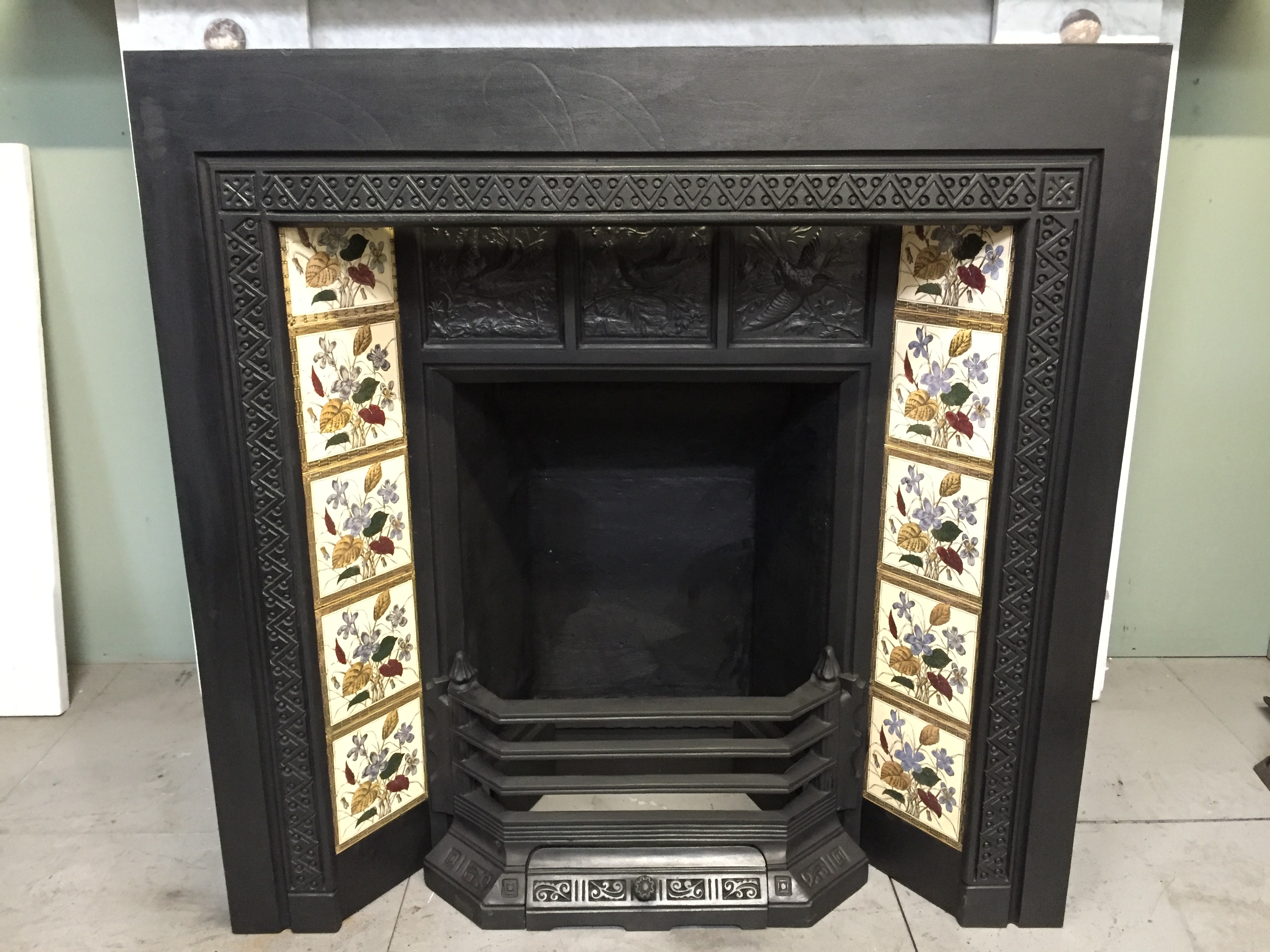 SOLD An original antique Victorian cast iron insert with stunning crisp casting to the hood of 3 birds and would be completed with an original set of tiles of your choice. The tiles shown in these photos have sold but we have many other sets to choose from to suit your decor. AWAITING RESTORATION Contact us on 07885 379772 or email below for more information.