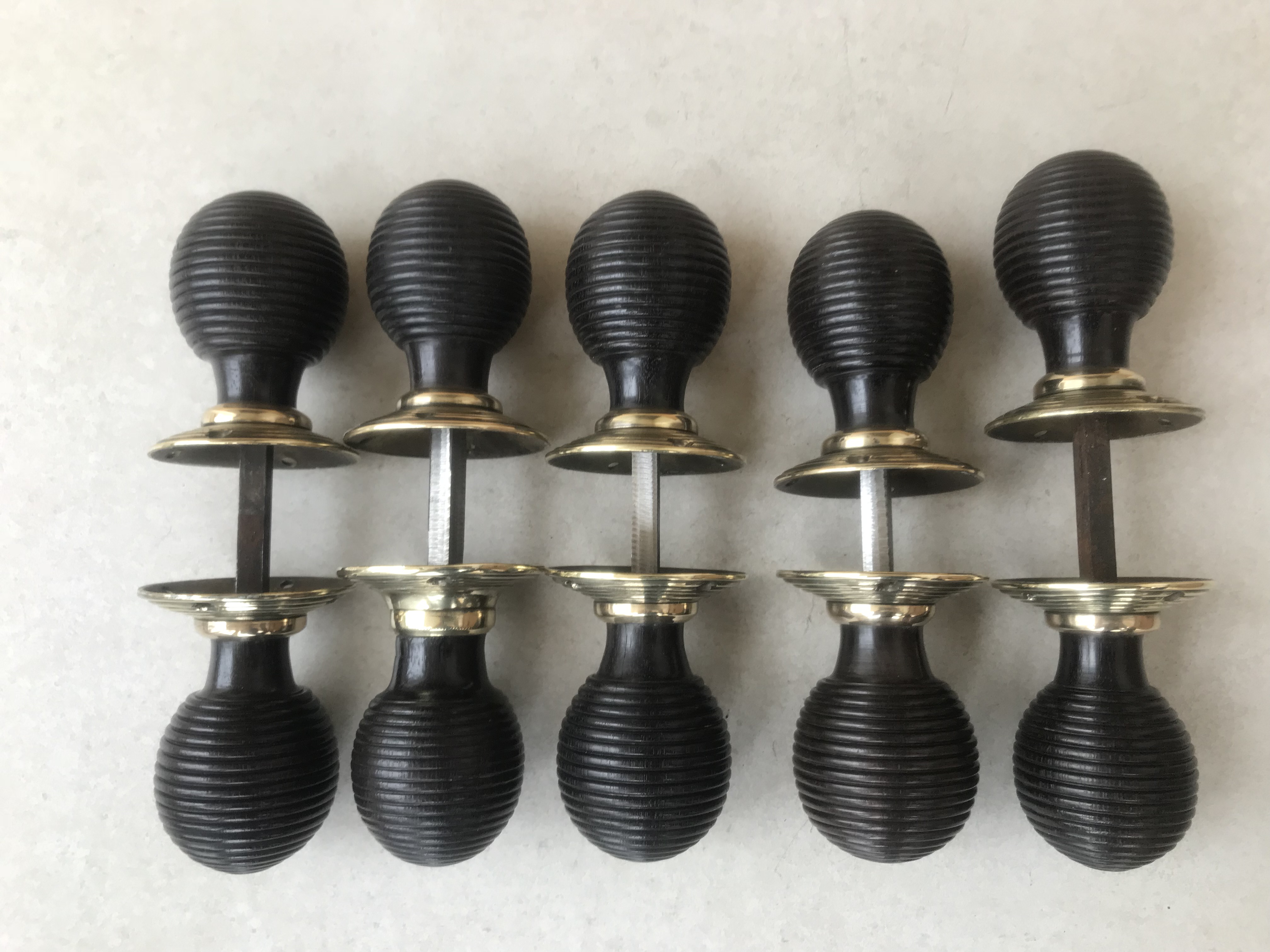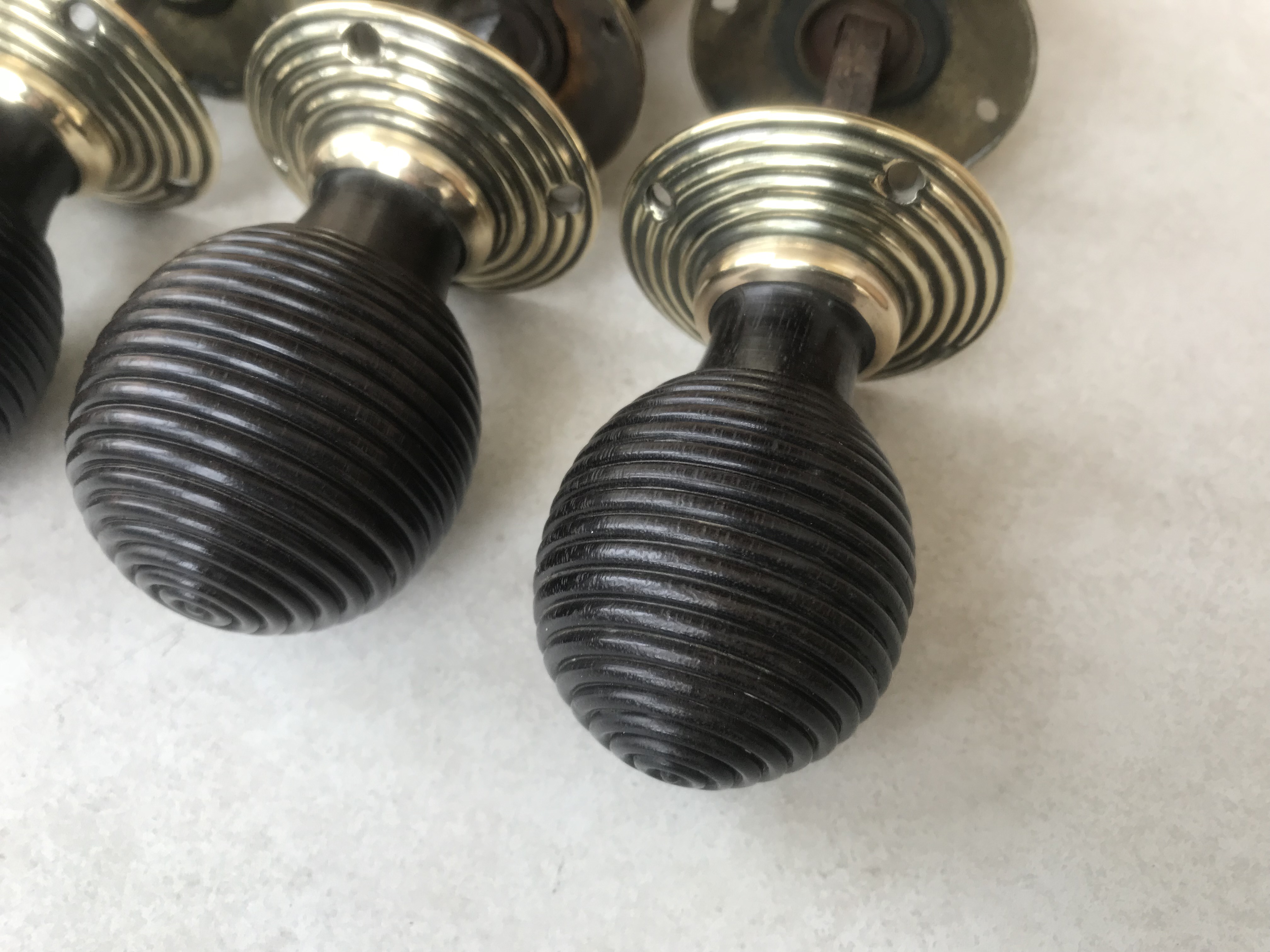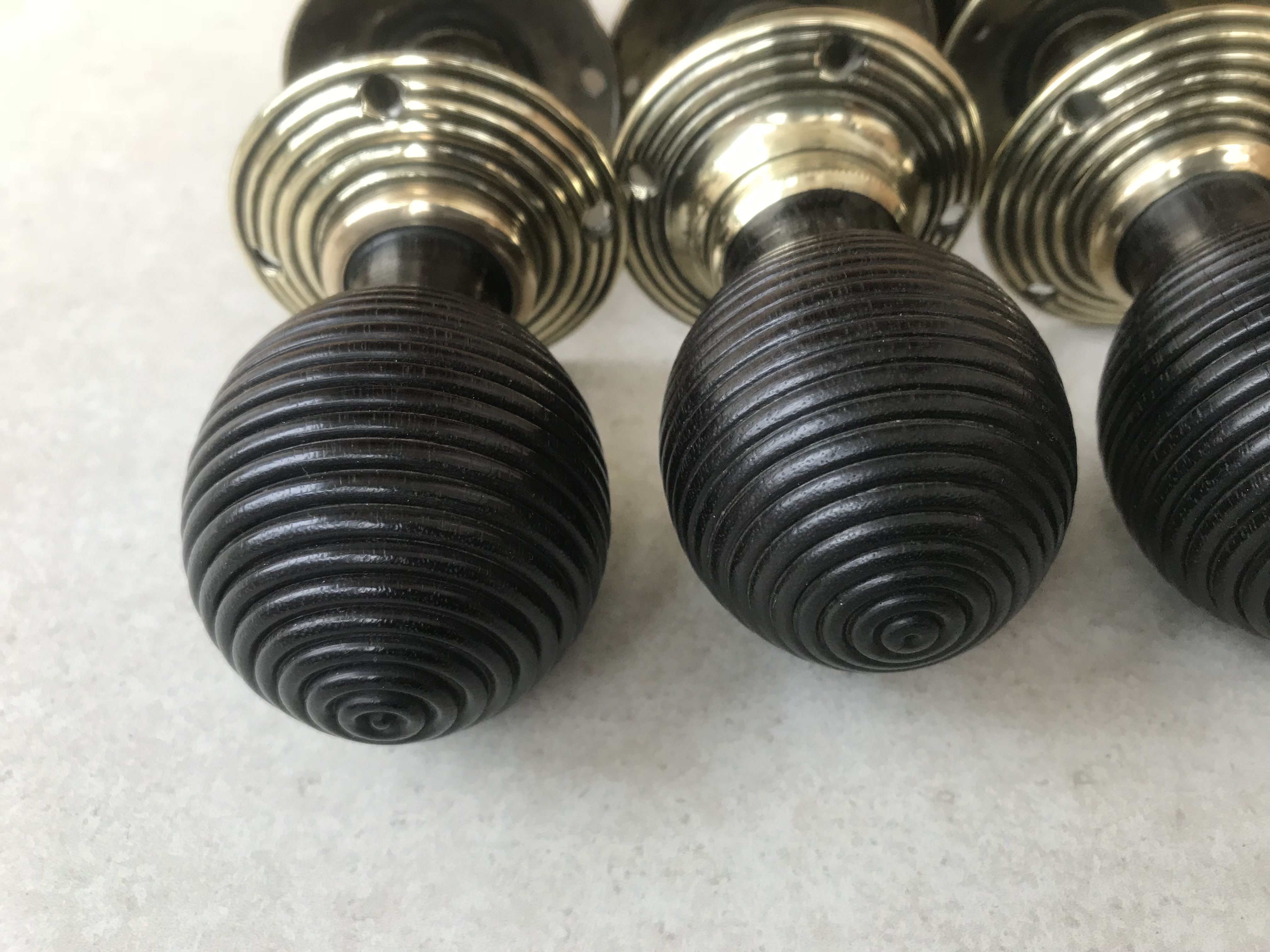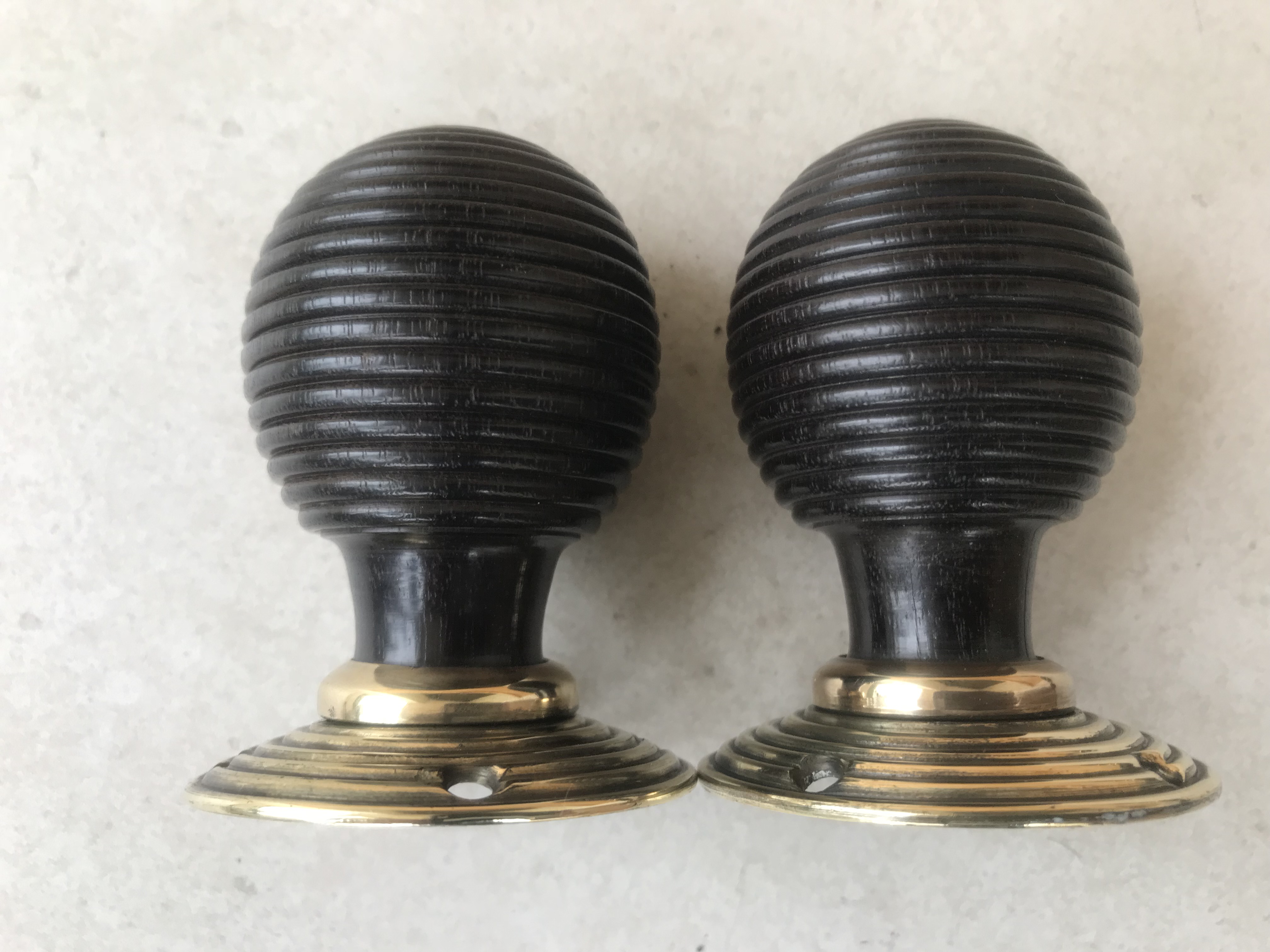 SOLD Original antique ebony beehive door knobs with brass collars. Contact us on 07885 379772 or email below for more information or to buy.