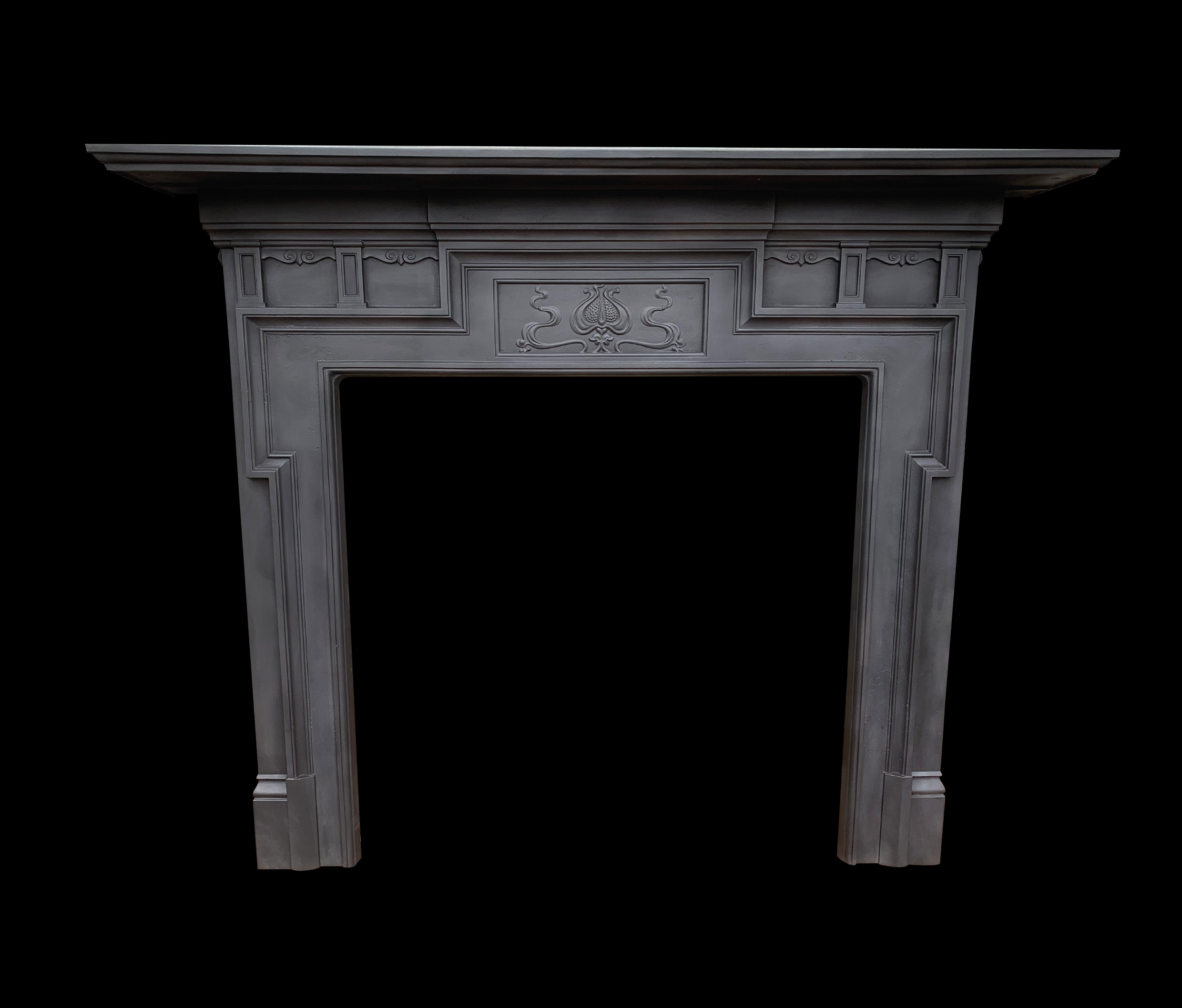 SOLD Original antique Art Nouveau cast iron fireplace surround with beautiful Nouveau stylised flower seed head and flowing foliage to the frieze. Contact us on 07885 379772 or email for more information.