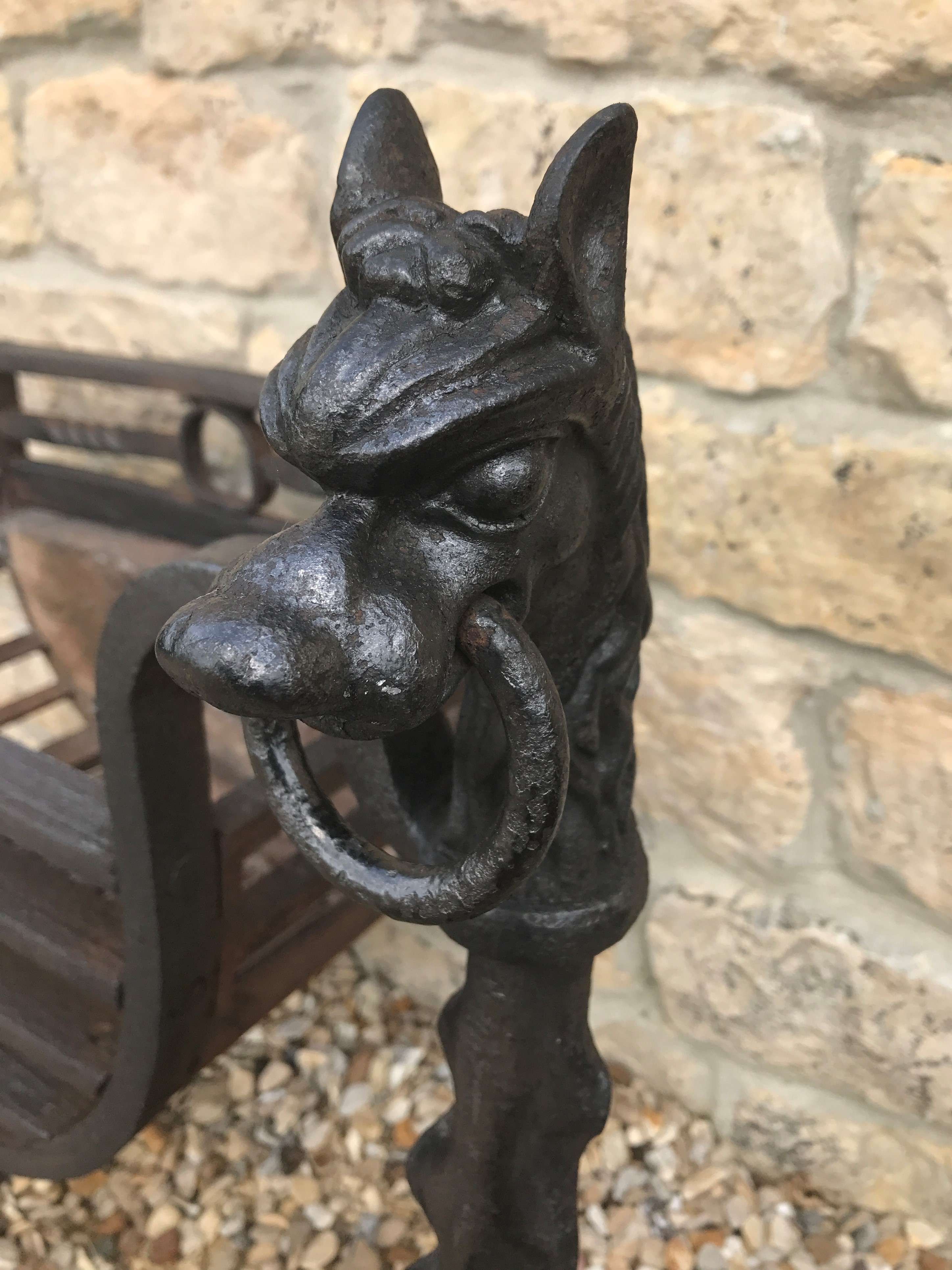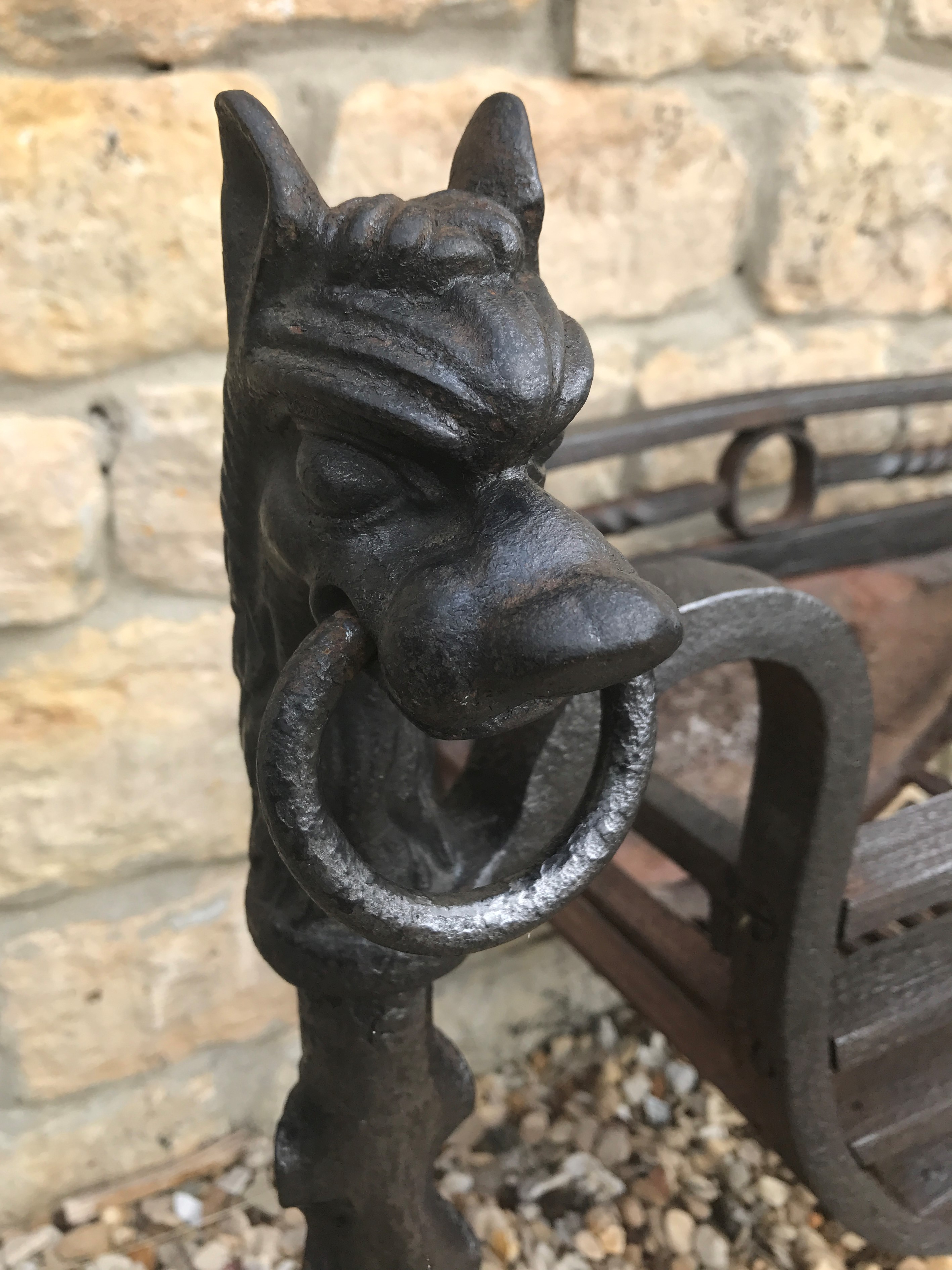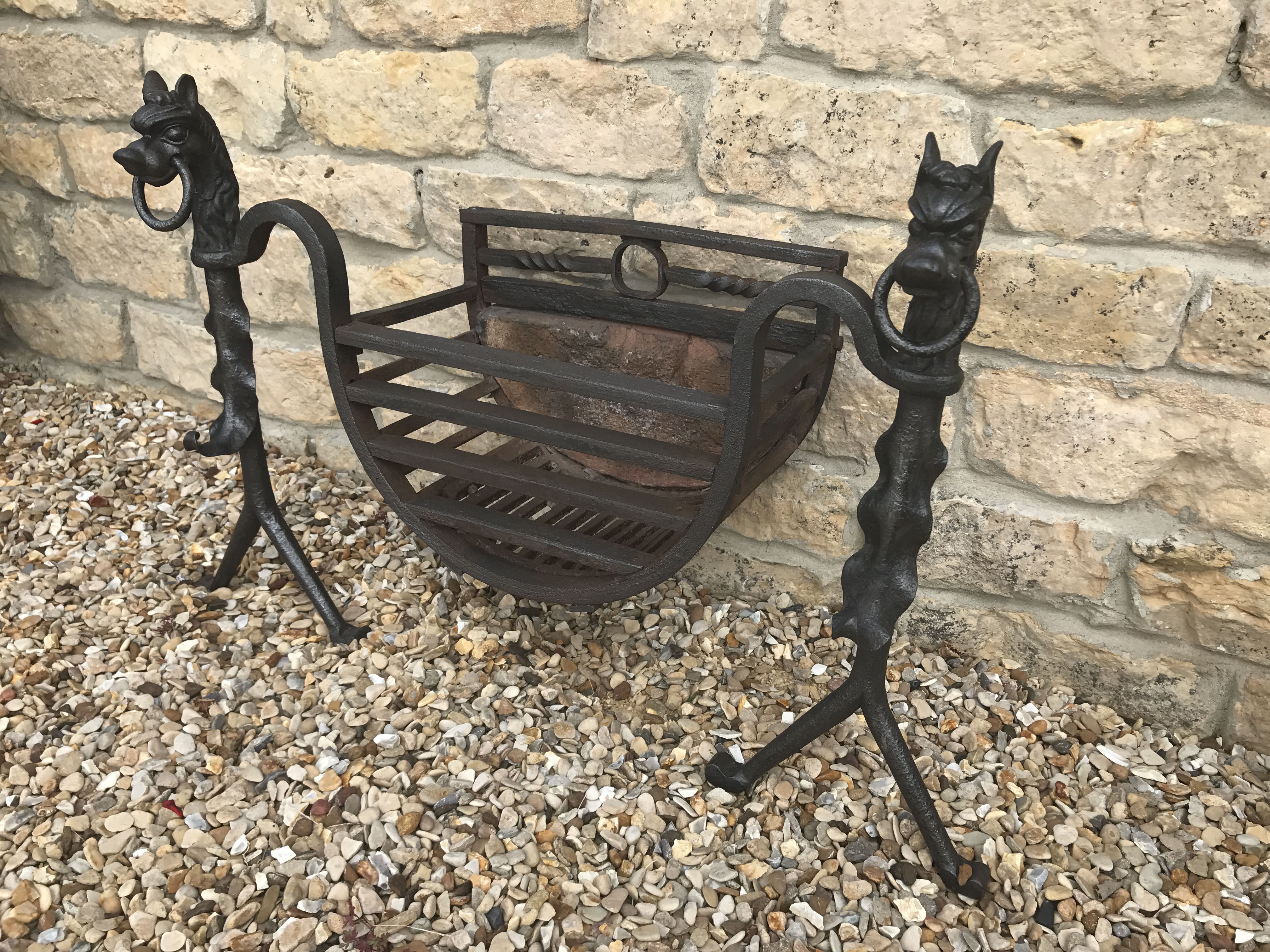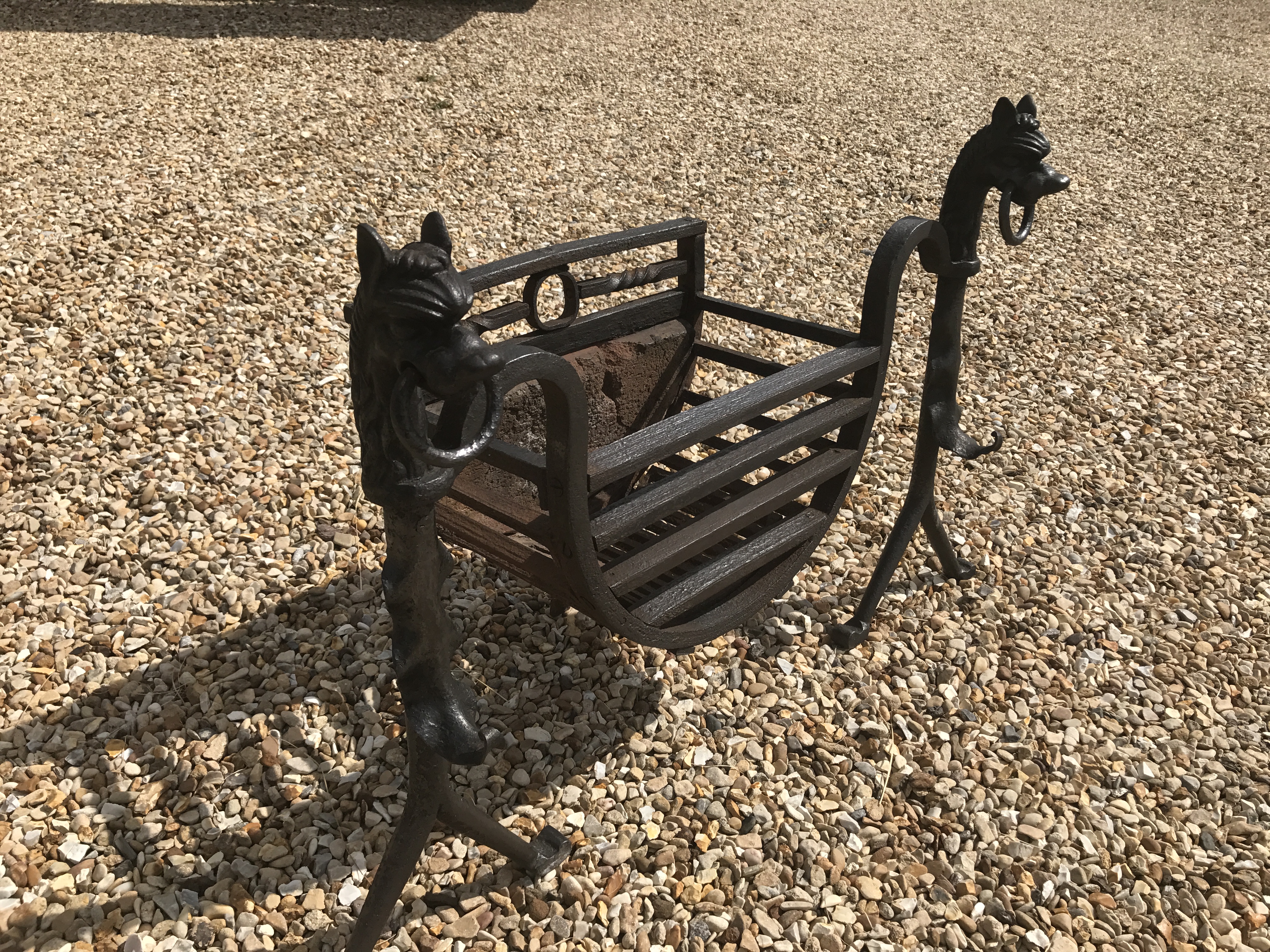 SOLD An original antique wrought iron dog grate in excellent condition. Lovely dog heads holding a chain link. Please contact us on 07885 379772 or email below for more information or to buy.