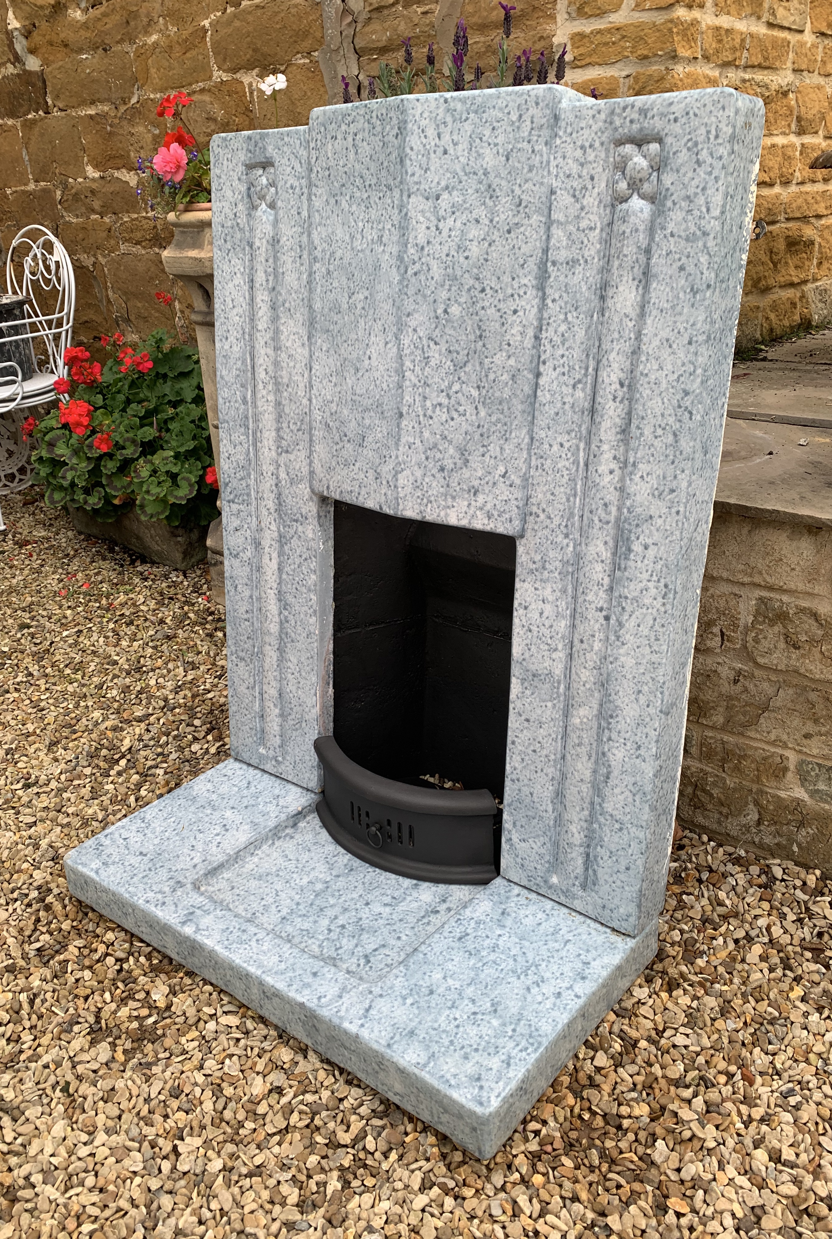 An unusual original antique Art Deco glazed powder blue speckled ceramic fireplace. An iconic Art Deco design. Complete with its original kerb hearth, new clay fire back, grate and front cover. Contact us on 07885 379772 or email below for more information.