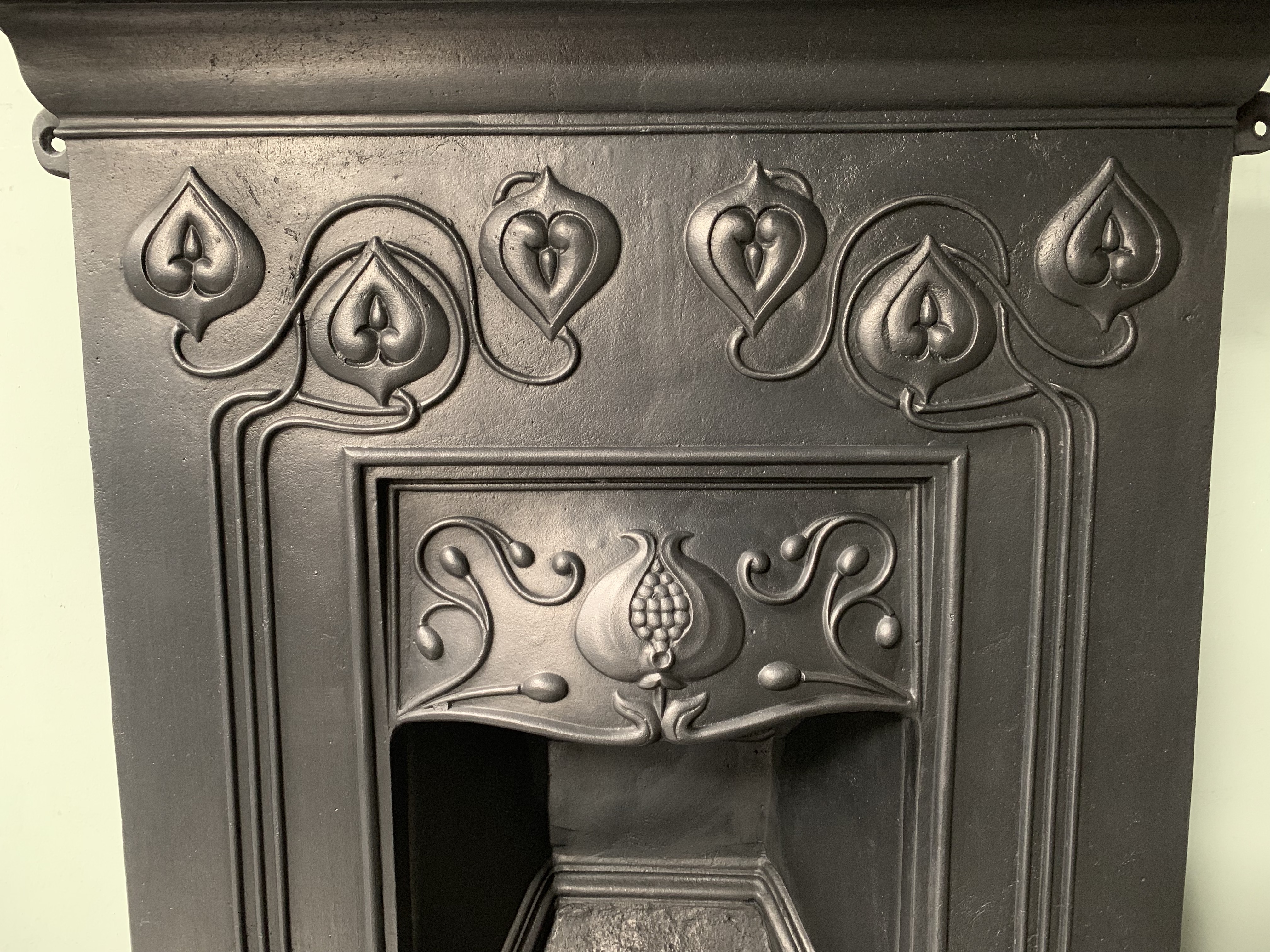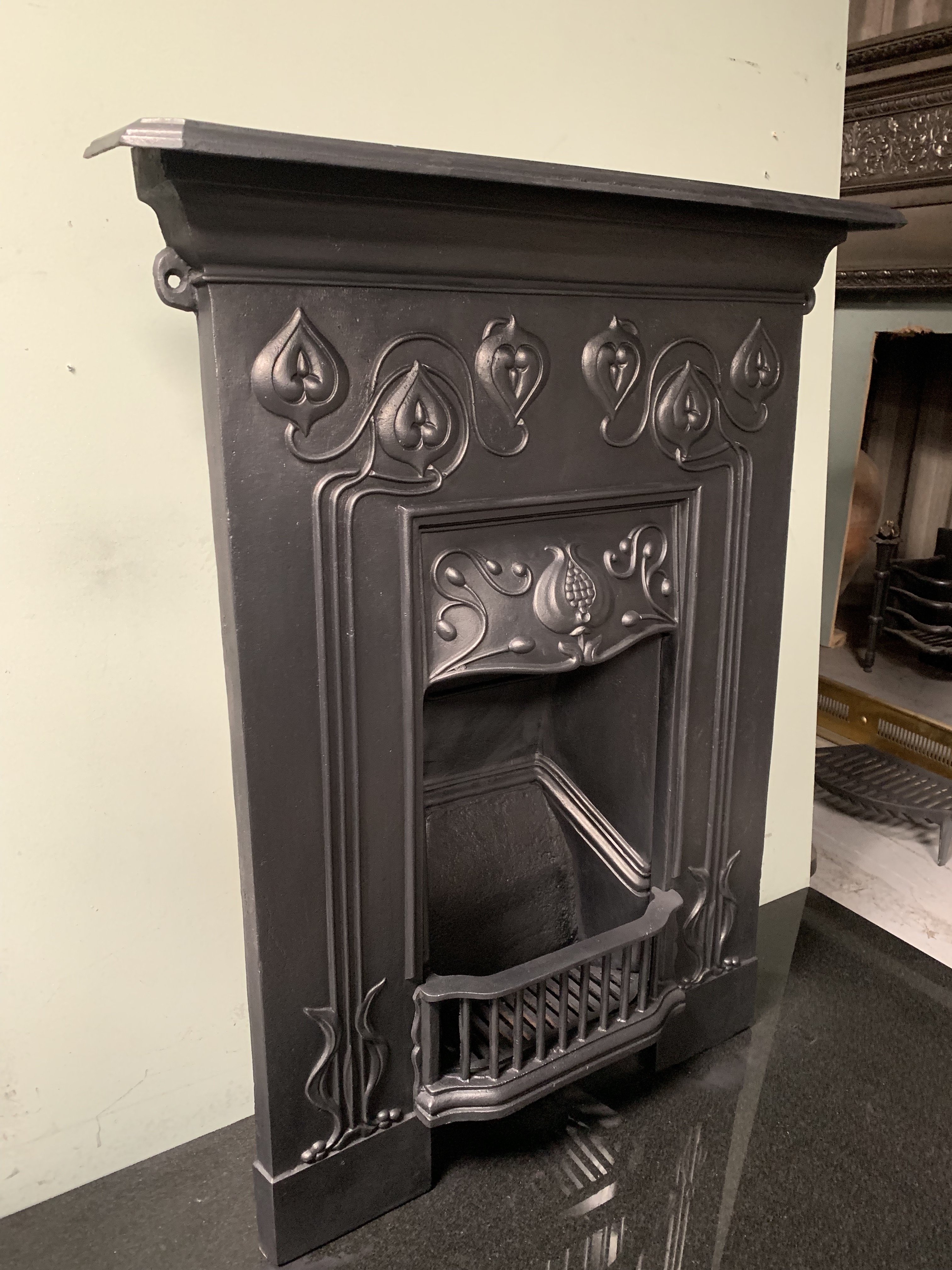 SOLD An original antique Art Nouveau cast iron combination fireplace, complete and ready to install. Contact us on 07885 379772 or message us below for more information.