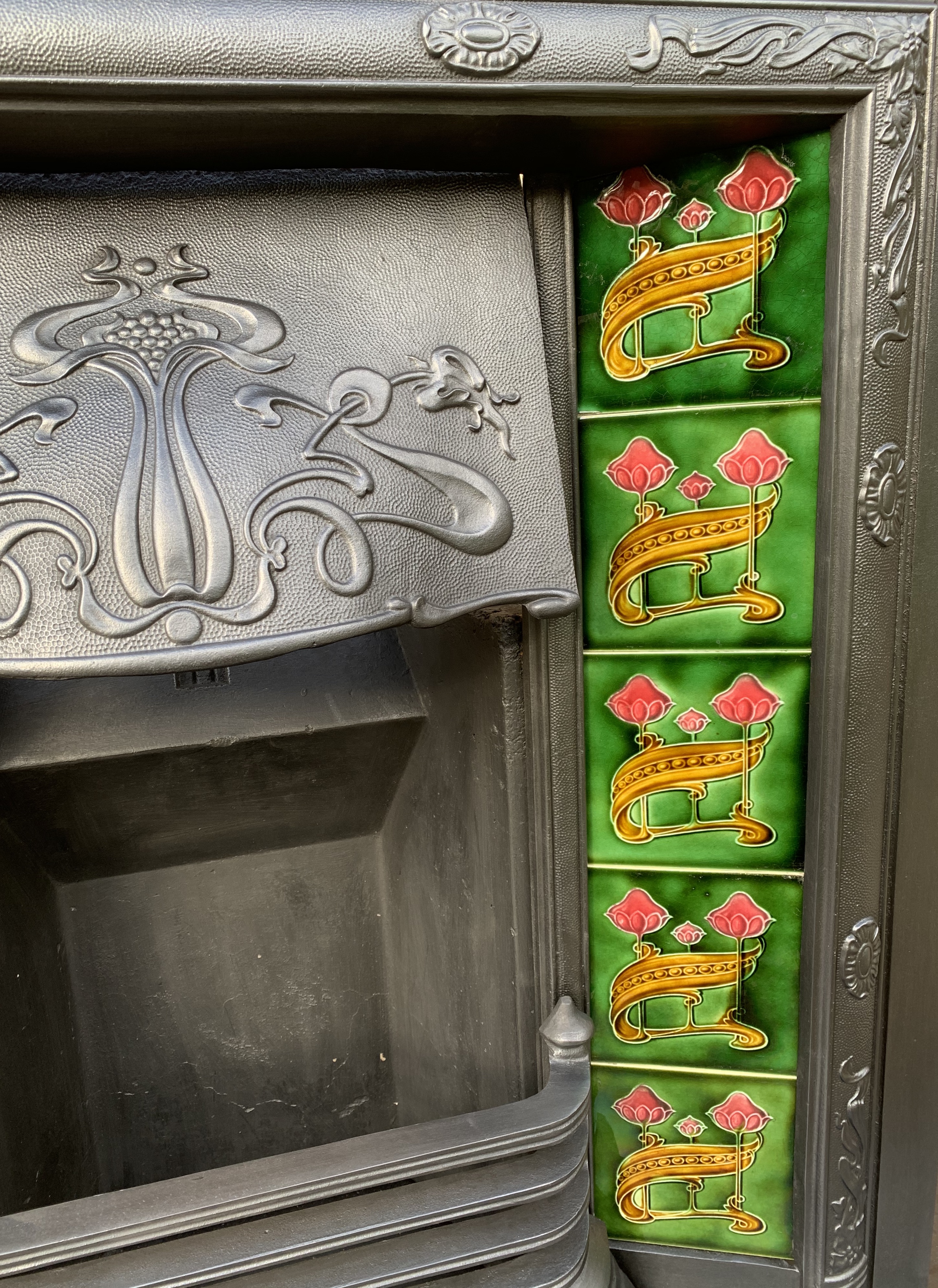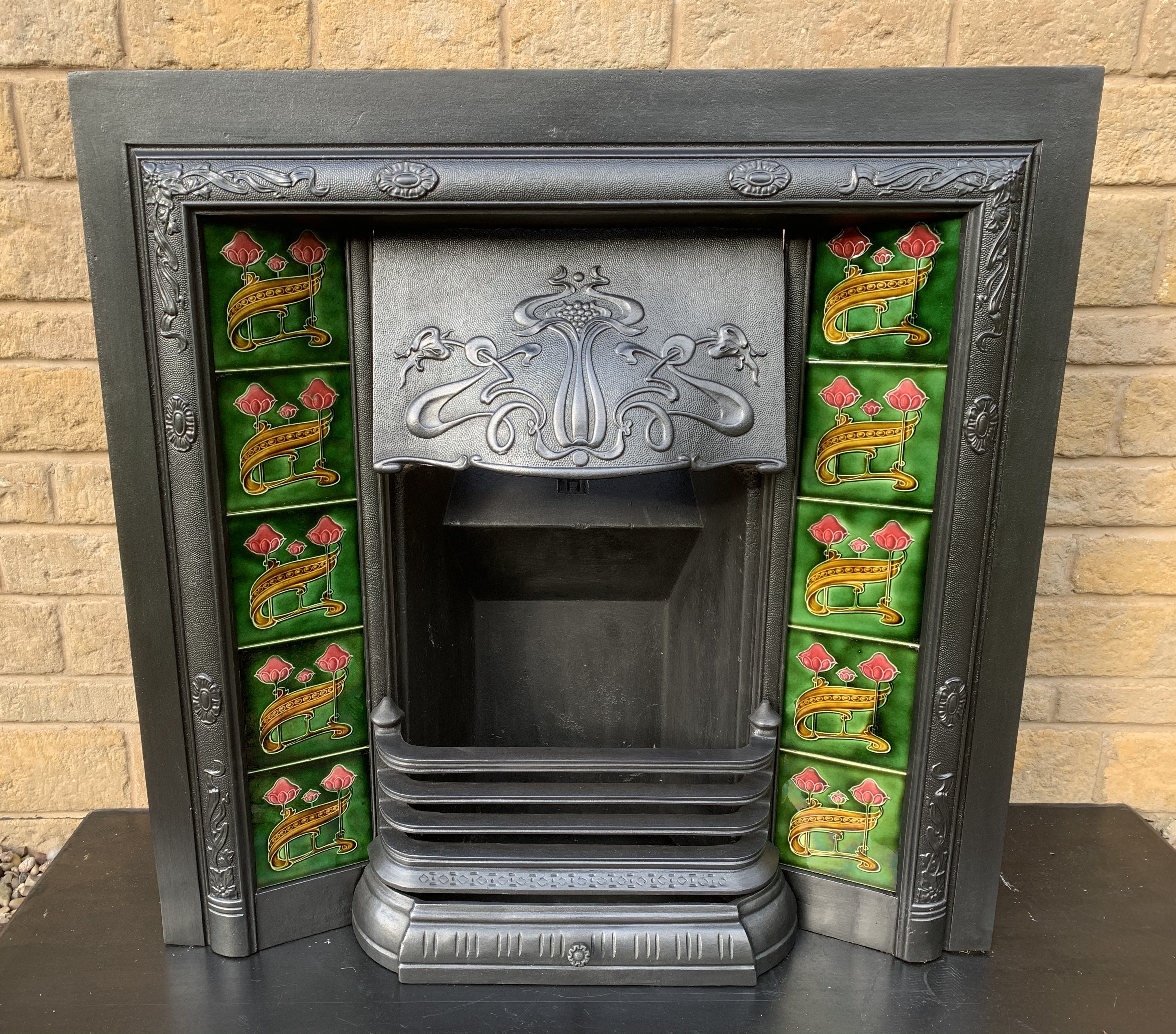 SOLD An original antique Art Nouveau cast iron fireplace insert complete with an original set of 10 Art Nouveau majolica tiles in green, pinky red and gold. This insert will be supplied with a new clay fireback and coal grate. This is shown with an original cast iron surround Ref CS68 which is sold separately. Contact us on 07885 379772 or message us below for more information or to purchase or reserve.