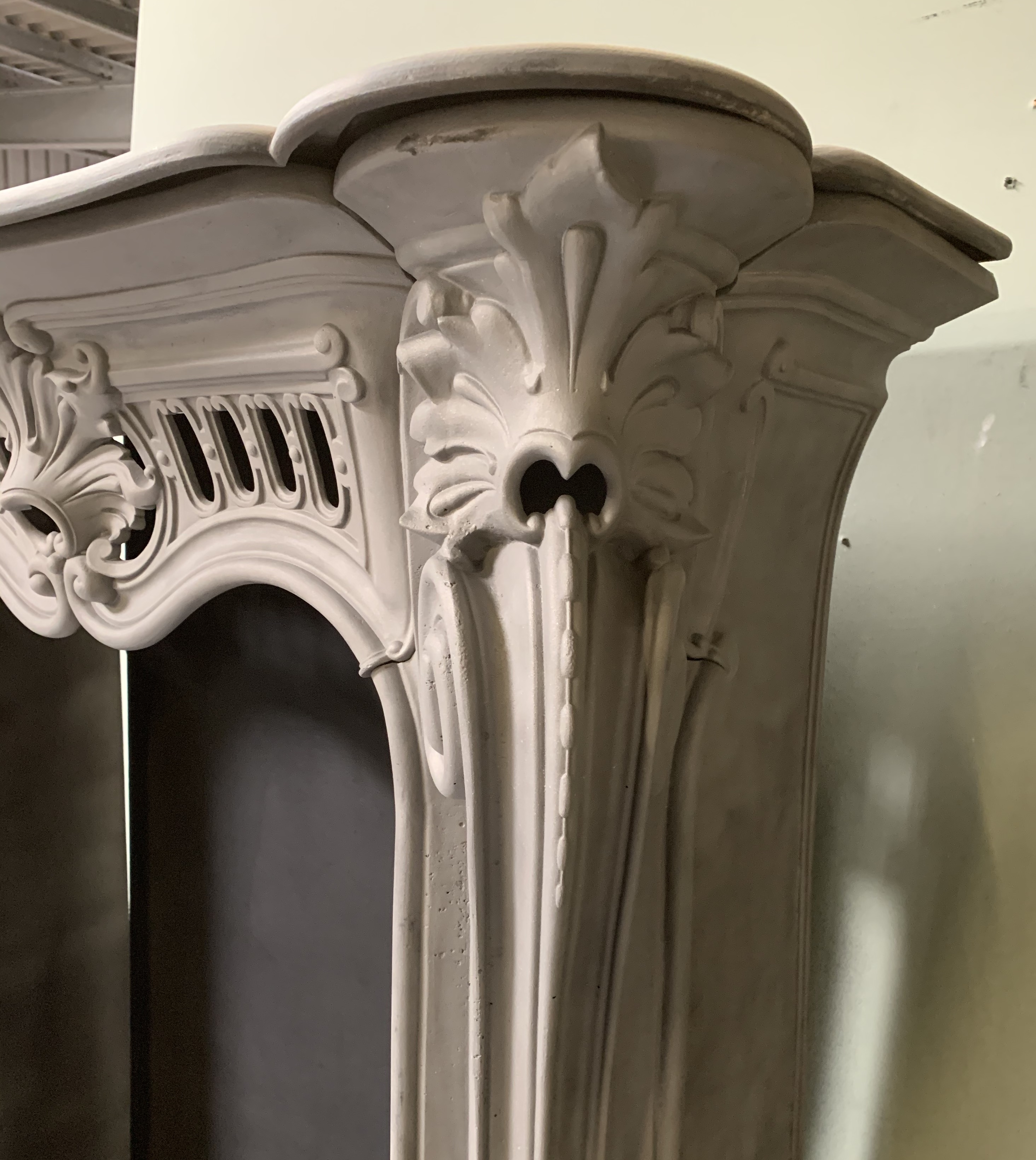 A stunning, original antique French cast iron Louis XV style fireplace with pierced panel, frieze and acanthus leaf foliage. It has a lovely deep and curvaceous breakfront mantle. This fireplace has been stripped and is awaiting re-finishing of your choice! Contact us on 07885 379772 or message us below for more information or to purchase.