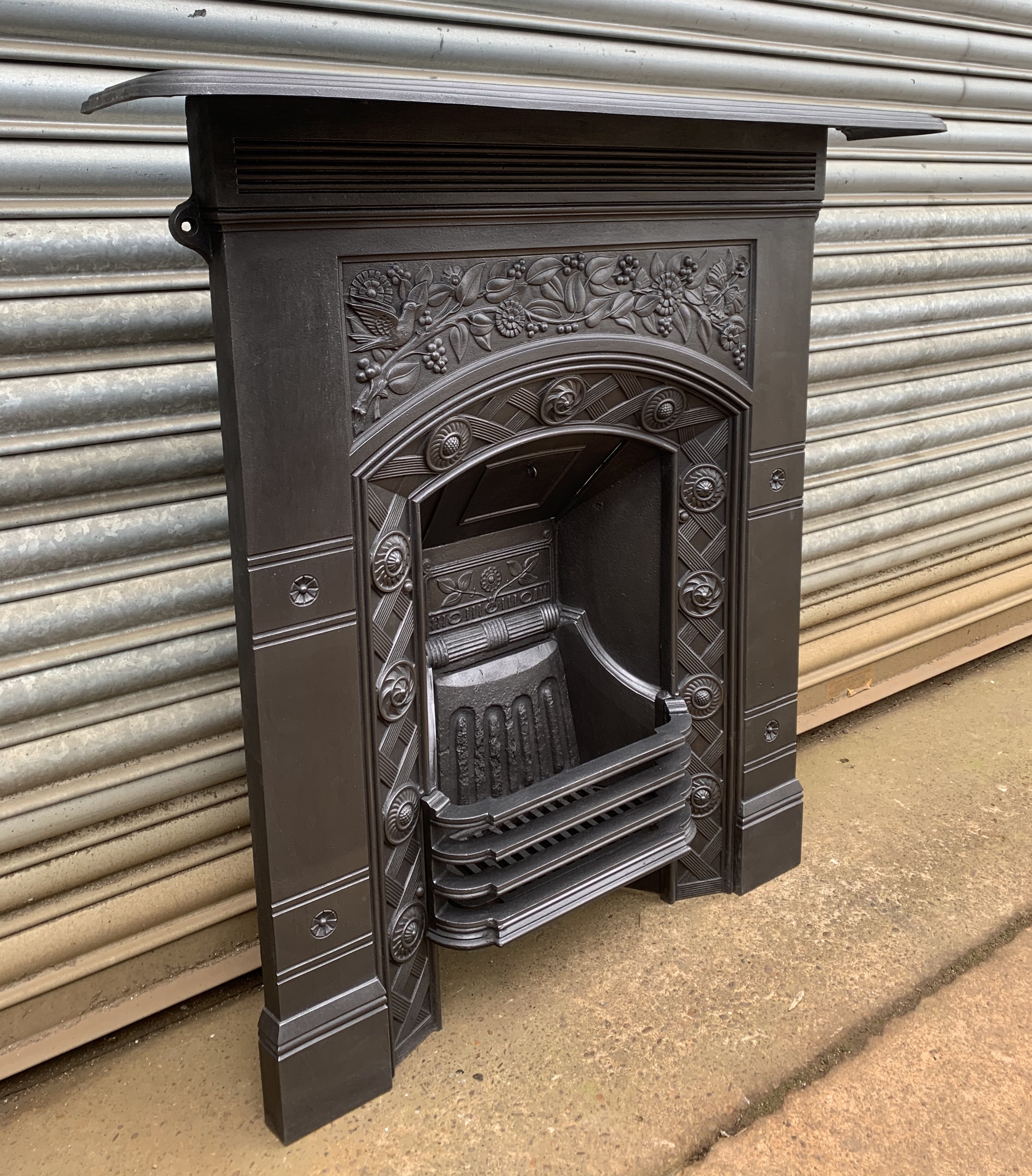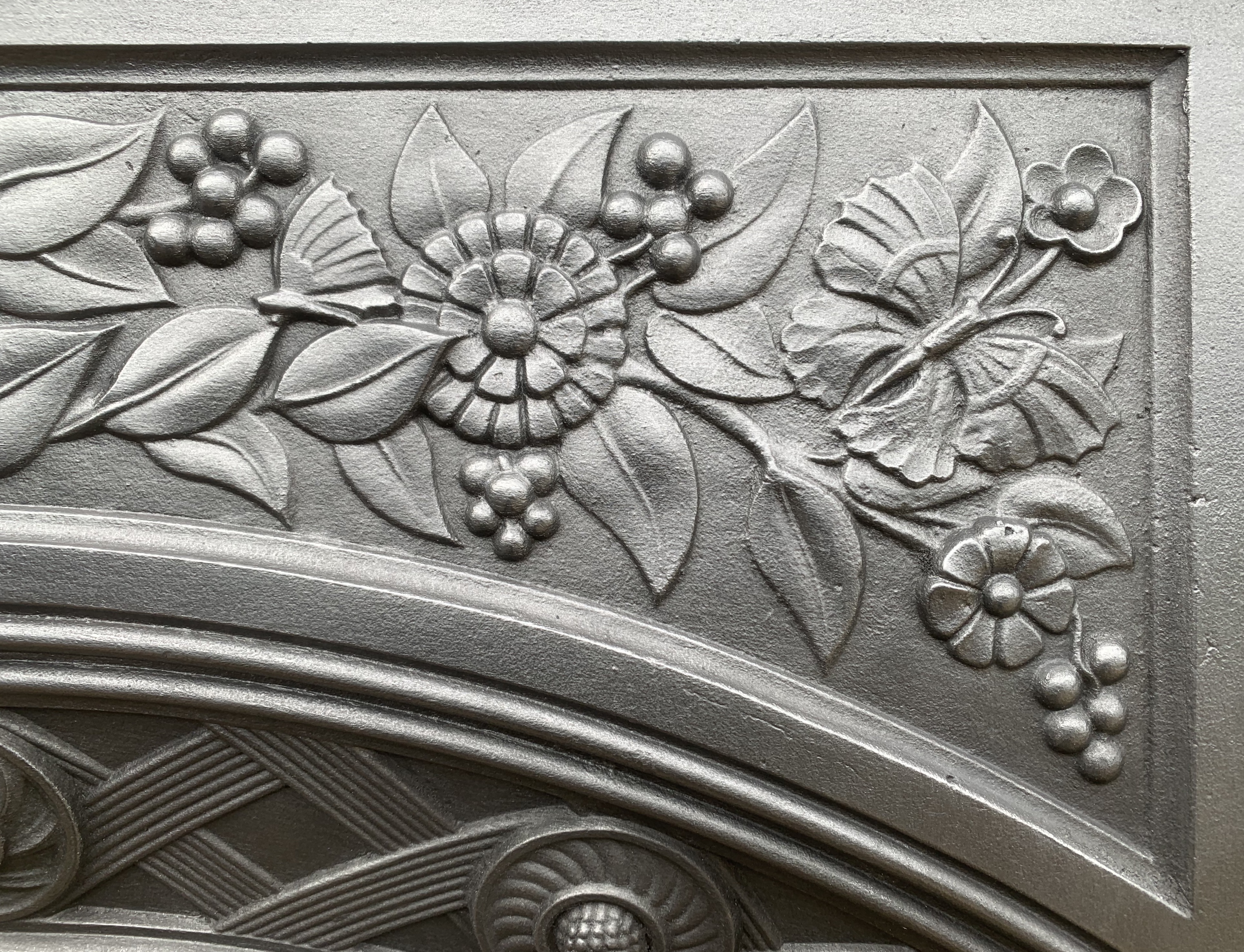 SOLD An original antique Victorian Aesthetic influence cast iron combination fireplace, designed in the manner of Thomas Jeckyll for Barnard, Bishop and Barnard of Norwich c1880. This has stunning ornate flowers and foliage along with birds and butterflies in the casting. This is fully complete with its original ornate back, bars and closure plate ready to install. Contact us on 07885 379772 or message below for more information or to purchase.
