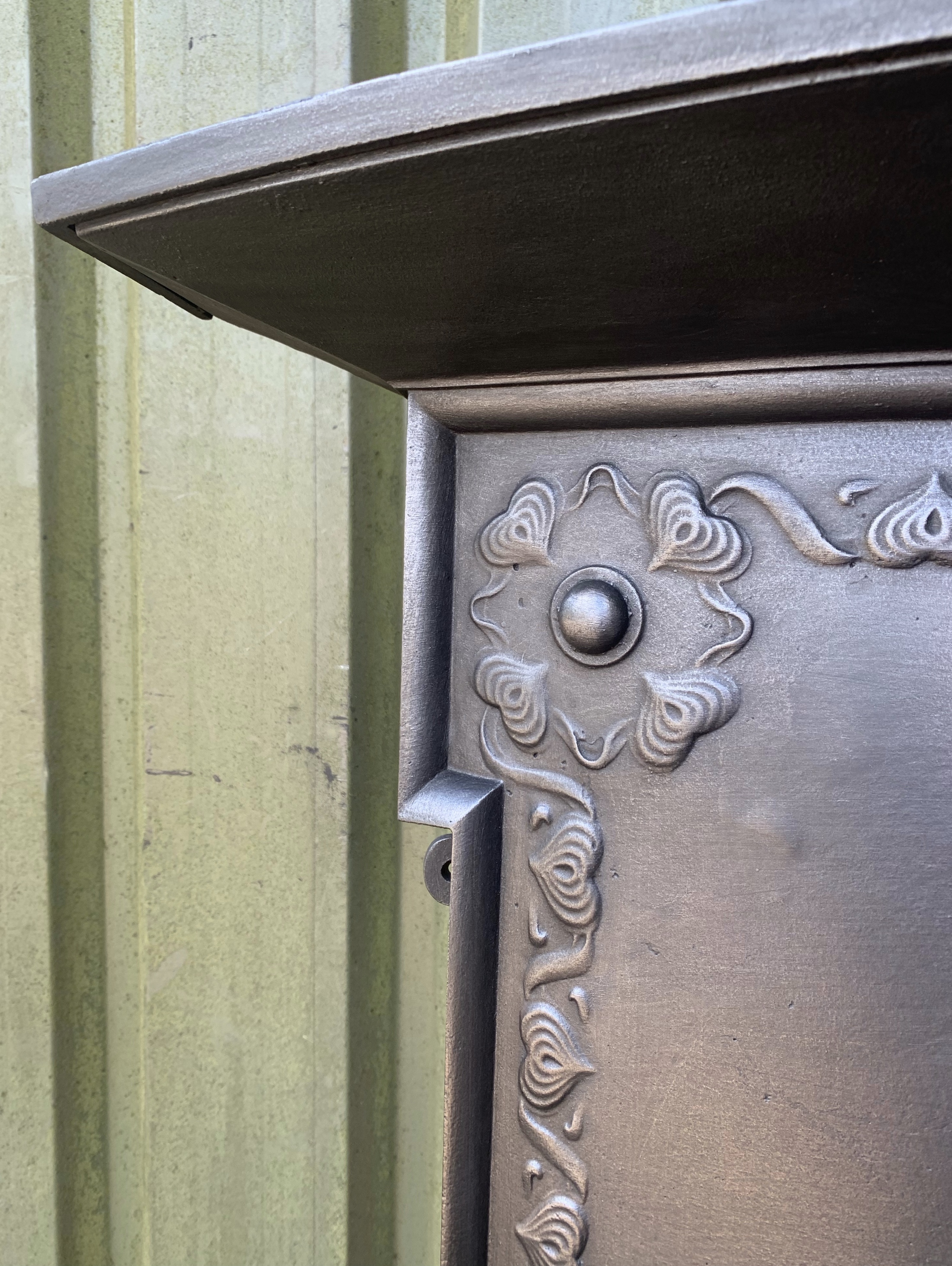 An original antique Arts and Crafts cast iron combination fireplace with crisp and decorative trailing hearts casting and a flared mantle shelf. In the style of CFA Voysey. Quite a rare design by Coalbrookdale. Complete with a clay fire back, original bars and ash cover ready to install. NB the clay back can be removed so that the fireplace can be fitted against a flat wall for decorative purposes. Contact us on 07885 379772 or message below for more information or to purchase.