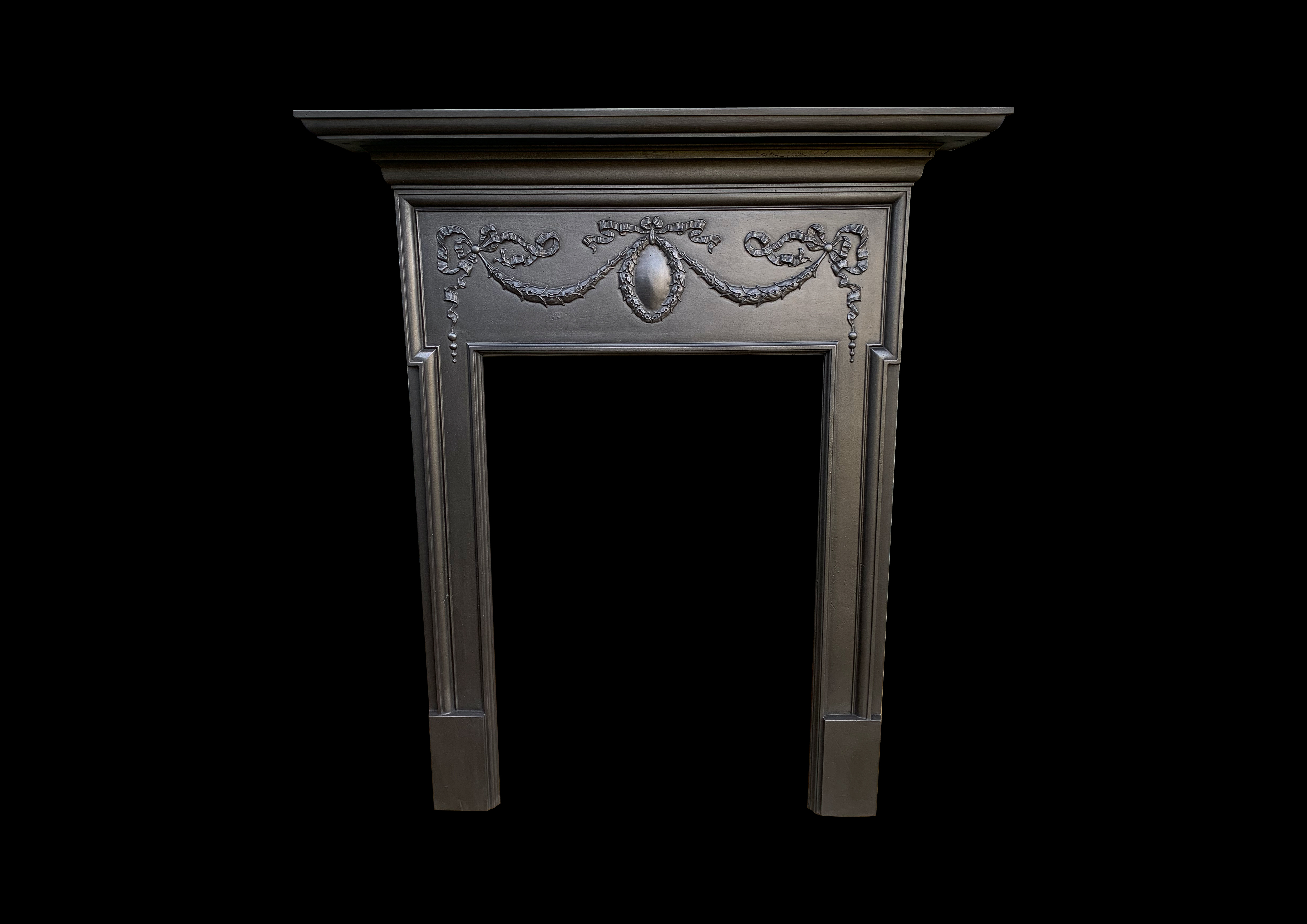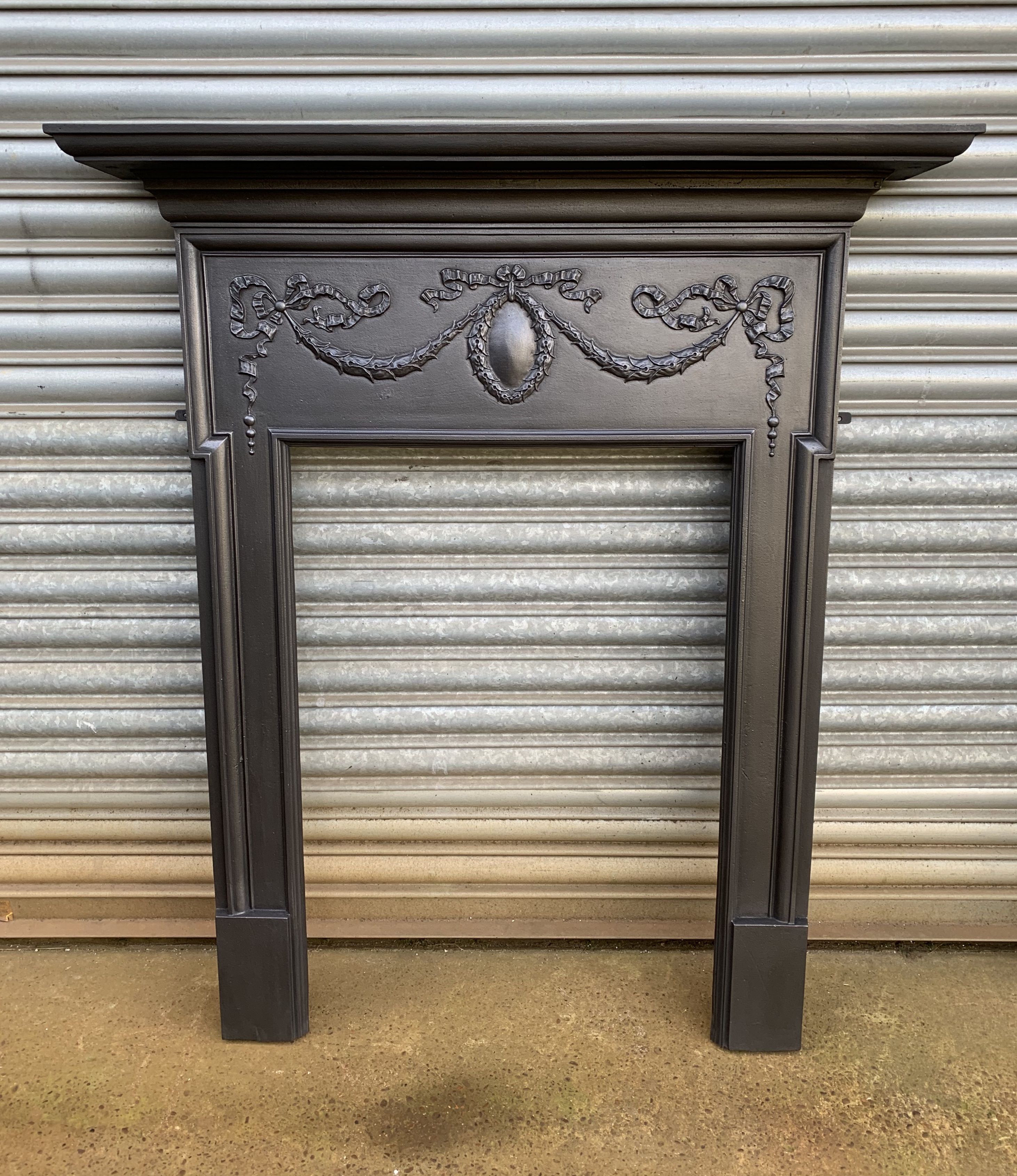 SOLD A beautiful smaller size original Victorian cast iron fire surround with stunning ornate bows and swags across the frieze, and flared mantle shelf. The opening size can be reduced if required - please call to discuss. Would look equally good around a log burner or an original tiled insert. Contact us on 07885 379772 or message below for more information.