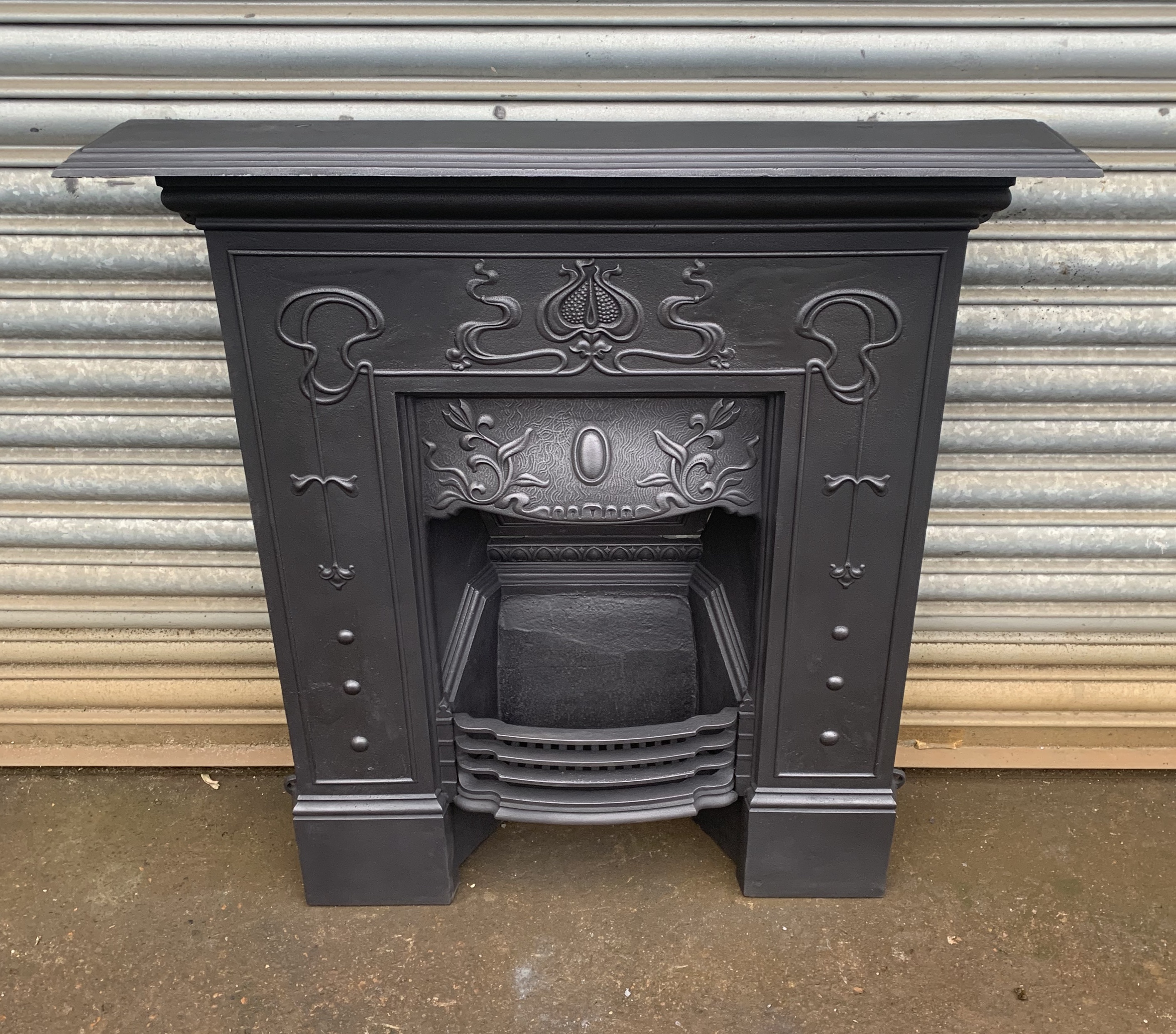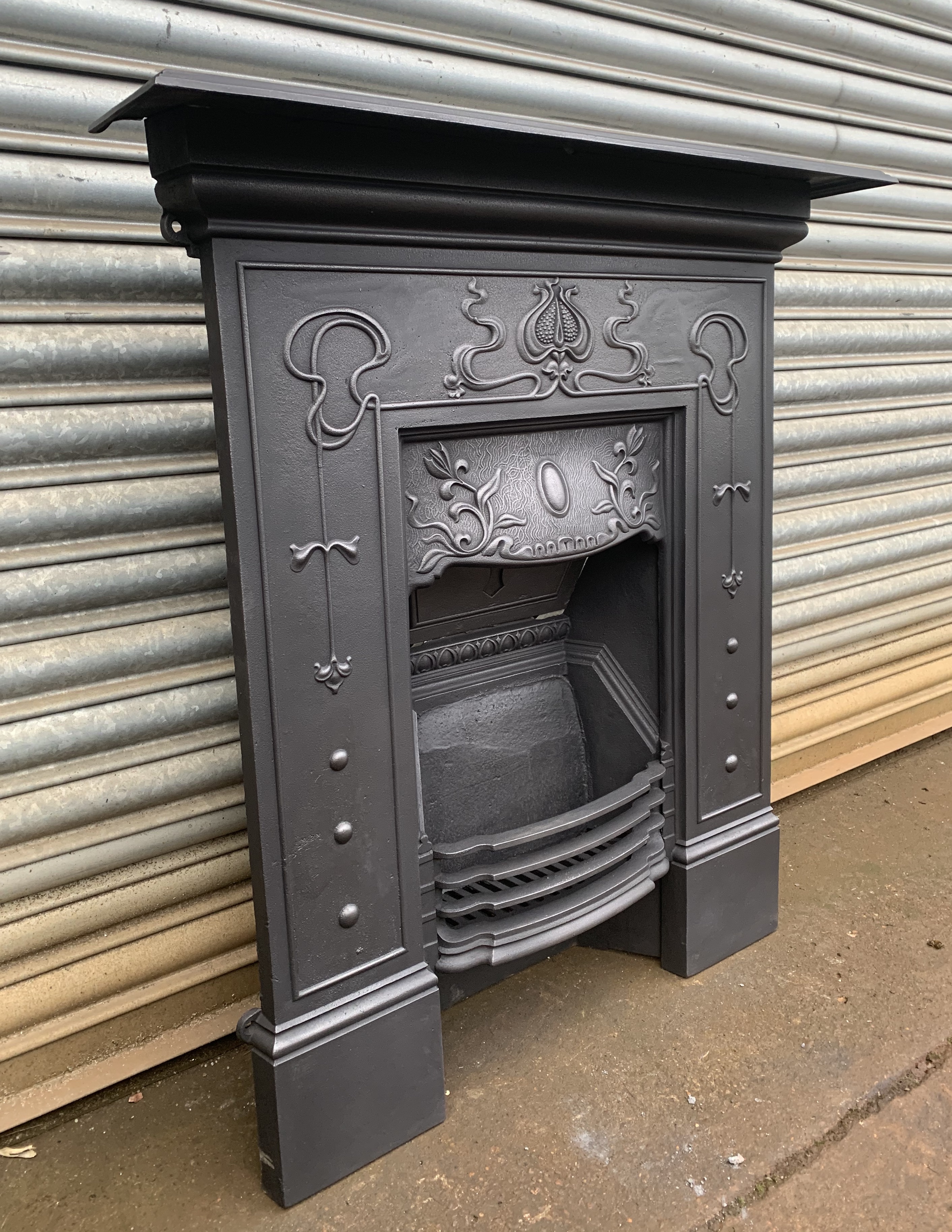 SOLD An original antique Art Nouveau cast iron combination fireplace complete with its back, bars and closure plate ready to install. Contact us on 07885 379772 or message below for more information or to purchase.